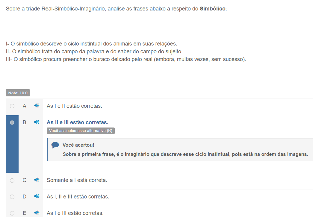 Sobre a tríade Real-Simbólico-Imaginário, analise as frases abaixo a respeito do Simbólico: I- simbólico descreve ciclo instintual dos animais em suas relações. II- simbólico trata do campo da palavra e do saber do campo do sujeito. III- simbólico procura preencher buraco deixado pelo real (embora, muitas vezes, sem sucesso). Nota: 10.0 A As le estão corretas. B As II e III estão corretas. Você assinalou essa alternativa (B) Você acertou! Sobre a primeira frase, é O imaginário que descreve esse ciclo instintual, pois está na ordem das imagens. C Somente a I está correta. D As I, e III estão corretas. E As III estão corretas.
