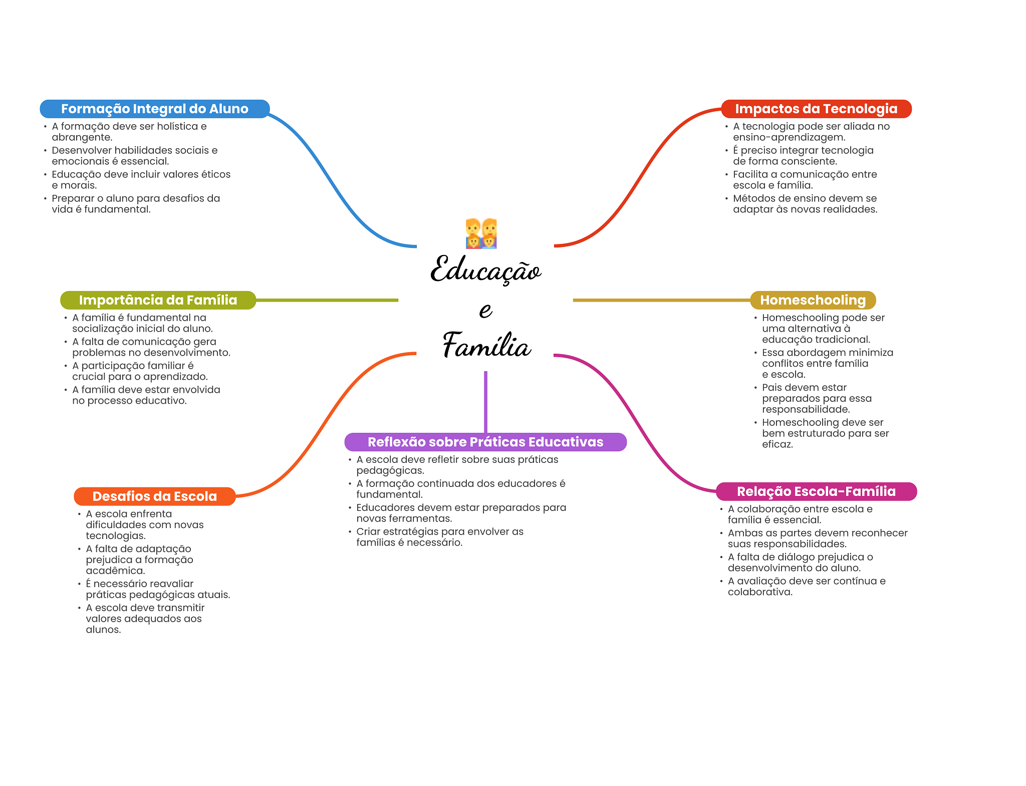 Formação Integral do Aluno Impactos da Tecnologia A formação deve ser holística e A tecnologia pode ser aliada no abrangente. ensino-aprendizagem. Desenvolver habilidades sociais e É preciso integrar tecnologia emocionais é essencial. de forma consciente. Educação deve incluir valores éticos Facilita a comunicação entre e morais. escola e família. Preparar aluno para desafios da Métodos de ensino devem se vida é fundamental. adaptar às novas realidades. Educação Importância da Família Homeschooling A família é fundamental na e Homeschooling pode ser socialização inicial do aluno. uma alternativa à A falta de comunicação gera Família educação tradicional. problemas no desenvolvimento. Essa abordagem minimiza A participação familiar é conflitos entre família crucial para aprendizado. e escola. A família deve estar envolvida Pais devem estar no processo educativo. preparados para essa responsabilidade. Homeschooling deve ser bem estruturado para ser Reflexão sobre Práticas Educativas eficaz. A escola deve refletir sobre suas práticas pedagógicas. A formação continuada dos educadores é Desafios da Escola fundamental. Relação Escola-Família A escola enfrenta Educadores devem estar preparados para A colaboração entre escola e novas ferramentas. dificuldades com novas família é essencial. tecnologias. Criar estratégias para envolver as Ambas as partes devem reconhecer famílias é necessário. A falta de adaptação suas responsabilidades. prejudica a formação A falta de diálogo prejudica O acadêmica. desenvolvimento do aluno. É necessário reavaliar A avaliação deve ser contínua e práticas pedagógicas atuais. colaborativa. A escola deve transmitir valores adequados aos alunos.