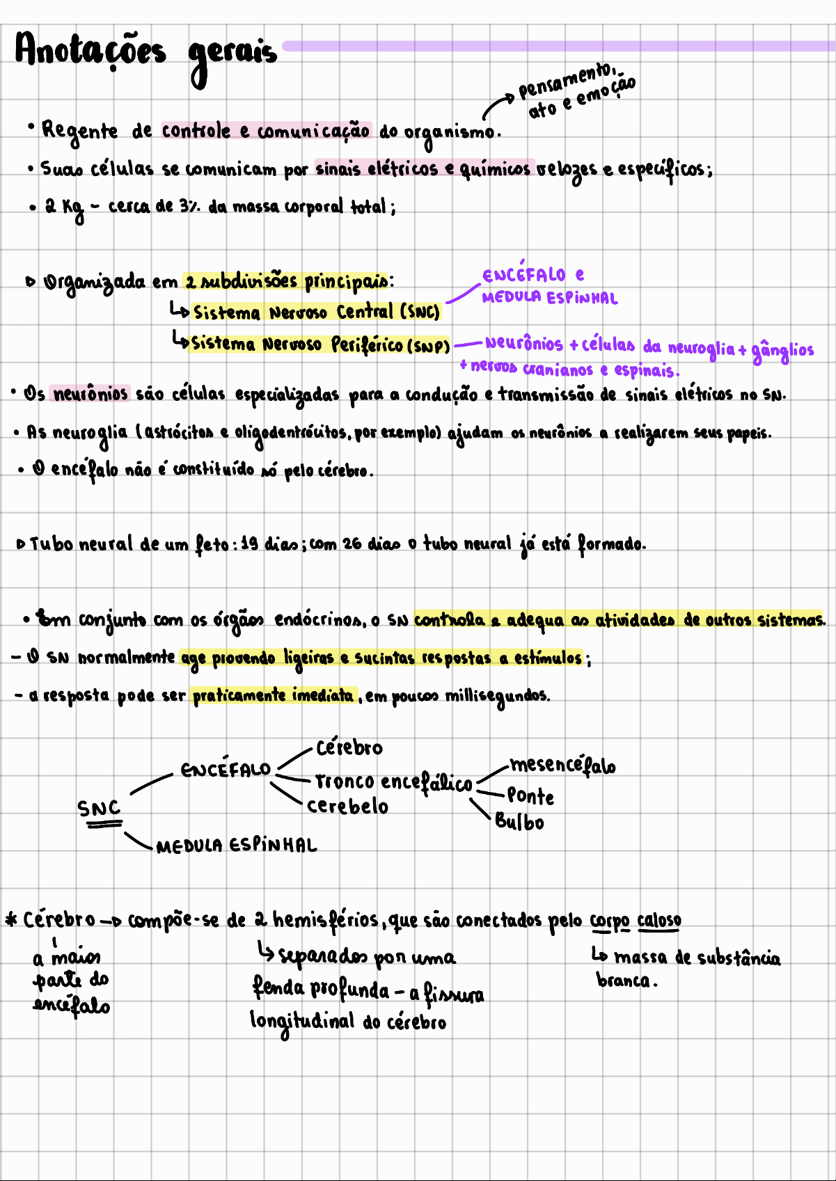 Anotações gerais ato e Regente de controle e comunicação do organismo. Suas células se comunicam por sinais elétricos e químicos velozes e específicos; 2 kg - cerca de 3% da massa corporal total; Organizada em 2 subdivisões principais: ENCÉFALO e MEDULA Sistema Nervoso Central (SNC) Nervoso Periférico (SNP) + células da neuroglia + gânglios nervos cranianos e espinais. Os neurônios são células especializadas para a condução e transmissão de sinais elétricos no SN. As neuroglia (astrócitos e por exemplo) ajudam os neurônios a realizarem seus papeis. encefalo não é constituído só pelo cérebro. Tubo neural de um feto: 19 dias; com 26 dias tubo neural já está formado. conjunto com os órgãos endócrinos, SN controla e adequa as atividades de outros sistemas. - SN normalmente age provendo ligeiras e sucintas respostas a estímulos; - a resposta pode ser praticamente imediata, em poucos millisegundos. cérebro ENCÉFALO mesencéfalo Tronco encefalico cerebelo ponte SNC Bulbo MEDULA ESPINHAL compõe-se de 2 hemisférios, que são conectados pelo corpo caloso a separados por uma massa de substância parte do fenda profunda - a fissura branca. longitudinal do cérebroDiencéfalo Mesencéfalo Tronco ncefálico Ponte Bulbo Cerebelo - Cerebelo Cérebro Tronco Encefálico Cerebelo Medula Espinhal