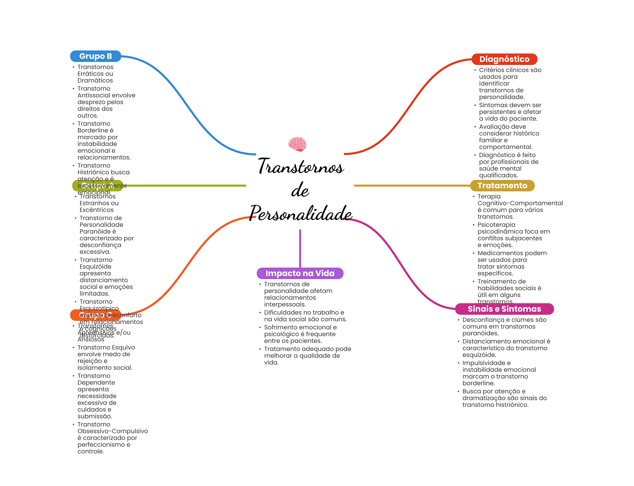 Grupo Diagnóstico Transtornos Critérios clínicos são Erráticos ou Dramáticos usados para identificar Transtorno transtornos de Antissocial envolve personalidade. desprezo pelos Sintomas devem ser direitos dos persistentes e afetar outros. a vida do paciente. Transtorno Borderline é Avaliação deve considerar histórico marcado por familiar e instabilidade emocional e comportamental. relacionamentos. Diagnóstico é feito Transtorno Transtornos por profissionais de saúde mental Histriônico busca atenção e é qualificados. mente emocional. de Tratamento Transtornos Terapia Estranhos ou Cognitivo-Comportamental Excêntricos Transtorno de Personalidade é comum para vários transtornos. Personalidade Psicoterapia Paranóide é psicodinâmica foca em caracterizado por conflitos subjacentes desconfiança e emoções. excessiva. Medicamentos podem Transtorno ser usados para Esquizóide tratar sintomas apresenta Impacto na Vida específicos. distanciamento Transtornos de Treinamento de social e emoções habilidades sociais é limitadas. personalidade afetam relacionamentos útil em alguns Transtorno transtornos interpessoais. Esquizotípico Sinais e Sintomas envolve desconforto Dificuldades no trabalho e em na vida social são comuns. Desconfiança e ciúmes são Sofrimento emocional e comuns em transtornos e/ou psicológico é frequente paranóides. Ansiosos entre pacientes. Distanciamento emocional é Transtorno Esquivo Tratamento adequado pode característico do transtorno envolve medo de melhorar a qualidade de esquizóide. rejeição e vida. Impulsividade e isolamento social. instabilidade emocional Transtorno marcam transtorno Dependente borderline. apresenta Busca por atenção e necessidade dramatização são sinais do excessiva de transtorno histriônico. cuidados e submissão. Transtorno Obsessivo-Compulsivo é caracterizado por perfeccionismo e controle.
