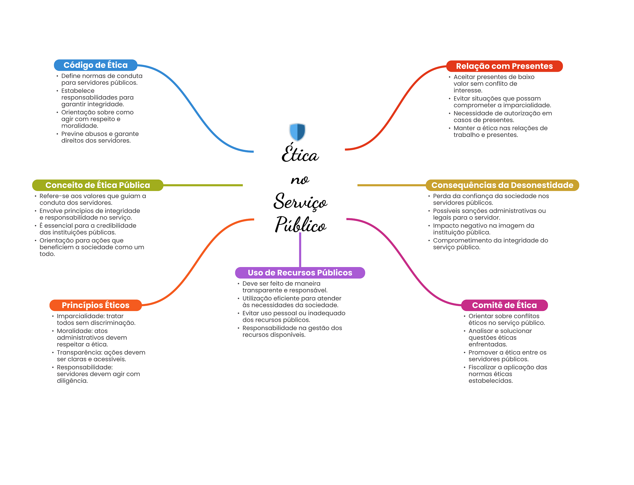 Código de Ética Relação com Presentes Define normas de conduta Aceitar presentes de baixo para servidores públicos. valor sem conflito de Estabelece interesse. responsabilidades para Evitar situações que possam garantir integridade. comprometer a imparcialidade. Orientação sobre como Necessidade de autorização em agir com respeito e casos de presentes. moralidade. Manter a ética nas relações de Previne abusos e garante trabalho e presentes. direitos dos servidores. Ética Conceito de Ética Pública no Consequências da Desonestidade Refere-se aos valores que guiam a conduta dos servidores. Serviço Perda da confiança da sociedade nos servidores públicos. Envolve princípios de integridade Possíveis sanções administrativas ou e responsabilidade no serviço. É essencial para a credibilidade Público legais para O servidor. Impacto negativo na imagem da das instituições públicas. instituição pública. Orientação para ações que Comprometimento da integridade do beneficiem a sociedade como um serviço público. todo. Uso de Recursos Públicos Deve ser feito de maneira transparente e responsável. Utilização eficiente para atender Princípios Éticos às necessidades da sociedade. Comitê de Ética Imparcialidade: tratar Evitar uso pessoal ou inadequado Orientar sobre conflitos todos sem discriminação. dos recursos públicos. éticos no serviço público. Moralidade: atos Responsabilidade na gestão dos Analisar e solucionar administrativos devem recursos disponíveis. questões éticas respeitar a ética. enfrentadas. Transparência: ações devem Promover a ética entre OS ser claras e acessíveis. servidores públicos. Responsabilidade: Fiscalizar a aplicação das servidores devem agir com normas éticas diligência. estabelecidas.