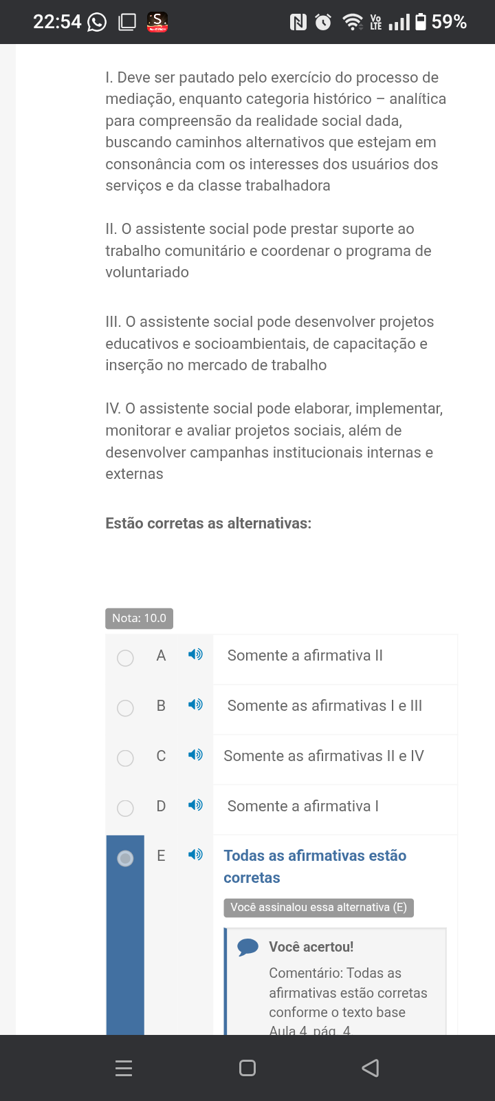 22:54 S N 59% I. Deve ser pautado pelo exercício do processo de mediação, enquanto categoria histórico analítica para compreensão da realidade social dada, buscando caminhos alternativos que estejam em consonância com os interesses dos usuários dos serviços e da classe trabalhadora II. 0 assistente social pode prestar suporte ao trabalho comunitário e coordenar programa de voluntariado III. 0 assistente social pode desenvolver projetos educativos e socioambientais, de capacitação e inserção no mercado de trabalho IV. 0 assistente social pode elaborar, implementar, monitorar e avaliar projetos sociais, além de desenvolver campanhas institucionais internas e externas Estão corretas as alternativas: Nota: 10.0 A Somente a afirmativa B Somente as afirmativas I e III c Somente as afirmativas e IV D Somente a afirmativa E Todas as afirmativas estão corretas Você assinalou essa alternativa (E) Você acertou! Comentário: Todas as afirmativas estão corretas conforme texto base Aula 4 4