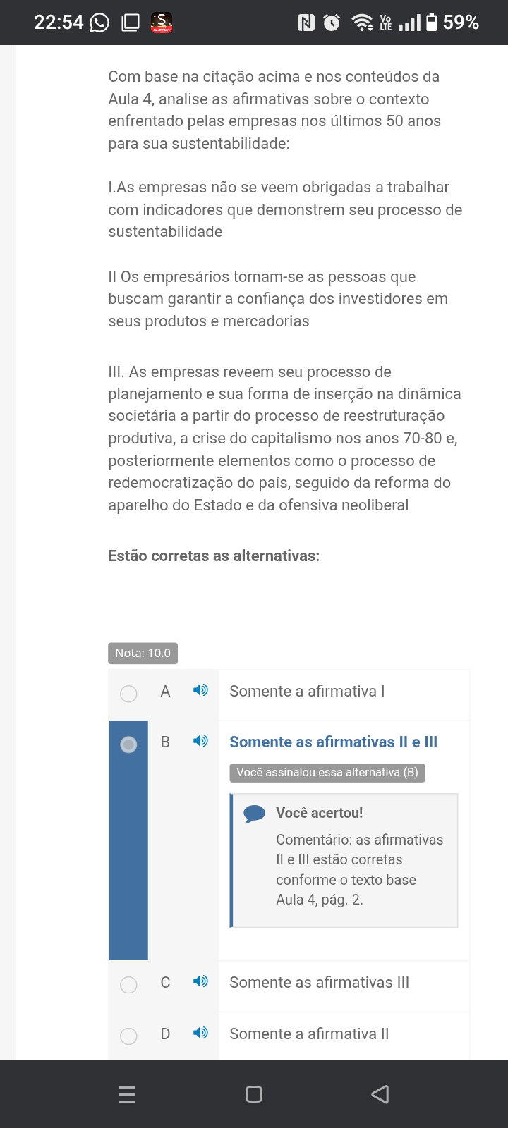 22:54 S N 59% Com base na citação acima e nos conteúdos da Aula 4, analise as afirmativas sobre contexto enfrentado pelas empresas nos últimos 50 anos para sua sustentabilidade: I.As empresas não se veem obrigadas a trabalhar com indicadores que demonstrem seu processo de sustentabilidade Os empresários tornam-se as pessoas que buscam garantir a confiança dos investidores em seus produtos e mercadorias III. As empresas reveem seu processo de planejamento e sua forma de inserção na dinâmica societária a partir do processo de reestruturação produtiva, a crise do capitalismo nos anos 70-80 e, posteriormente elementos como processo de redemocratização do país, seguido da reforma do aparelho do Estado e da ofensiva neoliberal Estão corretas as alternativas: Nota: 10.0 A Somente a afirmativa Somente as afirmativas e III Você assinalou essa alternativa (B) Você acertou! Comentário: as afirmativas e III estão corretas conforme texto base Aula 4, pág. 2. c Somente as afirmativas III D Somente a afirmativa