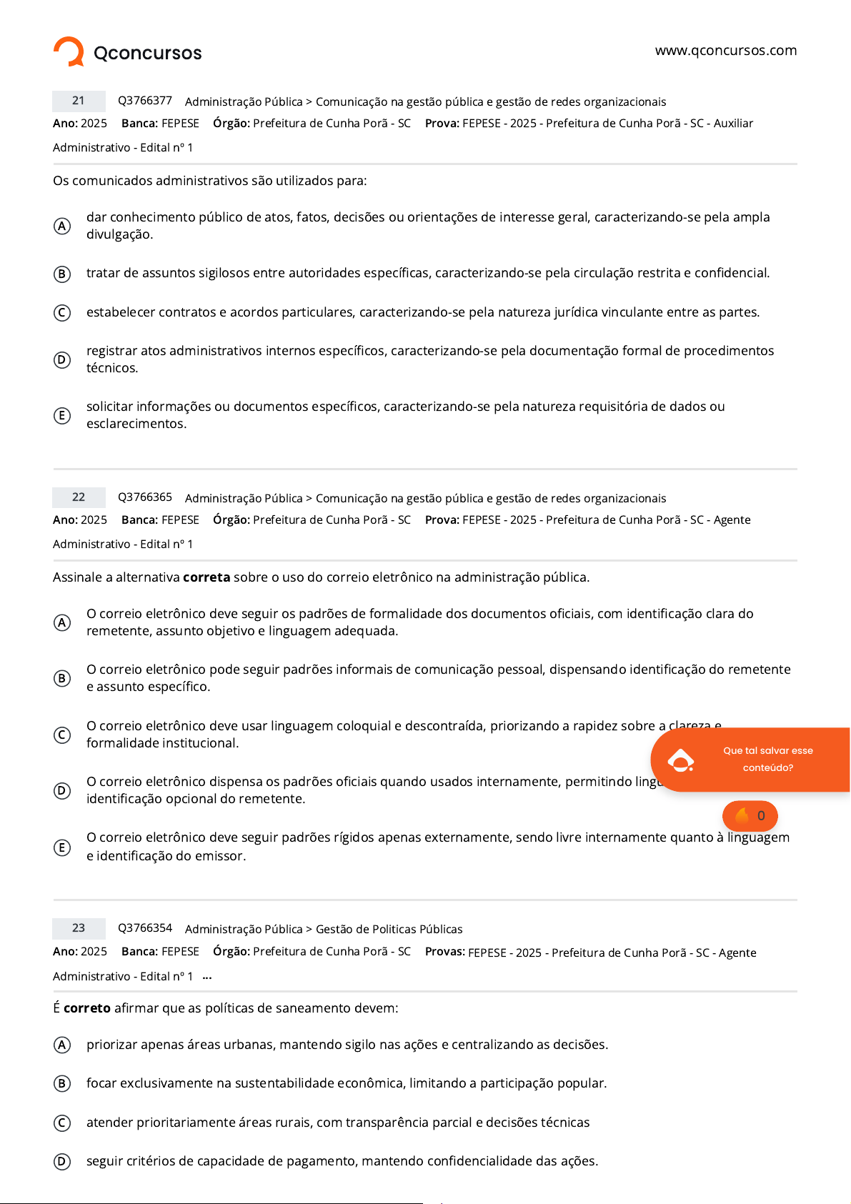 www.qconcursos.com Ano: 2025 Banca: FEPESE Órgão: Prefeitura de Cunha Porã - SC Os comunicados administrativos são utilizados para: A dar conhecimento público de atos, fatos, decisões ou orientações de interesse geral, caracterizando-se pela ampla divulgação. B tratar de assuntos sigilosos entre autoridades específicas, caracterizando-se pela circulação restrita e confidencial. C estabelecer contratos e acordos particulares, caracterizando-se pela natureza jurídica vinculante entre as partes. D registrar atos administrativos internos específicos, caracterizando-se pela documentação formal de procedimentos técnicos. E solicitar informações ou documentos específicos, caracterizando-se pela natureza requisitória de dados ou esclarecimentos. Ano: 2025 Banca: FEPESE Órgão: Prefeitura de Cunha Porã - SC Assinale a alternativa correta sobre o uso do correio eletrônico na administração pública. A O correio eletrônico deve seguir os padrões de formalidade dos documentos oficiais, com identificação clara do remetente, assunto objetivo e linguagem adequada. B O correio eletrônico pode seguir padrões informais de comunicação pessoal, dispensando identificação do remetente e assunto específico. C O correio eletrônico deve usar linguagem coloquial e descontraída, priorizando a rapidez sobre a clareza e formalidade institucional. D O correio eletrônico dispensa os padrões oficiais quando usados internamente, permitindo linguagem pessoal e identificação opcional do remetente. E O correio eletrônico deve seguir padrões rígidos apenas externamente, sendo livre internamente quanto à linguagem e identificação do emissor. Ano: 2025 Banca: FEPESE Órgão: Prefeitura de Cunha Porã - SC É correto afirmar que as políticas de saneamento devem: A priorizar apenas áreas urbanas, mantendo sigilo nas ações e centralizando as decisões. B focar exclusivamente na sustentabilidade econômica, limitando a participação popular. C atender prioritariamente áreas rurais, com transparência parcial e decisões técnicas D seguir critérios de capacidade de pagamento, mantendo confidencialidade das ações. 21 Q3766377 >Administração Pública Comunicação na gestão pública e gestão de redes organizacionais Prova: FEPESE - 2025 - Prefeitura de Cunha Porã - SC - Auxiliar Administrativo - Edital nº 1 22 Q3766365 >Administração Pública Comunicação na gestão pública e gestão de redes organizacionais Prova: FEPESE - 2025 - Prefeitura de Cunha Porã - SC - Agente Administrativo - Edital nº 1 23 Q3766354 >Administração Pública Gestão de Politicas Públicas Provas: FEPESE - 2025 - Prefeitura de Cunha Porã - SC - Agente Administrativo - Edital nº 1 ... Que tal salvar esse conteúdo? 0 https://www.qconcursos.com/ https://www.qconcursos.com/questoes-de-concursos/bancas/fepese https://www.qconcursos.com/questoes-de-concursos/institutos/prefeitura-de-cunha-pora-sc https://www.qconcursos.com/questoes-de-concursos/bancas/fepese https://www.qconcursos.com/questoes-de-concursos/institutos/prefeitura-de-cunha-pora-sc https://www.qconcursos.com/questoes-de-concursos/bancas/fepese https://www.qconcursos.com/questoes-de-concursos/institutos/prefeitura-de-cunha-pora-sc https://www.qconcursos.com/questoes-de-concursos/questoes/5b986417-d5 https://www.qconcursos.com/questoes-de-concursos/disciplinas/administracao-administracao-publica https://www.qconcursos.com/questoes-de-concursos/disciplinas/administracao-administracao-publica/comunicacao-na-gestao-publica-e-gestao-de-redes-organizacionais https://www.qconcursos.com/questoes-de-concursos/provas/fepese-2025-prefeitura-de-cunha-pora-sc-auxiliar-administrativo-edital-n-1 https://www.qconcursos.com/questoes-de-concursos/provas/fepese-2025-prefeitura-de-cunha-pora-sc-auxiliar-administrativo-edital-n-1 https://www.qconcursos.com/questoes-de-concursos/questoes/cefd61ab-d5 https://www.qconcursos.com/questoes-de-concursos/disciplinas/administracao-administracao-publica https://www.qconcursos.com/questoes-de-concursos/disciplinas/administracao-administracao-publica/comunicacao-na-gestao-publica-e-gestao-de-redes-organizacionais https://www.qconcursos.com/questoes-de-concursos/provas/fepese-2025-prefeitura-de-cunha-pora-sc-agente-administrativo-edital-n-1 https://www.qconcursos.com/questoes-de-concursos/provas/fepese-2025-prefeitura-de-cunha-pora-sc-agente-administrativo-edital-n-1 https://www.qconcursos.com/questoes-de-concursos/questoes/cee1035b-d5 https://www.qconcursos.com/questoes-de-concursos/disciplinas/administracao-administracao-publica https://www.qconcursos.com/questoes-de-concursos/disciplinas/administracao-administracao-publica/gestao-de-politicas-publicas https://www.qconcursos.com/questoes-de-concursos/provas/fepese-2025-prefeitura-de-cunha-pora-sc-agente-administrativo-edital-n-1 https://www.qconcursos.com/questoes-de-concursos/provas/fepese-2025-prefeitura-de-cunha-pora-sc-agente-administrativo-edital-n-1 E garantir acesso universal, sustentabilidade econômica, transparência e participação social nas decisões. Ano: 2025 Banca: FEPESE Órgão: Prefeitura de Cunha Porã - SC Ao final de seu turno, o vigia precisa passar as informações mais importantes para o colega que está assumindo o posto. Qual é a forma mais segura e eficiente de realizar essa troca de informações? A Enviar uma mensagem de texto com os pontos principais, pois é um método mais rápido e moderno. B Fazer um resumo verbal das ocorrências e conferir junto com o colega o livro de registros oficial, garantindo que ele assine o recebimento do posto. C Apenas entregar a chave do posto e informar que não houve nenhuma alteração durante o serviço. D Deixar um bilhete informal sobre a mesa com os recados mais urgentes a serem resolvidos. E Conversar sobre as ocorrências na presença de outras pessoas para que haja testemunhas da passagem de turno. Ano: 2025 Banca: Instituto Access Órgão: Prefeitura de Navegantes - SC O Programa Nac