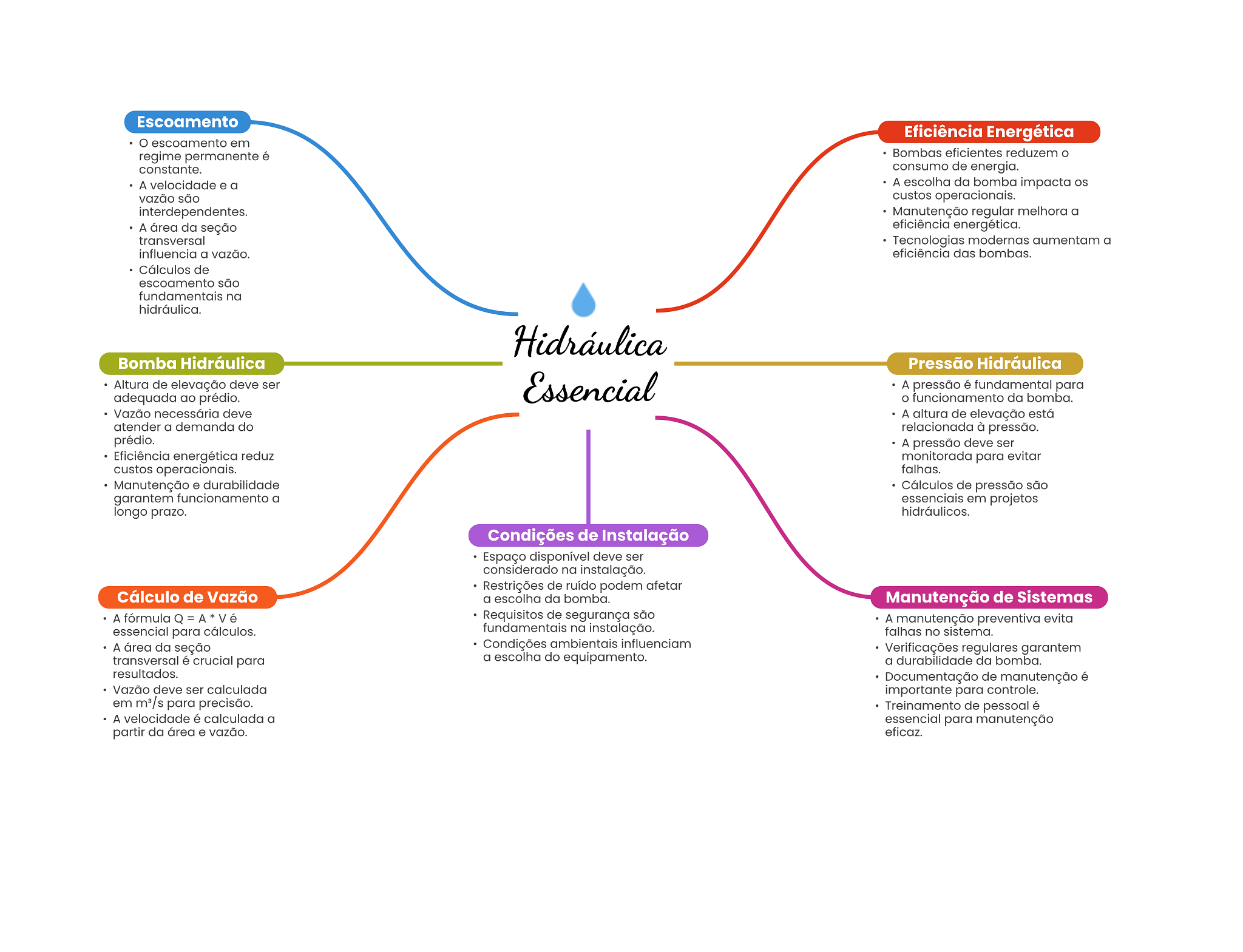 Escoamento Eficiência Energética escoamento em regime permanente é Bombas eficientes reduzem o constante. consumo de energia. A velocidade e a A escolha da bomba impacta os vazão são custos operacionais. interdependentes. Manutenção regular melhora a A área da seção eficiência energética. transversal Tecnologias modernas aumentam a influencia a vazão. eficiência das bombas. Cálculos de escoamento são fundamentais na hidráulica. Hidráulica Bomba Hidráulica Pressão Hidráulica Altura de elevação deve ser adequada ao prédio. Essencial A pressão é fundamental para funcionamento da bomba. Vazão necessária deve A altura de elevação está atender a demanda do relacionada à pressão. prédio. A pressão deve ser Eficiência energética reduz monitorada para evitar custos operacionais. falhas. Manutenção e durabilidade Cálculos de pressão são garantem funcionamento a essenciais em projetos longo prazo. hidráulicos. Condições de Instalação Espaço disponível deve ser considerado na instalação. Restrições de ruído podem afetar Cálculo de Vazão a escolha da bomba. Manutenção de Sistemas A fórmula Q=A*Vé Requisitos de segurança são A manutenção preventiva evita essencial para cálculos. fundamentais na instalação. falhas no sistema. A área da seção Condições ambientais influenciam Verificações regulares garantem transversal é crucial para a escolha do equipamento. a durabilidade da bomba. resultados. Documentação de manutenção é Vazão deve ser calculada importante para controle. em m³/s para precisão. Treinamento de pessoal é A velocidade é calculada a essencial para manutenção partir da área e vazão. eficaz.