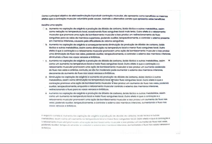 Como principal objetivo do eletroestimulação é produzir contração muscular, ela apresenta como os mesmos efeitos que muscular voluntária pode causar. Assinale a alternativa correta que apresenta estes beneficios: uma opção: a. Aumento captação de oxigênio e produção de dióxido de carbono, ácido láctico e outros metabólitos, assim como redução temperatura local, ocasionando fluxo sanguíneo local mais lento. Outro efeito é relaxamento muscular que promove uma ação de bombeamento muscular e isso produz um redirecionamento do fluxo sanguíneo para as veias de membros superiores, podendo auxiliar, terapeuticamente, a controlar edema presente em membros inferiores, causado pela dificuldade do retorno sanguíneo. b. Aumento na captação de oxigênio e consequentemente diminuição da produção de dióxido de carbono, ácido láctico e outros metabólitos, assim como diminuição na temperatura local e menor fluxo sanguíneo local. Outro efeito é que a contração e relaxamento muscular promovem uma ação de bombeamento muscular isso produz uma diminuição do fluxo nas veias, podendo auxiliar, terapeuticamente, a controlar edema dos membros inferiores, diminuindo fluxo nos vasos venosos e linfáticos. C. Aumento na captação de e produção de dióxido de carbono, ácido láctico e outros metabólitos, assim como um aumento na temperatura local e maior fluxo sanguíneo local. Outro efeito é que a contração e relaxamento muscular promovem uma ação de bombeamento muscular e isso produz um aumento acelerado do fluxo nas veias e artérias, contudo, se não for moderado pode aumentar edema dos membros inferiores, decorrente do aumento do fluxo nos vasos venosos e linfáticos. d. Diminuição na captação de oxigênio e aumento da produção de dióxido de carbono, ácido láctico e outros metabólitos, assim como diminuição na temperatura local ermaior fluxo sanguíneo local. Outro efeito é que a contração promove uma ação de bombeamento muscular e isso produz um aumento do fluxo nas veias, podendo auxiliar, terapeuticamente, enquanto relaxamento muscular controla edema dos membros inferiores, redirecionando fluxo para vasos venosos e linfáticos. e. Aumento no captação de oxigênio e produção de dióxido de carbono, ácido outros metabólitos, assim como um aumento na temperatura local e maior fluxo sanguíneo local. Outro efeito é que a contração e relaxamento muscular promovem uma ação de bombeamento muscular e isso produz um do fluxo nas veias, podendo auxiliar, terapeuticamente, a controlar edema dos membros inferiores, aumentando fluxo nos vasos venosos e A resposto correto e: Aumento no captação de e produção de dioxido de carbono, lactico e outros assim como um aumento na temperatura local e maior fluxo sanguineo local. Outro e que a contração e relaxamento muscular promovem uma ação de bombeamento muscular isso produz um aumento do fluxo nas veias, podendo terapeuticamente, a controlar edema dos membros fluxo nos vasos venosos e