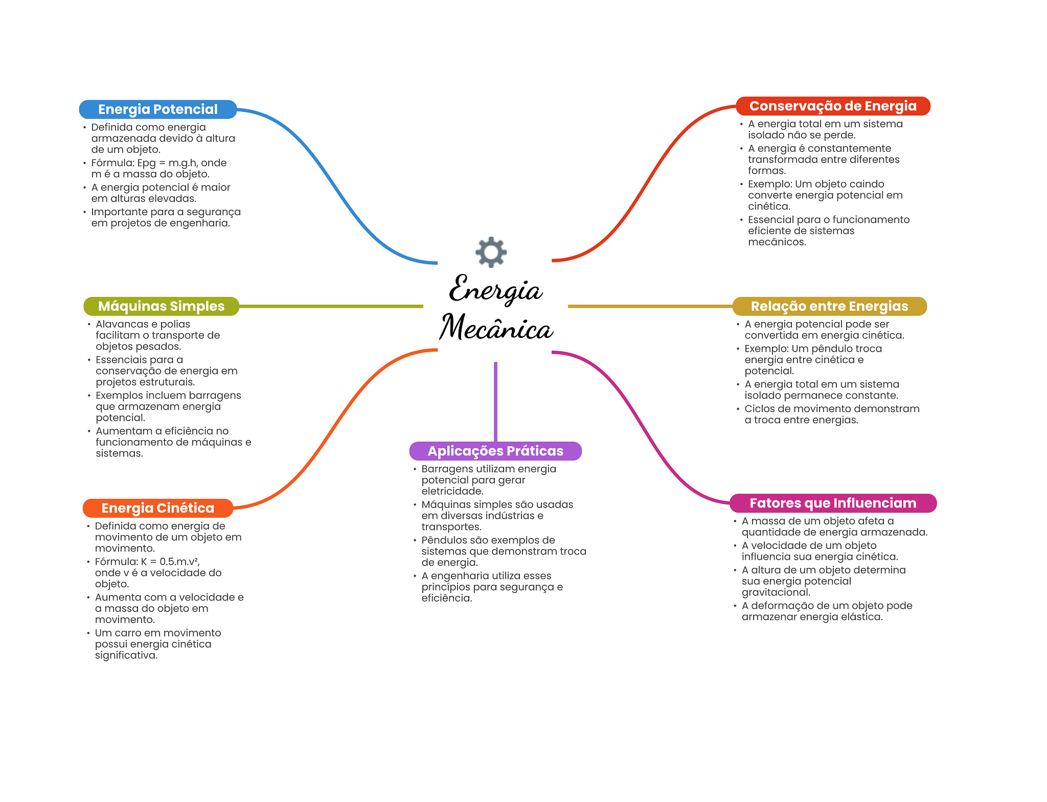 Energia Potencial Conservação de Energia Definida como energia A energia total em um sistema armazenada devido à altura isolado não se perde. de um objeto. A energia é constantemente Fórmula: Epg = m.g.h, onde transformada entre diferentes m é a massa do objeto. formas. A energia potencial é maior Exemplo: Um objeto caindo em alturas elevadas. converte energia potencial em cinética. Importante para a segurança em projetos de engenharia. Essencial para O funcionamento eficiente de sistemas mecânicos. Energia Máquinas Simples Relação entre Energias Alavancas e polias Mecânica A energia potencial pode ser facilitam transporte de convertida em energia cinética. objetos pesados. Exemplo: Um pêndulo troca Essenciais para a energia entre cinética e conservação de energia em potencial. projetos estruturais. A energia total em um sistema Exemplos incluem barragens isolado permanece constante. que armazenam energia Ciclos de movimento demonstram potencial. a troca entre energias. Aumentam a eficiência no funcionamento de máquinas e sistemas. Aplicações Práticas Barragens utilizam energia potencial para gerar eletricidade. Energia Cinética Máquinas simples são usadas Fatores que Influenciam em diversas indústrias e Definida como energia de A massa de um objeto afeta a transportes. movimento de um objeto em quantidade de energia armazenada. Pêndulos são exemplos de movimento. sistemas que demonstram troca A velocidade de um objeto Fórmula: = 0.5.m.v², de energia. influencia sua energia cinética. onde V é a velocidade do A engenharia utiliza esses A altura de um objeto determina objeto. princípios para segurança e sua energia potencial Aumenta com a velocidade e eficiência. gravitacional. a massa do objeto em A deformação de um objeto pode movimento. armazenar energia elástica. Um carro em movimento possui energia cinética significativa.