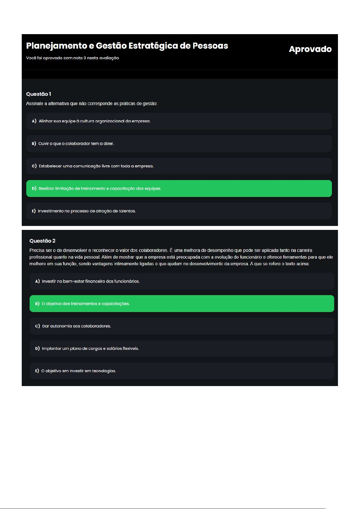 Planejamento e Gestão Estratégica de Pessoas Aprovado Você foi aprovado com nota 9 nesta avaliação Questão 1 Assinale a alternativa que não corresponde as práticas de gestão: A) Alinhar sua equipe à cultura organizacional da empresa. B) Ouvir que colaborador tem a dizer. c) Estabelecer uma comunicação livre com toda a empresa. D) Realizar limitação de treinamento e capacitação das equipes. E) Investimento no processo de atração de talentos. Questão 2 Precisa ser de desenvolver e reconhecer valor dos colaboradores. É uma melhora de desempenho que pode ser aplicada tanto na carreira profissional quanto na vida pessoal. Além de mostrar que a empresa está preocupada com a evolução do funcionário e oferece ferramentas para que ele melhore em sua função, sendo vantagens intimamente ligadas e que ajudam no desenvolvimento da empresa. A que se refere texto acima: A) Investir no bem-estar financeiro dos funcionários. B) objetivo dos treinamentos capacitações. c) Dar autonomia aos colaboradores. D) Implantar um plano de cargos e salários flexíveis. E) O objetivo em Investir em tecnologias.Questão 3 planejamento estratégico de Gestão de Pessoas tem uma gama de responsabilidades envolvendo recursos humanos de uma organização. Podemos dizer que inclui lidar com: Exceto. A) Planejamento de recompensas e incentivos pelo alcance dos objetivos. B) Desenvolvimento de um clima e cultura corporativas não favoráveis ao alcance dos objetivos. c) Arquitetar uma organização adequada. D) Definição da missão e da visão organizacional. E) As competências disponíveis e necessárias para atingir as metas. Questão 4 Ordene a coluna de baixo de acordo com a de cima e assinale a ordem correta: 1- Planejamento estratégico 2- Planejamento operacional 3- Planejamento tático () Indica como a estratégia global deve ser formulada e executada, é a organização geral. () É considerado "meio de campo" da organização para cada unidade ou departamento da empresa. () É a base da operação, engloba cada tarefa ou atividade da empresa. () Indicação de como cada tarefa, operação ou atividade irá contribuir para planejamento tático da unidade. () Indicação da participação de cada unidade, área ou departamento no planejamento global; A) 3,1,2,1,3 B) 1,3,2,1,2 c) 1,3,2,2,3 D) 2,3,2,1,2 E) 1,2,3,2,3Questão 5 Segundo Chiavenato (2010), a gestão de pessoas é baseada em alguns aspectos fundamentais, EXCETO: A) Pessoas como capital humano da organização: pessoas sendo consideradas principal ativo da organização, agregando inteligência ao negócio e fazendo-o prosperar. B) Pessoas como parceiros da organização: Pessoas quando são vistas como parceiras e não como sujeitos passivos. c) Pessoas como serem humanos: Pessoas como pessoas e não como meros recursos da organização, dotados de personalidade própria e profundamente diferentes entre si, com uma história pessoal particular e diferenciada, possuidores de conhecimentos, habilidades e competências indispensáveis à adequada gestão dos demais recursos organizacionais. D) Pessoas não como ativadores de recursos organizacionais: Pessoas como a fonte de elementos impulsionadores que dinamizam a organização e não como agentes passivos, inertes e estáticos. E) Fazem investimentos na organização, como esforço, dedicação, responsabilidade, comprometimento, riscos etc., na expectativa de colherem retornos desses investimentos, por meio de salários, incentivos financeiros, liderança e gestão de equipes, crescimento profissional, satisfação, entre outros. Questão 6 Objetivos nada mais são do que os resultados que pretendemos alcançar dentro de um determinado período. Com isso, podemos supor que os objetivos organizacionais são aqueles desejados por uma organização. São estes objetivos devem atender a 6 critérios. Marque a alternativa que não corresponde aos 6 critérios. A) Ser focalizados em um resultado a atingir e não em uma atividade; B) Ser relacionados com um determinado período, como dia, semana, Mês e número de anos. c) Ser alcançáveis, isto é, objetivos devem ser perfeitamente possíveis. D) Ser consistentes, ou seja, não precisam estar amarrados coerentemente a outros objetivos e demais metas da organização; E) Ser mensuráveis, ou seja, quantitativos e objetivos;Questão 7 São características estabelecer uma comunicação livre com toda a empresa, Exceto: A) Uma comunicação imprecisa desenvolve uma boa Gestão de Pessoas e garante bons resultados. B) Ouvir que seu colaborador tem a dizer. c) Uma comunicação clara e transparente desenvolve uma boa Gestão de Pessoas e garante a divulgação, por exemplo, dos resultados da empresa, seus lucros, empréstimos e prejuízos. D) Compartilhar informações com uso de comunicação aberta passa um sentimento de segurança e inclusão para colaboradores, mostrando que eles não só fazem parte, mas são fundamentais para as estratégias da empresa. E) estímulo a comunicação e ao diálogo faz com que funcionário se sinta parte importante da empresa. Questão 8 A visão organizacional tem foco no futuro e oferece bases para a definição dos objetivos que uma organização almeja alcançar. A que se refere essa frase: A) Chiavenato B) Luís Lins c) Careerbuilder D) Félix Aun E) Raul FredQuestão 9 Estratégia organizacional está relacionada com comportamento global e integrado da empresa em relação ao ambiental no qual está inserida. Toda organização precisa ter um padrão de comportamento holístico e sistêmico em relação ao mundo de negócios que a circunda e onde opera. Marque a alternativa que não corresponde a um aspecto fundamental e que não é observado em uma estratégia organizacional: A) É definida pelo nível institucional da organização, através da participação de todos níveis envolvidos e da negociação quanto aos interesses e objetivos a serem alcançados; B) Envolve a empresa em sua tota