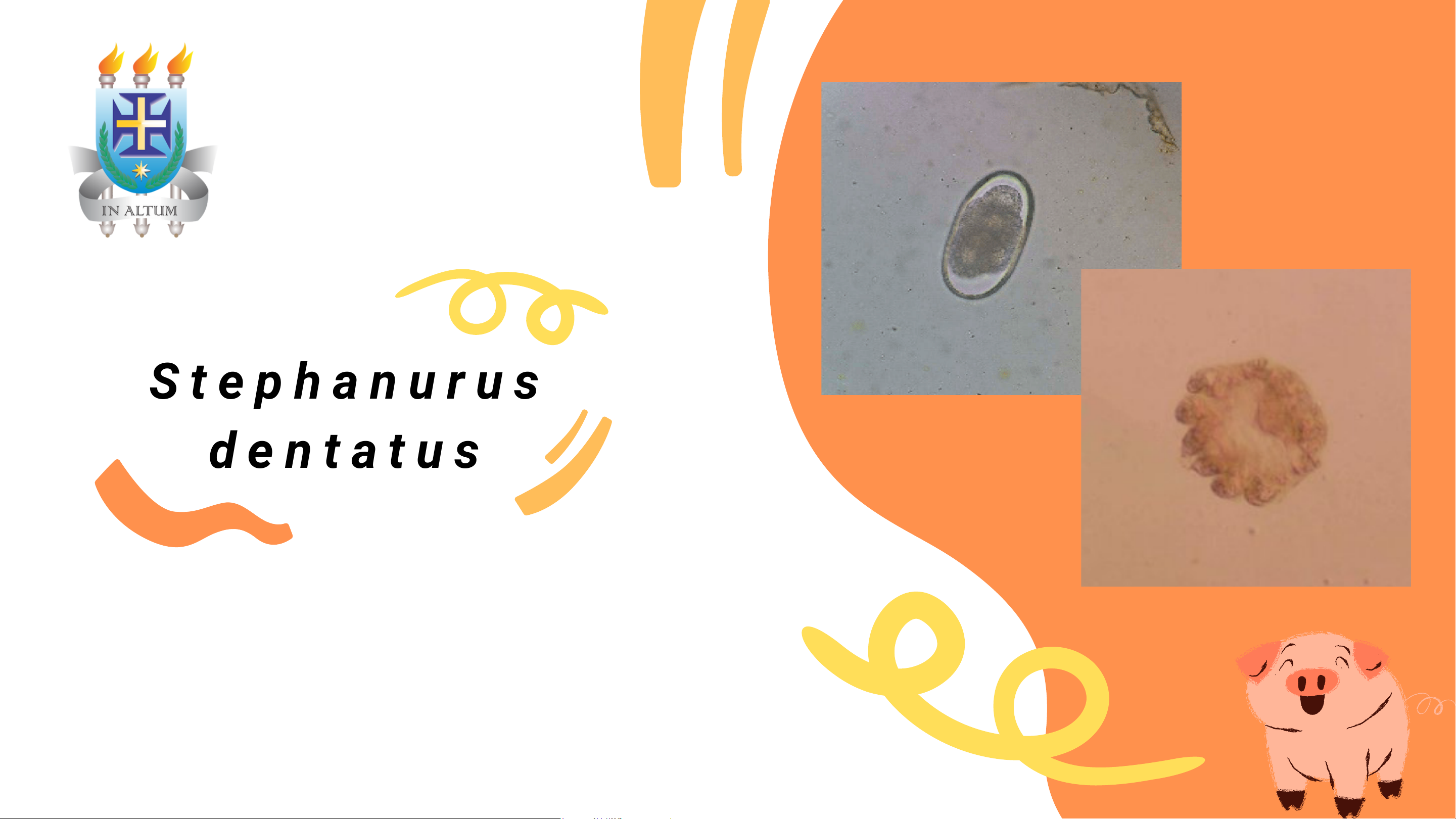 S t e p h a n u r u s d e n t a t u s Suene Oliveira e Yve Nathália Stephanurus Filo Nematoda Gênero: Stephanurus Espécie: Stephanurus dentatus Subfamília: Stephanurinae H. Definitivo: Suínos e bovinos (raro) H. Intermediário: Minhocas Local: Rins e gordura Peri-renal. Ciclo biológico ESTEFANUROSE FÍGADO RIM URETERES Apresenta lesões induzidas por larvas de S. dentatus S. dentatus adultos no cálice renal de suíno Ureteres dilatados e com formato irregular decorrente dos abcessos na superfície externa Macho: 2 espículos subiguais e gubernáculo; Os machos apresentam bolsa copuladora com raios curtos e atrofiados Fêmea: Vulva acima do anus, com papilas laterais; Podem medir até 4,5 cm de comprimento Esôfago claviforme Características morfológicas Adulto Ovos São segmentados quando saem ao exterior ; 90-120 x 43-70µm Formato Elipsoide OV O ADULTO Macho Fêmea Profilaxia e controle Manejo sanitário Manter os animais em ambiente cimentado e limpo Comedouros mantidos no alto Tratamento anti- helmíntico Na maioria dos casos é recomendado o abate dos suinos infectados REFERÊNCIAS GAUTAM PATRA, HIBA RIYADH AL-ABODI, ANA SAHARA, SUBHAMOY GHOSH, SONJOY KUMAR BORTHAKUR, SHAMIK POLLEY, PARTHASARATHI BEHERA & ABHIJIT DEKA (2019): PREVALENCE OF PARASITIC FAUNA OF PIGS IN NORTH-EASTERN REGION OF INDIA, BIOLOGICAL RHYTHM RESEARCH, DOI: 10.1080/09291016.2019.1573460 (N.D.). VET.BR. RETRIEVED OCTOBER 23, 2022, FROM HTTP://WWW.ADIVALDOFONSECA.VET.BR/HELMINTOSES/SUINOS/PARASITAS%20DE%20SU%C3%ADNOS.PDF AZEVEDO, F.; LOPES, R. M. STEPHANURUS DENTATUS. DISPONÍVEL EM: . ACESSO EM: 23 OUT. 2022. DISPONÍVEL EM: GIELDA, BÁRBARA CELLA ET AL. LEVANTAMENTO DE CONDENAÇÕES DE FÍGADOS DE SUÍNOS POR MIGRAÇÃO LARVAL EM FRIGORÍFICO SOB INSPEÇÃO FEDERAL. 2018. AZEVEDO, FERNANDO FELIPE; LOPES, RÔMULO M. GOMES; NEVES, MARIA FRANCISCA. STEPHANURUS DENTATUS. DISPONÍVEL EM: . ACESSO EM: 23 OUT. 2022. Obrigada pela atenção