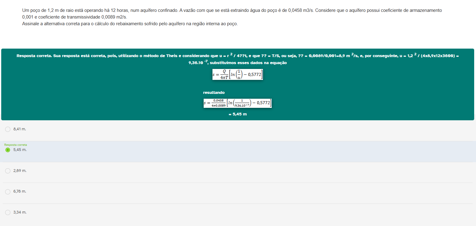 Um poço de 1,2 m de raio está operando há 12 horas, num confinado. A vazão com que se está extraindo água do poço é de 0,0458 m3/s. Considere que 0 possui coeficiente de armazenamento 0,001 e coeficiente de transmissividade 0,0089 m2/s. Assinale a alternativa correta para cálculo do rebaixamento sofrido pelo na região interna ao poço. Resposta correta. Sua resposta está correta, pois, utilizando método de Theis e considerando que 4??t, e que ?? T/S, ou seja, ?? 0,0089/0,001=8,9 m e, por conseguinte, (4x8,9x12x3600) - 9,36.10 -7, substituimos esses dados na equação Q = In 0,5772 4πT resultando 0.0458 1 S = In 9,36.10 ) 0,5772 5,45 m 8,41 m. Resposta correta 5,45 m. 2,89 m. 6,78 m. 3,34 m.