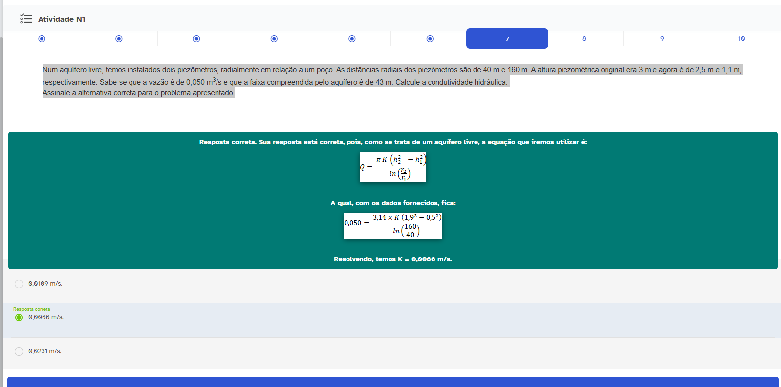 Atividade N1 7 8 9 10 Num livre, temos instalados dois piezômetros, radialmente em relação a um poço. As distâncias radiais dos piezômetros são de 40 m e 160 m. A altura piezométrica original era 3 m e agora é de 2,5 m e respectivamente. Sabe-se que a vazão é de 0,050 e que a faixa compreendida pelo aquífero é de 43 m. Calcule a condutividade hidráulica. Assinale a alternativa correta para problema apresentado. Resposta correta. Sua resposta está correta, pois, como se trata de um aquífero a equação que iremos utilizar é: A qual, com os dados fornecidos, fica: 0,050 = Resolvendo, temos K - 0,0066 m/s. 0,0109 m/s. Resposta correta 0,0066 m/s. 0,0231 m/s.