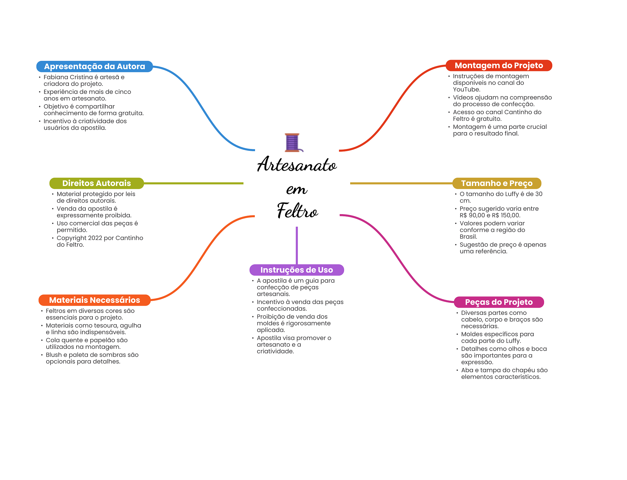 Apresentação da Autora Montagem do Projeto Fabiana Cristina é artesã e Instruções de montagem criadora do projeto. disponíveis no canal do Experiência de mais de cinco YouTube. anos em artesanato. Vídeos ajudam na compreensão Objetivo é compartilhar do processo de confecção. conhecimento de forma gratuita. Acesso ao canal Cantinho do Incentivo à criatividade dos Feltro é gratuito. usuários da apostila. Montagem é uma parte crucial para resultado final. Artesanato Direitos Autorais Tamanho e Preço em Material protegido por leis tamanho do Luffy é de 30 de direitos autorais. cm. Venda da apostila é Feltro Preço sugerido varia entre expressamente proibida. R$ 90,00 e R$ 150,00. Uso comercial das peças é Valores podem variar permitido. conforme a região do Copyright 2022 por Cantinho Brasil. do Feltro. Sugestão de preço é apenas uma referência. Instruções de Uso A apostila é um guia para confecção de peças artesanais. Materiais Necessários Incentivo à venda das peças Peças do Projeto Feltros em diversas cores são confeccionadas. Diversas partes como essenciais para projeto. Proibição de venda dos cabelo, corpo e braços são Materiais como tesoura, agulha moldes é rigorosamente necessárias. e linha são indispensáveis. aplicada. Moldes específicos para Cola quente e papelão são Apostila visa promover cada parte do Luffy. utilizados na montagem. artesanato e a criatividade. Detalhes como olhos e boca Blush e paleta de sombras são são importantes para a opcionais para detalhes. expressão. Aba e tampa do chapéu são elementos característicos.