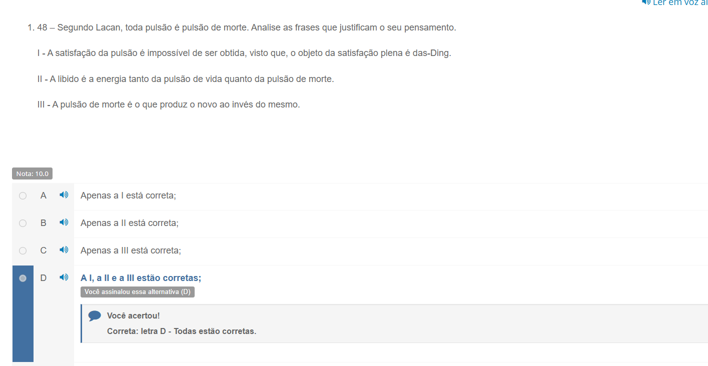 Ler em VOZ 1. 48 - Segundo Lacan, toda pulsão é pulsão de morte. Analise as frases que justificam O seu pensamento. I - A satisfação da pulsão é impossível de ser obtida, visto que, objeto da satisfação plena é das-Ding. II A libido é a energia tanto da pulsão de vida quanto da pulsão de morte. III - A pulsão de morte é que produz novo ao invés do mesmo. Nota: 10.0 A Apenas a I está correta; B Apenas a está correta; C Apenas a III está correta; D a e a III estão corretas; Você assinalou essa alternativa (D) Você acertou! Correta: letra D - Todas estão corretas.