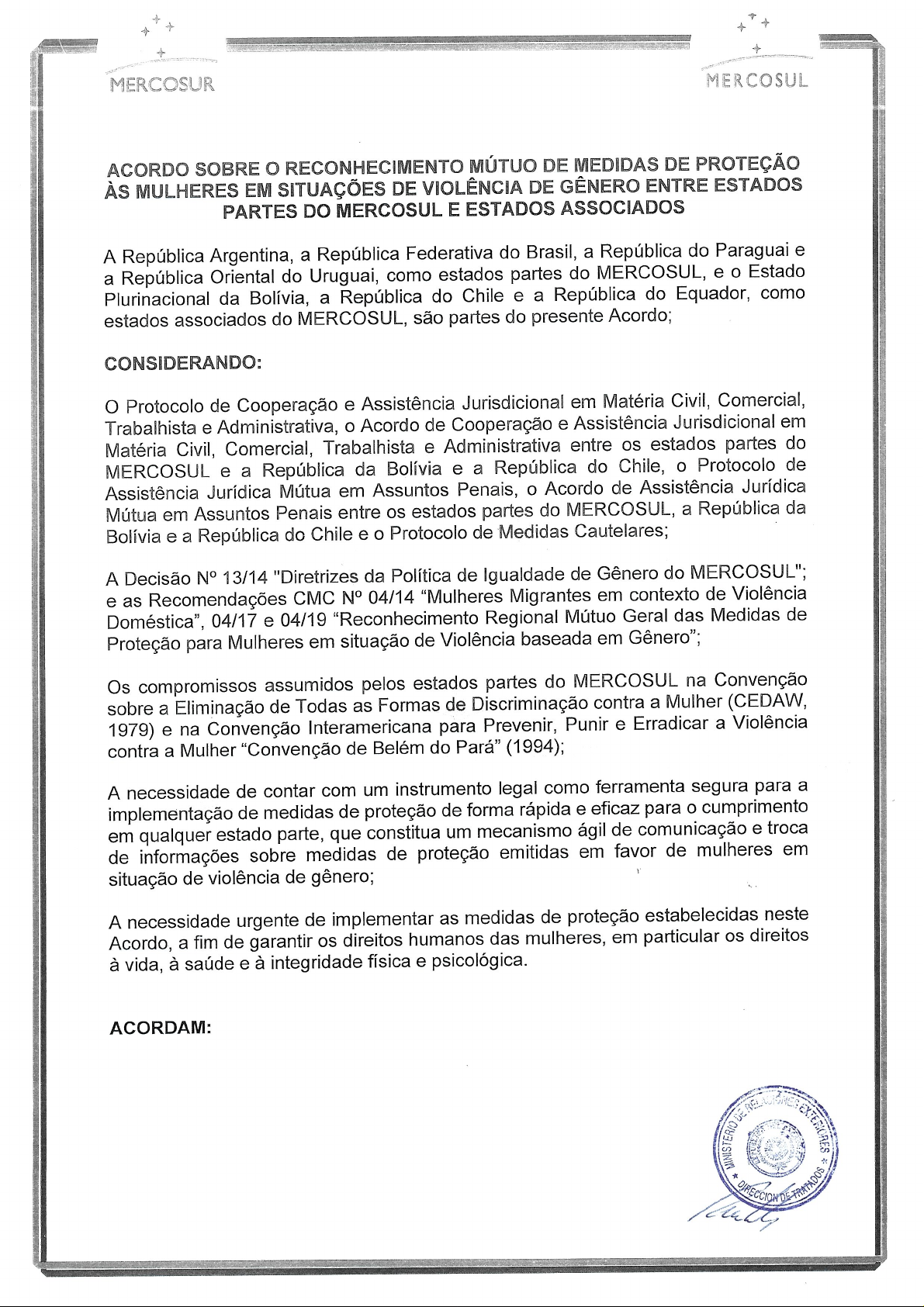 + + + MERCOSUR MERCOSUL ACORDO SOBRE RECONHECIMENTO MÚTUO DE MEDIDAS DE PROTEÇÃO ÀS MULHERES EM SITUAÇÕES DE VIOLÊNCIA DE GÊNERO ENTRE ESTADOS PARTES DO MERCOSUL E ESTADOS ASSOCIADOS A República Argentina, a República Federativa do Brasil, a República do Paraguai e a República Oriental do Uruguai, como estados partes do MERCOSUL, e Estado Plurinacional da Bolívia, a República do Chile e a República do Equador, como estados associados do MERCOSUL, são partes do presente Acordo; CONSIDERANDO: O Protocolo de Cooperação e Assistência Jurisdicional em Matéria Civil, Comercial, Trabalhista e Administrativa, Acordo de Cooperação e Assistência Jurisdicional em Matéria Civil, Comercial, Trabalhista e Administrativa entre os estados partes do MERCOSUL e a República da Bolívia e a República do Chile, Protocolo de Assistência Jurídica Mútua em Assuntos Penais, Acordo de Assistência Jurídica Mútua em Assuntos Penais entre os estados partes do MERCOSUL, a República da Bolívia e a República do Chile e Protocolo de Medidas Cautelares; A Decisão N° 13/14 "Diretrizes da Política de Igualdade de Gênero do MERCOSUL"; e as Recomendações CMC N° 04/14 "Mulheres Migrantes em contexto de Violência 04/17 e 04/19 "Reconhecimento Regional Mútuo Geral das Medidas de Proteção para Mulheres em situação de Violência baseada em Gênero"; Os compromissos assumidos pelos estados partes do MERCOSUL na Convenção sobre a Eliminação de Todas as Formas de Discriminação contra a Mulher (CEDAW, 1979) e na Convenção Interamericana para Prevenir, Punir e Erradicar a Violência contra a Mulher "Convenção de Belém do Pará" (1994); A necessidade de contar com um instrumento legal como ferramenta segura para a implementação de medidas de proteção de forma rápida e eficaz para o cumprimento em qualquer estado parte, que constitua um mecanismo ágil de comunicação e troca de informações sobre medidas de proteção emitidas em favor de mulheres em situação de violência de gênero; A necessidade urgente de implementar as medidas de proteção estabelecidas neste Acordo, a fim de garantir os direitos humanos das mulheres, em particular os direitos à vida, à saúde e à integridade física e psicológica. ACORDAM: DIRECCIONMERCOSUR MERCOSUR ARTIGO 1 OBJETO 1. presente Acordo estabelece regras para reconhecimento e execução de medidas de proteção em favor da mulher em situação de violência de gênero, emitidas por uma Autoridade Competente de uma parte e transmitidas a outra parte por meio de uma Ordem MERCOSUL de Proteção (OMP). 2. A OMP será transmitida por meio das Autoridades Centrais em conformidade com artigo 7 do presente Acordo. 3. As partes reconhecerão a OMP com base nas disposições do presente Acordo e em conformidade com sua legislação nacional. ARTIGO 2 DEFINIÇÕES 1. Autoridade Competente: é a autoridade judiciária que, de acordo com O ordenamento jurídico interno de cada parte, é competente para emitir ou executar uma OMP. 2. Estado Emissor: é a parte na qual foi emitida a medida de proteção que constitui a base para a emissão de uma OMP. 3. Estado Executor: é a parte à qual é exigido o reconhecimento e a execução de uma OMP. 4. Ordem MERCOSUL de Proteção (OMP): é a decisão proferida pela Autoridade Competente de uma parte deste Acordo, que emitiu medida de proteção em favor de uma mulher em situação de violência de gênero, para fins de seu reconhecimento e execução em outra parte. 5. Violência de gênero: é qualquer ação ou conduta baseada em gênero que cause morte, dano ou sofrimento físico, sexual ou psicológico, tanto na esfera pública quanto na privada. ARTIGO 3 AUTORIDADE CENTRAL 1. Cada parte designará uma Autoridade Central para fins do presente Acordo. 2. Para tal efeito, as referidas Autoridades Centrais se comunicarão diretamente entre si - sem a intervenção das vias diplomáticas mediante qualquer meio eletrônico que permita manter registo formal da transmissão. Somente quando materialmente impossível, a Autoridade Central enviará por correio, em formato de papel. DE * -2-+ + + + + + MERCOSUR MERCOSUL 3. As partes, ao depositarem O instrumento de ratificação do presente Acordo, comunicarão a designação da Autoridade Central para seu cumprimento. 4. A Autoridade Central poderá ser substituída a qualquer momento, devendo a parte notificar, com a maior brevidade possível, depositário do presente Acordo, que será responsável por notificar as demais partes da alteração efetuada. ARTIGO 4 AUTORIDADE COMPETENTE DO ESTADO EMISSOR A autoridade judiciária emissora de uma medida de proteção será igualmente competente para, quando solicitado pela mulher destinatária da proteção, encaminhar uma OMP à sua Autoridade Central para requerer seu reconhecimento. ARTIGO 5 MEDIDAS DE PROTEÇÃO 1. A OMP só poderá ser emitida quando a Autoridade Competente do Estado Emissor tiver emitido uma ou mais das seguintes medidas de proteção: a) proibição de entrar em localidades ou lugares ou em certas áreas em que a mulher resida ou em que se encontre temporariamente por qualquer motivo; b) proibição ou restrição de contato, sob qualquer forma, com a mulher, inclusive por telefone, e-mail ou correio, ou por qualquer outro meio; c) proibição ou restrição de aproximação da mulher a uma distância inferior à prescrita, incluindo ou não uso de dispositivos de geolocalização e rastreamento; d) suspensão do direito de posse, porte e uso de arma, com obrigação de depositá-la no local indicado; e) qualquer outra medida necessária para garantir a segurança da mulher, pôr fim à situação de violência e evitar a repetição de qualquer ato de perturbação ou intimidação, agressão e maus-tratos perpetrado pelo agressor. 2. Uma OMP poderá ser emitida quando a mulher visite ou resida transitória, temporária ou permanentemente no território de outra parte, independente