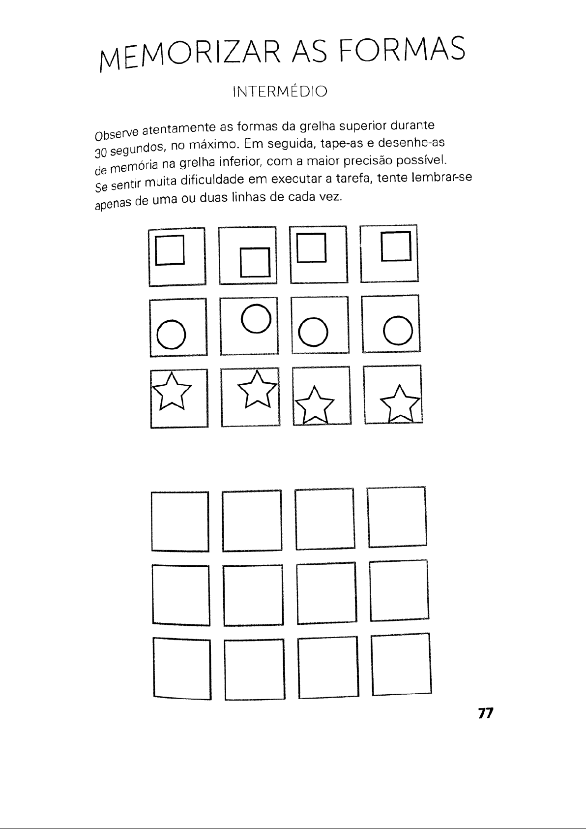 MEMORIZAR AS FORMAS INTERMÉDIO Observe atentamente as formas da grelha superior durante 30 segundos, no máximo. Em seguida, tape-as e desenhe-as de memória na grelha inferior, com a maior precisão possível. Se sentir muita dificuldade em executar a tarefa, tente lembrar-se apenas de uma ou duas linhas de cada vez. 77MEMORIZAR AS FORMAS PRINCIPIANTE Observe atentamente as formas da grelha superior durante 30 segundos, no máximo. Em seguida, tape-as e desenhe-as de memória na grelha inferior, com a maior precisão possível. Se sentir muita dificuldade, tente lembrar-se de metade da grelha à primeira tentativa e da outra metade à segunda tentativa. 41MEMORIZAR AS FORMAS COMPLICADO Observe atentamente máximo. as estrelas Em da grelha superior durante Se de 30 memória sentir segundos, muita na no grelha dificuldade inferior, em com seguida, executar a maior tape-as a tarefa, precisão e tente desenhe-as possível. memorizar primeiro metade da grelha e a outra metade à segunda tentativa. 115COMPREENSÃO AVANÇADO a passagem abaixo só uma vez, mas tão lentamente quanto desejar. Leia Depois veja a quantas das perguntas que se seguem consegue responder sem voltar a consultar a passagem. Se houver alguma pergunta à qual não conseguiu responder, repita exercício uma segunda vez. Existem vários tipos diferentes de quebra-cabeças lógicos, incluindo um grande número que foi inventado no Japão. Alguns dos mais conhecidos quebra-cabeças japoneses são o Sudoku, Kakuro e o Futoshiki. Em alguns casos, trata-se de versões de quebra-cabeças não japoneses, mas existem também vários quebra-cabeças que foram genuinamente inventados no Japão. As palavras-cruzadas japonesas requerem que todos quadrados brancos estejam ligados, como é normal, mas não permitem que os quadrados sombreados se toquem. Esta restrição forma a base das regras dos quebra-cabeças japoneses como o Hitori e o Shikaku. Os japoneses têm vários alfabetos e um grande número de carateres em cada um deles, por isso têm um particular carinho por quebra-cabeças com base em números, percursos e sombreados. Esta é uma das razões pelas quais a popularidade deles se tem difundido por todo o mundo: é que estes quebra- -cabeças nunca precisam de ser traduzidos! Agora responda a estas perguntas sem consultar a passagem: 1 Identifique três quebra-cabeças japoneses 2 Quais as duas regras que as palavras-cruzadas japonesas têm de seguir? 3 Quais dois quebra-cabeças que usam as regras das palavras-cruzadas japonesas? 4 Quais três tipos de quebra-cabeças pelos quais OS japoneses têm um particular carinho? 143ANAGRAMAS NUMÉRICOS INTERMÉDIO Consegue reordenar estes números e operações aritméticas para que resultado seja cada um dos totais apresentados? Cada número e cada operação têm de ser utilizados exatamente uma vez para cada total e números só podem ser combinados usando operações. Pode usar quantos parênteses sejam necessários. Por exemplo, podia reordenar números as operações + e X para obter 22, escrevendo (6 + 5) X 2 = 22. 1 2 4 6 25 + + ÷ Tente obter os seguintes resultados: 50 163 65memória a longo prazo memória de trabalho CH Todas as respostas deste jogo contêm as letras CH. Consegue responder todas? 1. Festa em cujo prato principal 8. Instrumento com que se faz é composto por grelhados. correr a lingueta de uma fe- chadura para a abrir ou fechar. 2. Peça metálica que fecha com segurança portas, gavetas, 9. Água que cai das nuvens. malas, etc. 10. Aproximar, mover para perto. Э. Fonte com várias bicas em que a água cai num tanque. 11. Infusão das folhas ou das flores de qualquer planta. 4. Produto alimentício, de coloração castanha, obtido a partir de cacau torrado moído Peça que se coloca à volta e açúcar. do pescoço para proteger do frio. Utensílio usado para apagar letras ou sinais traçados no papel. Grupo de flores ou de frutos num eixo único ou num eixo ramificado. Б. Papel ou cartão com anota- ções ou indicações para con- sulta ou utilização posterior. 14. Ameaça de escândalo ou outras consequências no caso de negativa de um pedido. 7. Dar um pontapé. 60 150 JOGOS PARA MANTER CEREBROEncontre as palavras RIOS DE PORTUGAL encontrar 16 rios de Portugal cronometre nesta sopa 2 de le- Consegue Para estimulação extra do cérebro, lista. minu- tras? tos para este jogo e não utilize a PICOAIGINSMALIMAT TFANLANDIUATNABAO NTDCRANFAAOLDERDI FOODETISADOUROUSO UAASRSEA ICIOBOAI MONTEJUNTAAPOLODL GERESRQESNRETEJOM ITGARDMIRAITAFARA ESTRELNVRABOEAOSR SIORICHSRALCGMOVA MONDEGOARAMUAOOOO LTOOJKLOADAAVVAUH AICEAMJERTTUACOGA ZEZEREAMGPLCABDAR PALAVRAS: Lima Tua Tejo Sado Minho Nabão Coa Sorraia Vouga Douro Mira Tâmega Guadiana Mondego Cávado Zêzere 150 JOGOS PARACLUES 0 tooth book flashlight paperclip loaf of bread turkey tent bell cane dog paintbrush 0 cake canoe slice © Karen Barthol 2004 belt Can you find in the picture the objects listed on the right? glasses