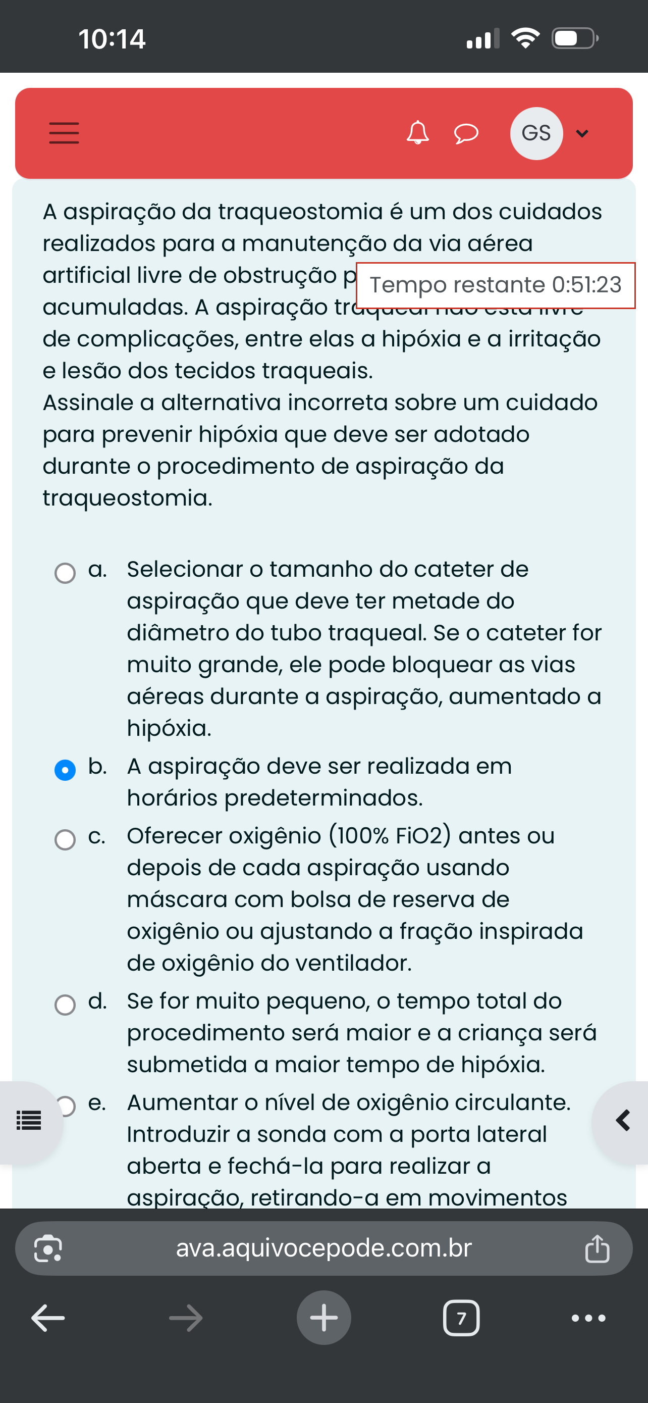 10:14 GS aspiração da traqueostomia é um dos cuidados realizados para a manutenção da via aérea artificial livre de obstrução Tempo restante 0:51:23 acumuladas. aspiração de complicações, entre elas a hipóxia e a irritação e lesão dos tecidos traqueais. Assinale a alternativa incorreta sobre um cuidado para prevenir hipóxia que deve ser adotado durante procedimento de aspiração da traqueostomia. a. Selecionar tamanho do cateter de aspiração que deve ter metade do diâmetro do tubo traqueal. Se cateter for muito grande, ele pode bloquear as vias aéreas durante a aspiração, aumentado a hipóxia. b. aspiração deve ser realizada em horários predeterminados. Oferecer oxigênio (100% FiO2) antes ou depois de cada aspiração usando máscara com bolsa de reserva de oxigênio ou ajustando a fração inspirada de oxigênio do ventilador. d. Se for muito pequeno, tempo total do procedimento será maior e a criança será submetida a maior tempo de hipóxia. e. Aumentar nível de oxigênio circulante. Introduzir a sonda com a porta lateral aberta e fechá-la para realizar a aspiração, retirando-a em movimentos ava.aquivocepode.com.br + 7