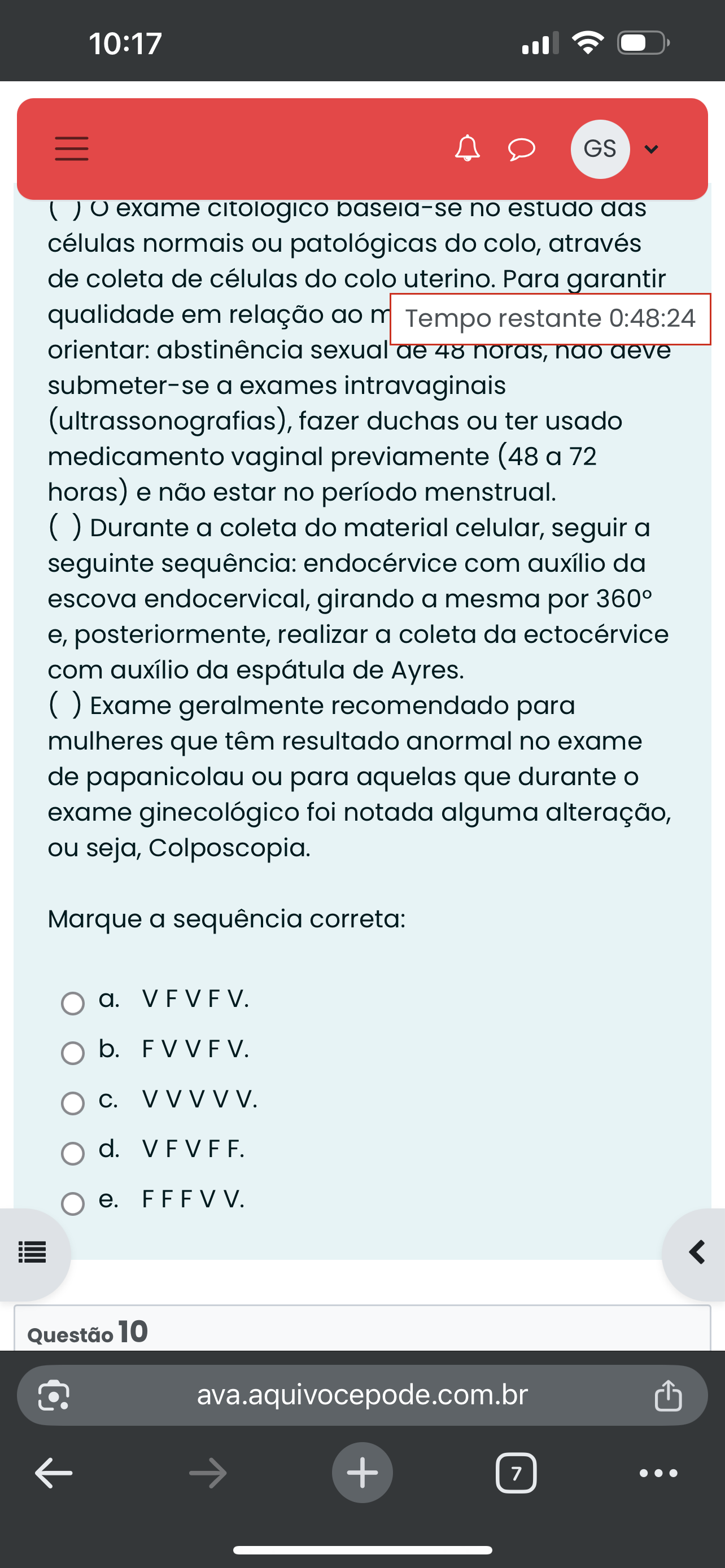 10:17 GS exame citologico no estudo das células normais ou patológicas do colo, através de coleta de células do colo uterino. Para garantir qualidade em relação ao m Tempo restante 0:48:24 orientar: abstinência 48 noras, nao aeve submeter-se a exames intravaginais (ultrassonografias), fazer duchas ou ter usado medicamento vaginal previamente (48 a 72 horas) e não estar no período menstrual. Durante a coleta do material celular, seguir a seguinte sequência: endocérvice com auxílio da escova endocervical, girando a mesma por 360° e, posteriormente, realizar a coleta da ectocérvice com auxílio da espátula de Ayres. Exame geralmente recomendado para mulheres que têm resultado anormal no exame de papanicolau ou para aquelas que durante exame ginecológico foi notada alguma alteração, ou seja, Colposcopia. Marque a sequência correta: a. VFVFV. b. FVVFV. VVVVV. d. VFVFF. e. FFFVV. Questão 10 ava.aquivocepode.com.br + 7