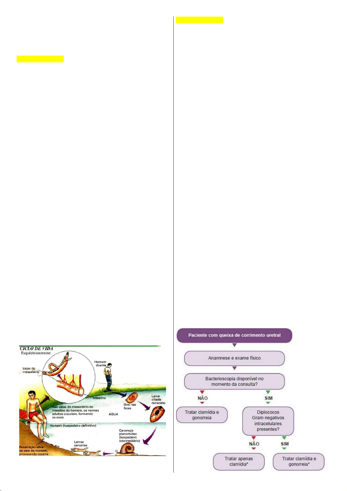 10 Casos Clínicos Discursivas apresentados no MAAV Ciclo 38 CASO CLÍNICO 1 Ana, 10 anos, foi levada à USF por sua tia Glória. Glória diz que a menina não está bem que deve ser alguma coisa grave. -Doutor, estou muito preocupada! Aninha não quer comer nada, está fraca há 7 dias e tem diarreia. Hoje disse que também tem dor na barriga. Não se anima nem de ir nadar no lago que ela gosta tanto. Exame físico: paciente em bom estado geral, afebril no momento, anictérica. Abdome: distendido e doloroso, fígado palpável, sem sinais de alarme. Prova do laço negativa. Sinais vitais sem alterações. a) Qual é a sua principal hipótese diagnóstica? Esquistossomose. b) Como confirmar sua hipótese? Pesquisa de ovos Schistosoma nas fezes (Kato-Katz). c) Quais são os hospedeiros? Homem e caramujo. d) Qual é a sua conduta em caso de confirmação do diagnóstico? Tratar com Praziquantel/ Notificação Compulsória e) Quais serão as suas orientações a esta paciente? • Orientar a população de área endêmica sobre sinais e sintomas da doença - Cuidados individuais / coletivos - Atividades de promoção à saúde • Saneamento domiciliar e ambiental • Evitar banhos em lago com caramujo Notificação compulsória. CASO CLÍNICO 2 João Pedro, 21 anos, vem a consulta com queixa de dor para urinar há 4 dias, e notou hoje saída de secreção do pênis. Conta que tem uma namorada, Larissa, que tem 14 anos, e estão muito preocupados pois a menstruação dela está com atraso de 2 meses. Refere que teve relações sexuais com outras pessoas e algumas vezes não usou camisinha pois estava muito embriagado. Além do consumo de álcool conta que gosta de fumar maconha e experimentou Crack há 3 semanas e desde então usou quase todos os dias. Ao exame: Saída de secreção amarelada à ordenha da uretra. Sem outras alterações. a) Qual a hipótese diagnóstica? Corrimento uretral ou uretrite. Uso de substância psicoativas. b) Qual o tratamento? Abordagem sindrômica para gonorréia e clamídia. Ciprofloxacino + Azitromicina ou Ceftriaxone + Azitromicina. c) Quais as orientações de prevenção e com relação as parcerias? Orientar comunicação e tratar parcerias (últimos 2 meses) Orientar uso de preservativo Convidar namorada para consulta médica (gravidez?) Indicar vacina de Hepatite B Abordagem na anamnese sobre abuso de SPA. Falar sobre redução de danos. d) Quais exames você solicitaria? Rastreamento para ISTs: HIV, Sífilis, Hepatite B E C. Aconselhamento pré-teste e pós-teste. CASO CLÍNICO 3 Cauã Mendes das Chagas, 01 ano e 6 meses, é trazido pela sua avó à Unidade de Saúde com uma história de coriza, febre não aferida e tosse há 5 dias. A avó conta que desde ontem está com mais tosse e com a respiração “mais cansada”. Foi levado à UPA antes de ir à USF, onde fez uso de broncodilatador, apresentando melhora parcial do quadro. Antecedentes pessoais: Parto Normal, Apgar 9 e 9, sem intercorrências. Vacinações em dia. Antecedentes Familiares: Pai portador de Asma, mãe tabagista. Exame físico: FC 110bpm FR 44rpm Sat O2 99% Tax 38ºC AR: Murmúrio vesicular diminuído em base esquerda, com discretos estertores crepitantes, sem sibilos. Sem estridor, sem tiragem subcostal. a) Qual a hipótese diagnóstica? Pneumonia. b) Quais os exames a serem solicitados? Nenhum. Não solicitar Rx torax – a maioria dos casos não terá alteração sensível para confirmar diagnóstico. Não precisa de hemograma no primeiro momento. c) Qual a conduta? Amoxacilina 50mg/kg/dia de 8/8h por 7 a 10 dias. Tratamento domiciliar Orientar sinais de alarme Retorno em 48 horas ou antes em caso de sinais alarme ou piora clínica. A realização de radiografia de tórax para confirmação do diagnóstico não é rotineiramente necessária em crianças com quadro leve de pneumonia, sem complicações e que serão tratadas ambulatorialmente. • A escolha da antibioticoterapia é empírica – a amoxicilina é droga de primeira escolha. • Se uso recente de amoxicilina (nos últimos 3 meses), associar com clavulanato. • Macrolídeos (azitromicina) podem ser utilizados nas crianças maiores de 5 anos (etiologia) ou suspeita de germe atípico. • Gravidade = hospitalização: tiragem, sonolência excessiva, desnutrição, comorbidades crônicas e baixa idade (Vaginal Lacerações Queimaduras (luva, meia, limites bem definidos) Lesões físicas, fraturas, equimoses, hematomas (relação temporal, história incoerente e estágios diferentes de evolução) Alteração no comportamento da criança Valorizar qualquer suspeita do cuidador Quem faz o cuidado? O papel da ESF: • Estar atento e Identificar casos de violência • Acolher as demandas • Procurar o apoio da rede, trabalhar de forma intersetorial e co-responsável • Pactuar as ações em conjunto com a família • Preencher a Ficha de Notificação Individual de Violência do MS (Esse instrumento não caracteriza denúncia) • Importância do Agente comunitário de saúde e sua ação dentro do território. CASO CLÍNICO 6 Kidson, 15 anos, comparece sozinho à Unidade Básica de Saúde para consulta médica. Gostaria de fazer exames de rotina pois está preocupado com sua saúde. Conta que seus pais se separaram recentemente e ele está morando com o pai no bairro, mas sua mãe vai quase todos os dias em casa para lhe ajudar com o preparo da comida e tarefas escolares. Quando volta da escola fica a maior parte do tempo usando a internet pelo celular. Diz que agora que a mãe foi embora, pode sair mais vezes a noite. Ao exame: bom estado geral, eupneico, envergonhado. Ausculta pulmonar e cardíaca normais, abdome plano, flácido, indolor e sem visceromegalias. a) Quais perguntas você faria na anamnese? Consulta com adolescente Anamnese: método clínico centrado na pessoa O que te deixa preocupado? Há alguma doença que você pensa que possa ter? Faz ou fez uso de substâncias? Tem relações sexuais? Uso de prese
