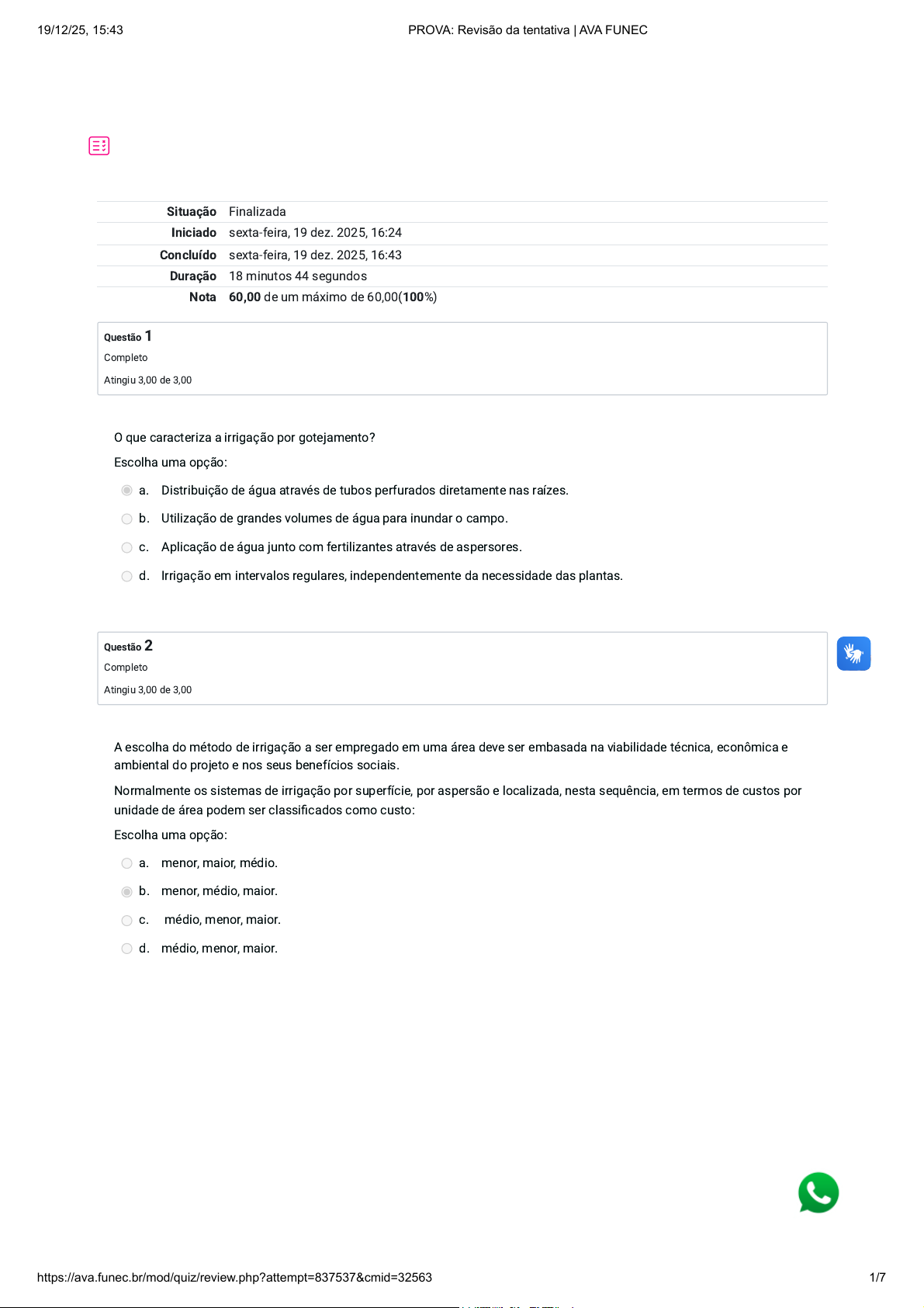 Situação Finalizada Iniciado sexta-feira, 19 dez. 2025, 16:24 Concluído sexta-feira, 19 dez. 2025, 16:43 Duração 18 minutos 44 segundos Nota 60,00 de um máximo de 60,00(100%) Questão 1 Completo Atingiu 3,00 de 3,00 Questão 2 Completo Atingiu 3,00 de 3,00 O que caracteriza a irrigação por gotejamento? Escolha uma opção: a. Distribuição de água através de tubos perfurados diretamente nas raízes. b. Utilização de grandes volumes de água para inundar o campo. c. Aplicação de água junto com fertilizantes através de aspersores. d. Irrigação em intervalos regulares, independentemente da necessidade das plantas. A escolha do método de irrigação a ser empregado em uma área deve ser embasada na viabilidade técnica, econômica e ambiental do projeto e nos seus benefícios sociais. Normalmente os sistemas de irrigação por superfície, por aspersão e localizada, nesta sequência, em termos de custos por unidade de área podem ser classificados como custo: Escolha uma opção: a. menor, maior, médio. b. menor, médio, maior. c. médio, menor, maior. d. médio, menor, maior. 19/12/25, 15:43 PROVA: Revisão da tentativa | AVA FUNEC https://ava.funec.br/mod/quiz/review.php?attempt=837537&cmid=32563 1/7 Questão 3 Completo Atingiu 3,00 de 3,00 Questão 4 Completo Atingiu 3,00 de 3,00 Questão 5 Completo Atingiu 3,00 de 3,00 A fertirrigação é a prática de fertilização das culturas através da água de irrigação. Para o preparo de uma solução de fertilizantes adequada, é preciso conhecer as propriedades da água, como: Escolha uma opção: a. a acidez e o poder tampão, que podem ser avaliados com o conhecimento da concentração de cloro e bicarbonato. b. o conteúdo de sais, que pode ser avaliado pela condutividade elétrica e pressão osmótica. c. a coesão, propriedade química da água responsável pela dissociação de íons sulfatos e nitratos. d. a tensão superficial, que é avaliada pelo conteúdo de sódio e está diretamente relacionada à razão de adsorção de sódio. Sobre os diferentes sistemas de irrigação utilizados no cultivo de hortaliças, analise as assertivas abaixo e assinale a alternativa correta. I. Irrigação por aspersão é o método em que a água é aplicada sob a forma de chuva sobre as plantas e o solo. II. Irrigação localizada é um método em que a água é aplicada próxima à planta, em regime de alta frequência e baixo volume. III. A irrigação por gotejamento aumenta o desperdício de água pela alta vazão do sistema. IV. Sistemas de irrigação por sulcos, faixa e inundação são tipos de irrigação pelo método superficial. Escolha uma opção: a. Todas as assertivas estão corretas. b. Apenas as assertivas II e III estão corretas. c. Todas as assertivas estão incorretas. d. Apenas as assertivas I, II e IV estão corretas Assinale a alternativa que preencha corretamente as lacunas. “A utilização da __________ para a __________ deve atender a necessidade da cultura sem afetar a demanda de água para as pessoas que também utilizam dela, por esse motivo é sempre importante se fazer um _________, a _________ correta e o _________ adequado da água.” Escolha uma opção: a. irrigação / agricultura / manejo / coordenação / uso b. água / aspersão / gestão / planejamento / uso c. água / irrigação / planejamento / gestão / manejo d. água / irrigação / plano / coordenação / manobra 19/12/25, 15:43 PROVA: Revisão da tentativa | AVA FUNEC https://ava.funec.br/mod/quiz/review.php?attempt=837537&cmid=32563 2/7 Questão 6 Completo Atingiu 3,00 de 3,00 Questão 7 Completo Atingiu 3,00 de 3,00 Questão 8 Completo Atingiu 3,00 de 3,00 Nos estudos e planejamento de irrigação, o solo pode ser classificado de acordo com sua aptidão para irrigação. Para o manejo da irrigação, é necessário que se conheçam algumas das propriedades físicas e físico-hídricas do solo. Entretanto, a medição ou estimativa do conteúdo de água do solo em condições de campo é difícil, resultando em variações na amostragem devido a diversos fatores. Acerca deste assunto, assinale a afirmativa incorreta. Escolha uma opção: a. O crescimento desigual das plantas e a desuniformidade na distribuição do sistema radicular causam variações no conteúdo de água no solo. b. Sistemas de irrigação mal dimensionados ou operados inadequadamente podem contribuir para uma distribuição de água desuniforme, no campo. c. A variação do solo no campo com relação à estrutura, estratificação e textura causa diferenças na quantidade de água armazenada no solo. d. Em condições de campo, distúrbios e mudanças na densidade global, variação em volume de poros e distribuição de tamanho de poros não são capazes de causar profundas variações no conteúdo de água ao longo do perfil do solo. Qual dos seguintes métodos de irrigação é mais eficiente em termos de uso da água? Escolha uma opção: a. Irrigação por gotejamento. b. Irrigação por inundação. c. Irrigação por aspersão. d. Irrigação por sulcos. Por que a drenagem é importante em áreas agrícolas? Escolha uma opção: a. Para aumentar a quantidade de água no solo. b. Para facilitar o tráfego de máquinas agrícolas. c. Para prevenir o excesso de água que pode afetar negativamente as plantas. d. Para aumentar a salinidade do solo. 19/12/25, 15:43 PROVA: Revisão da tentativa | AVA FUNEC https://ava.funec.br/mod/quiz/review.php?attempt=837537&cmid=32563 3/7 Questão 9 Completo Atingiu 3,00 de 3,00 Questão 10 Completo Atingiu 3,00 de 3,00 Questão 11 Completo Atingiu 3,00 de 3,00 Em função da qualidade da água usada na irrigação, pode ocorrer a salinização do solo, causando aumento da concentração total de sais no solo e, consequentemente, a redução do seu potencial osmótico. A concentração total de sais da água para irrigação pode ser expressa em partes por milhão (ppm) ou indiretamente pela sua: Escolha uma opção