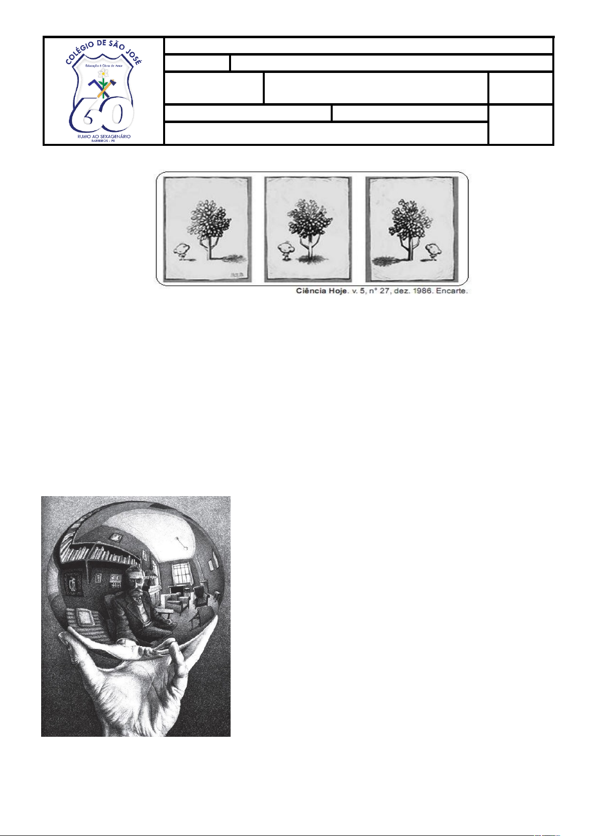 ATIVIDADE ESCOLAR NO ANO LETIVO DE 2023 Nome do Aluno(a) Nº DATA TIPO DE ATIVIDADE ( ) Exercício ( X ) Avaliação ( ) Outra Ano Disciplina: Professor: Nota LEIA COM MUITA ATENÇÃO E BOA PROVA! Teste de Física 1- Os quadrinhos mostram, por meio da projeção da sombra da árvore e do menino, a sequência de períodos do dia: matutino, meio-dia e vespertino, que é determinada a) pela posição vertical da árvore e do menino. b) pela posição do menino em relação à árvore. c) pelo fuso horário específico de cada ponto da superfície da Terra. d) pela estação do ano, sendo que no inverno os dias são mais curtos que no verão. e) pelo movimento aparente do Sol em torno da Terra. 2- Os faróis de 2 carros que se movimentam em uma estrada emitem feixes de luz. Em certo instante, os faróis se interceptam. O que acontece após o cruzamento dos feixes? 3- A ilustração representa uma das mais conhecidas obras do artista gráfico holandês M. C. Escher. Seu trabalho tem como características as figuras geométricas e ilusões de óptica. Pelas características da imagem formada na gravura, o artista representou um espelho esférico do tipo a) côncavo, devido às imagens formadas por este espelho serem todas virtuais, ou seja, formadas pelo cruzamento dos raios de luz refletidos pela esfera. b) côncavo, pois as imagens são direitas, indicando que todos os objetos visualizados estão entre o foco e o espelho. c) convexo, devido ao pequeno campo de visão, não é possível observar todos os detalhes do local onde se encontra o artista. d) convexo, pois as imagens são formadas pelo cruzamento dos raios de luz refletidos pela esfera, por isso as imagens são direitas e não invertidas. e) convexo, pois as imagens de todos os objetos, formadas na esfera, inclusive a do artista, não são reais. 3- (Enem 2017) No hemisfério Sul, o solstício de verão (momento em que os raios solares incidem verticalmente sobre quem se encontra sobre o Trópico de Capricórnio) ocorre no dia 21 ou 23 de dezembro. Nessa data, o dia tem o maior período de presença de luz solar. A figura mostra a trajetória da luz solar nas proximidades do planeta Terra quando ocorre o fenômeno óptico que possibilita que o Sol seja visto por mais tempo pelo observador. Representação de fenômeno óptico que possibilita que o Sol seja visto por observador. Qual é o fenômeno óptico mostrado na figura? a) A refração da luz solar ao atravessar camadas de ar com diferentes densidades. b) A polarização da luz solar ao incidir sobre a superfície dos oceanos. c) A reflexão da luz solar nas camadas mais altas da ionosfera. d) A difração da luz solar ao contornar a superfície da Terra. e) O espalhamento da luz solar ao atravessar a atmosfera. 5- Um objeto é colocado a 10 cm de um espelho esférico convexo, e a sua imagem é formada 12 cm à frente do vértice desse espelho. O aumento linear transversal produzido é de: (calculo na folha) a) +1,2 b) +1,5 c) -0,8 d) -1,0 e) -1,2 6- Com relação às características das imagens formadas pela reflexão regular da luz por espelhos planos. 7- Durante a compra de sapatos novos em uma sapataria renomada na cidade, a jovem Camilla posta-se defronte a um espelho plano fixado a uma parede para observar atentamente sua nova aquisição. Em dado momento, ela afasta-se perpendicularmente ao espelho a uma velocidade constante de 0,50 m/s. Com base nessas informações, analise as assertivas a seguir: I - O módulo da velocidade de afastamento da imagem em relação ao espelho é 0,25 m/s. II - O módulo da velocidade de afastamento da imagem em relação ao espelho é 0,50 m/s. III - O módulo da velocidade de afastamento da imagem em relação ao espelho é 1,00 m/s. IV - O módulo da velocidade de afastamento da imagem em relação a jovem é 0,50 m/s. V - O módulo da velocidade de afastamento da imagem em relação a jovem é 1,00 m/s. VI - O módulo da velocidade de afastamento da imagem em relação a jovem é 1,50 m/s. É correto apenas o que se afirma em: a) I e IV b) III e IV c) II e V d) II, IV e VI e) III, V e VI 8- Considere um espelho esférico convexo utilizado em um ponto de observação estratégico para melhorar a visibilidade em uma curva fechada de uma estrada. Um carro se aproxima dessa curva e é observado através do espelho e, à medida que o carro se afasta do espelho, sua imagem a) se torna real e maior. b) permanece virtual e direita, mas aumenta de tamanho. c) permanece virtual e direita, mas diminui de tamanho. d) se torna invertida e diminui de tamanho. image5.png image1.png image2.jpeg image3.jpeg image4.png