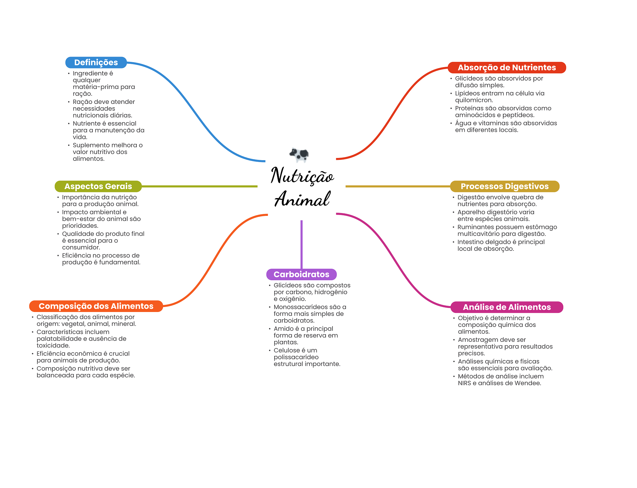 Definições Absorção de Nutrientes Ingrediente é qualquer Glicídeos são absorvidos por matéria-prima para difusão simples. ração. Lipídeos entram na célula via Ração deve atender quilomícron. necessidades Proteínas são absorvidas como nutricionais diárias. aminoácidos e peptídeos. Nutriente é essencial Água e vitaminas são absorvidas para a manutenção da em diferentes locais. vida. Suplemento melhora valor nutritivo dos alimentos. Nutrição Aspectos Gerais Processos Digestivos Importância da nutrição Animal Digestão envolve quebra de para a produção animal. nutrientes para absorção. Impacto ambiental e Aparelho digestório varia bem-estar do animal são entre espécies animais. prioridades. Ruminantes possuem estômago Qualidade do produto final multicavitário para digestão. é essencial para Intestino delgado é principal consumidor. local de absorção. Eficiência no processo de produção é fundamental. Carboidratos Glicídeos são compostos por carbono, hidrogênio e oxigênio. Composição dos Alimentos Monossacarídeos são a Análise de Alimentos Classificação dos alimentos por forma mais simples de carboidratos. Objetivo é determinar a origem: vegetal, animal, mineral. composição química dos Características incluem Amido é a principal alimentos. forma de reserva em palatabilidade e ausência de plantas. Amostragem deve ser toxicidade. Celulose é um representativa para resultados Eficiência econômica é crucial precisos. para animais de produção. polissacarídeo estrutural importante. Análises químicas e físicas Composição nutritiva deve ser são essenciais para avaliação. balanceada para cada espécie. Métodos de análise incluem NIRS e análises de Wendee.