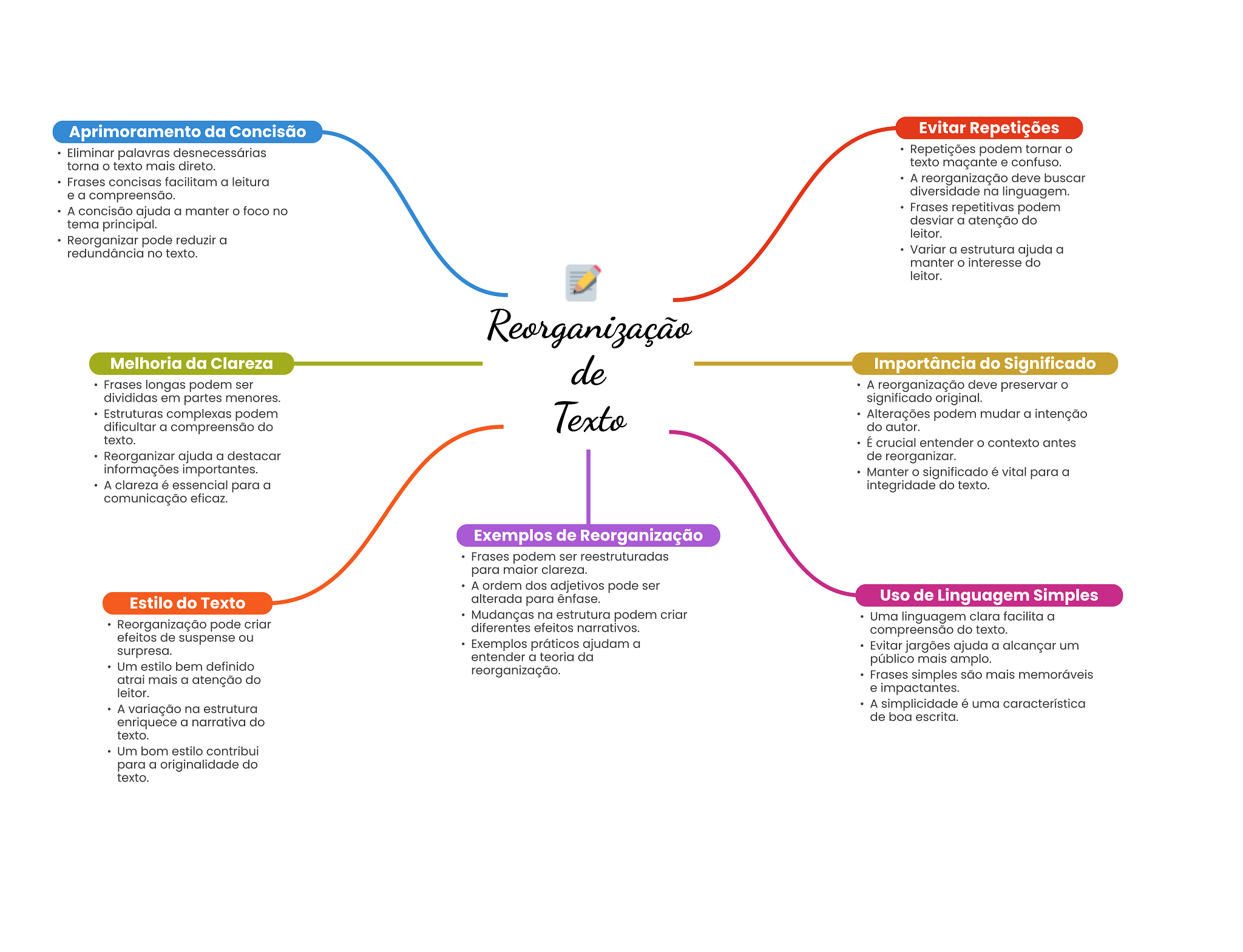 Aprimoramento da Concisão Evitar Repetições Eliminar palavras desnecessárias Repetições podem tornar torna texto mais direto. texto maçante e confuso. Frases concisas facilitam a leitura A reorganização deve buscar e a compreensão. diversidade na linguagem. A concisão ajuda a manter foco no Frases repetitivas podem tema principal. desviar a atenção do leitor. Reorganizar pode reduzir a redundância no texto. Variar a estrutura ajuda a manter interesse do leitor. Reorganização Melhoria da Clareza de Importância do Significado Frases longas podem ser A reorganização deve preservar divididas em partes menores. significado original. Estruturas complexas podem dificultar a compreensão do Texto Alterações podem mudar a intenção do autor. texto. É crucial entender O contexto antes Reorganizar ajuda a destacar de reorganizar. informações importantes. Manter significado é vital para a A clareza é essencial para a integridade do texto. comunicação eficaz. Exemplos de Reorganização Frases podem ser reestruturadas para maior clareza. A ordem dos adjetivos pode ser Estilo do Texto alterada para ênfase. Uso de Linguagem Simples Mudanças na estrutura podem criar Uma linguagem clara facilita a Reorganização pode criar diferentes efeitos narrativos. compreensão do texto. efeitos de suspense ou Exemplos práticos ajudam a surpresa. Evitar jargões ajuda a alcançar um entender a teoria da Um estilo bem definido público mais amplo. reorganização. atrai mais a atenção do Frases simples são mais memoráveis leitor. e impactantes. A variação na estrutura A simplicidade é uma característica enriquece a narrativa do de boa escrita. texto. Um bom estilo contribui para a originalidade do texto.
