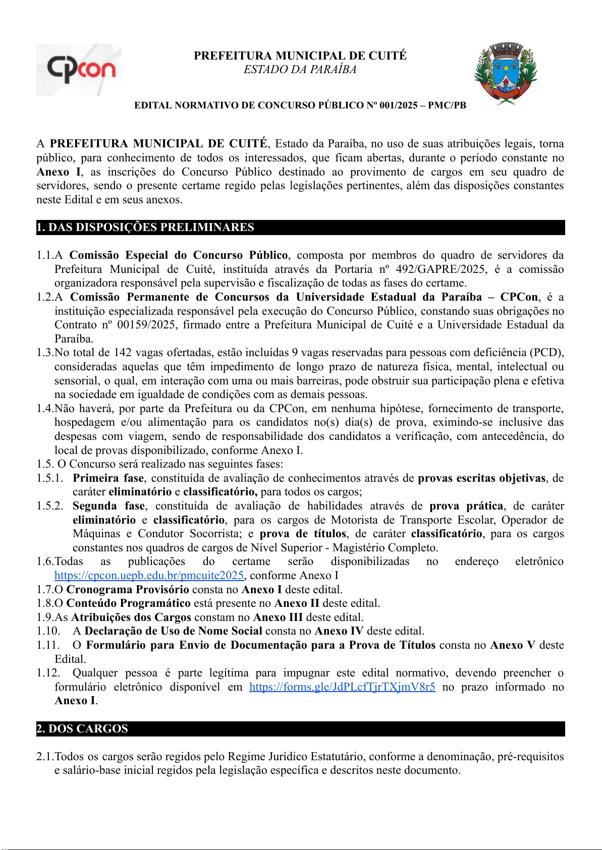pcimarkpci MDAwMDowMDAwOjAwMDA6MDAwMDowMDAwOmZmZmY6YzkxNDo3ZjFh:U3VuLCAyMSBEZWMgMjAyNSAwNjo1NToyNiAtMDMwMA== www.pciconcursos.com.br PREFEITURA MUNICIPAL DE CUITÉ ESTADO DA PARAÍBA EDITAL NORMATIVO DE CONCURSO PÚBLICO Nº 001/2025 – PMC/PB A PREFEITURA MUNICIPAL DE CUITÉ, Estado da Paraíba, no uso de suas atribuições legais, torna público, para conhecimento de todos os interessados, que ficam abertas, durante o período constante no Anexo I, as inscrições do Concurso Público destinado ao provimento de cargos em seu quadro de servidores, sendo o presente certame regido pelas legislações pertinentes, além das disposições constantes neste Edital e em seus anexos. 1. DAS DISPOSIÇÕES PRELIMINARES 1.1. A Comissão Especial do Concurso Público, composta por membros do quadro de servidores da Prefeitura Municipal de Cuité, instituída através da Portaria nº 492/GAPRE/2025, é a comissão organizadora responsável pela supervisão e fiscalização de todas as fases do certame. 1.2. A Comissão Permanente de Concursos da Universidade Estadual da Paraíba – CPCon, é a instituição especializada responsável pela execução do Concurso Público, constando suas obrigações no Contrato nº 00159/2025, firmado entre a Prefeitura Municipal de Cuité e a Universidade Estadual da Paraíba. 1.3. No total de 142 vagas ofertadas, estão incluídas 9 vagas reservadas para pessoas com deficiência (PCD), consideradas aquelas que têm impedimento de longo prazo de natureza física, mental, intelectual ou sensorial, o qual, em interação com uma ou mais barreiras, pode obstruir sua participação plena e efetiva na sociedade em igualdade de condições com as demais pessoas. 1.4. Não haverá, por parte da Prefeitura ou da CPCon, em nenhuma hipótese, fornecimento de transporte, hospedagem e/ou alimentação para os candidatos no(s) dia(s) de prova, eximindo-se inclusive das despesas com viagem, sendo de responsabilidade dos candidatos a verificação, com antecedência, do local de provas disponibilizado, conforme Anexo I. 1.5. O Concurso será realizado nas seguintes fases: 1.5.1. Primeira fase, constituída de avaliação de conhecimentos através de provas escritas objetivas, de caráter eliminatório e classificatório, para todos os cargos; 1.5.2. Segunda fase, constituída de avaliação de habilidades através de prova prática, de caráter eliminatório e classificatório, para os cargos de Motorista de Transporte Escolar, Operador de Máquinas e Condutor Socorrista; e prova de títulos, de caráter classificatório, para os cargos constantes nos quadros de cargos de Nível Superior - Magistério Completo. 1.6. Todas as publicações do certame serão disponibilizadas no endereço eletrônico https://cpcon.uepb.edu.br/pmcuite2025, conforme Anexo I 1.7. O Cronograma Provisório consta no Anexo I deste edital. 1.8. O Conteúdo Programático está presente no Anexo II deste edital. 1.9. As Atribuições dos Cargos constam no Anexo III deste edital. 1.10. A Declaração de Uso de Nome Social consta no Anexo IV deste edital. 1.11. O Formulário para Envio de Documentação para a Prova de Títulos consta no Anexo V deste Edital. 1.12. Qualquer pessoa é parte legítima para impugnar este edital normativo, devendo preencher o formulário eletrônico disponível em https://forms.gle/JdPLcfTjrTXjmV8r5 no prazo informado no Anexo I. 2. DOS CARGOS 2.1. Todos os cargos serão regidos pelo Regime Jurídico Estatutário, conforme a denominação, pré-requisitos e salário-base inicial regidos pela legislação específica e descritos neste documento. pcimarkpci MDAwMDowMDAwOjAwMDA6MDAwMDowMDAwOmZmZmY6YzkxNDo3ZjFh:U3VuLCAyMSBEZWMgMjAyNSAwNjo1NToyNiAtMDMwMA== www.pciconcursos.com.br 2.2. Os cargos oferecidos, número de vagas destinadas à ampla concorrência, requisito mínimo, jornada de trabalho e vencimento básico estão discriminados nos quadros abaixo. CARGOS DE NÍVEL FUNDAMENTAL INCOMPLETO Nº CARGO VAGAS (AC) VAGAS (PCD) REQUISITO MÍNIMO JORNADA DE TRABALHO VENCIMENTO BÁSICO 01 Auxiliar de Serviços Gerais 11 01 Ensino Fundamental Incompleto 40h R$1.518,00 02 Copeiro 02 - Ensino Fundamental Incompleto 40h R$1.518,00 03 Cozinheiro/Merendeiro 02 - Ensino Fundamental Incompleto + Cursos básicos de profissionalização que variam de duzentas a quatrocentas horas, ou experiência equivalente 40h R$1.518,00 04 Limpador de Mato 01 - Ensino Fundamental Incompleto 40h R$1.518,00 CARGOS DE NÍVEL FUNDAMENTAL COMPLETO Nº CARGO VAGAS (AC) VAGAS (PCD) REQUISITO MÍNIMO JORNADA DE TRABALHO VENCIMENTO BÁSICO 05 Motorista de Transporte Escolar 03 - Ensino Fundamental Completo + Carteira Nacional de Habilitação (CNH) categoria D + Curso Básico de Qualificação em Transporte de Escolares 40h R$1.745,50 06 Operador de Máquinas 01 - Ensino Fundamental Completo + Carteira Nacional de Habilitação (CNH) categoria D + Experiência de 2 (dois) anos na função e curso ministrado pelo fornecedor da máquina ou por entidades reconhecida por órgão competente 40h R$2.000,00 07 Porteiro 02 - Ensino Fundamental Completo 40h R$1.518,00 08 Vigilante 04 01 Ensino Fundamental Completo 40h R$1.518,00 2 de 25 pcimarkpci MDAwMDowMDAwOjAwMDA6MDAwMDowMDAwOmZmZmY6YzkxNDo3ZjFh:U3VuLCAyMSBEZWMgMjAyNSAwNjo1NToyNiAtMDMwMA== www.pciconcursos.com.br CARGOS DE NÍVEL MÉDIO/TÉCNICO COMPLETO Nº CARGO VAGAS (AC) VAGAS (PCD) REQUISITO MÍNIMO JORNADA DE TRABALHO VENCIMENTO BÁSICO 09.1 Agente Comunitário de Saúde* (Área 001 - USF Abílio Chacon Filho) 01 - Ensino Médio completo + Curso de Formação Inicial de Agente Comunitário de Saúde, com carga horária mínima de 40h (art. 6º, inciso II, da Lei Federal nº 11.350/2006) e residência na área da comunidade em que atuar, desde a data de publicação do Edital (art. 6º, inciso I, da Lei Federal nº 11.350/2006) 40h R$3.036,00 09.2 Agente Comunitário de Saúde* (Área 003 - USF Ezequias Venâncio dos Santos) 01 - 09.3 Agente Comunitário de Saúde* (Á