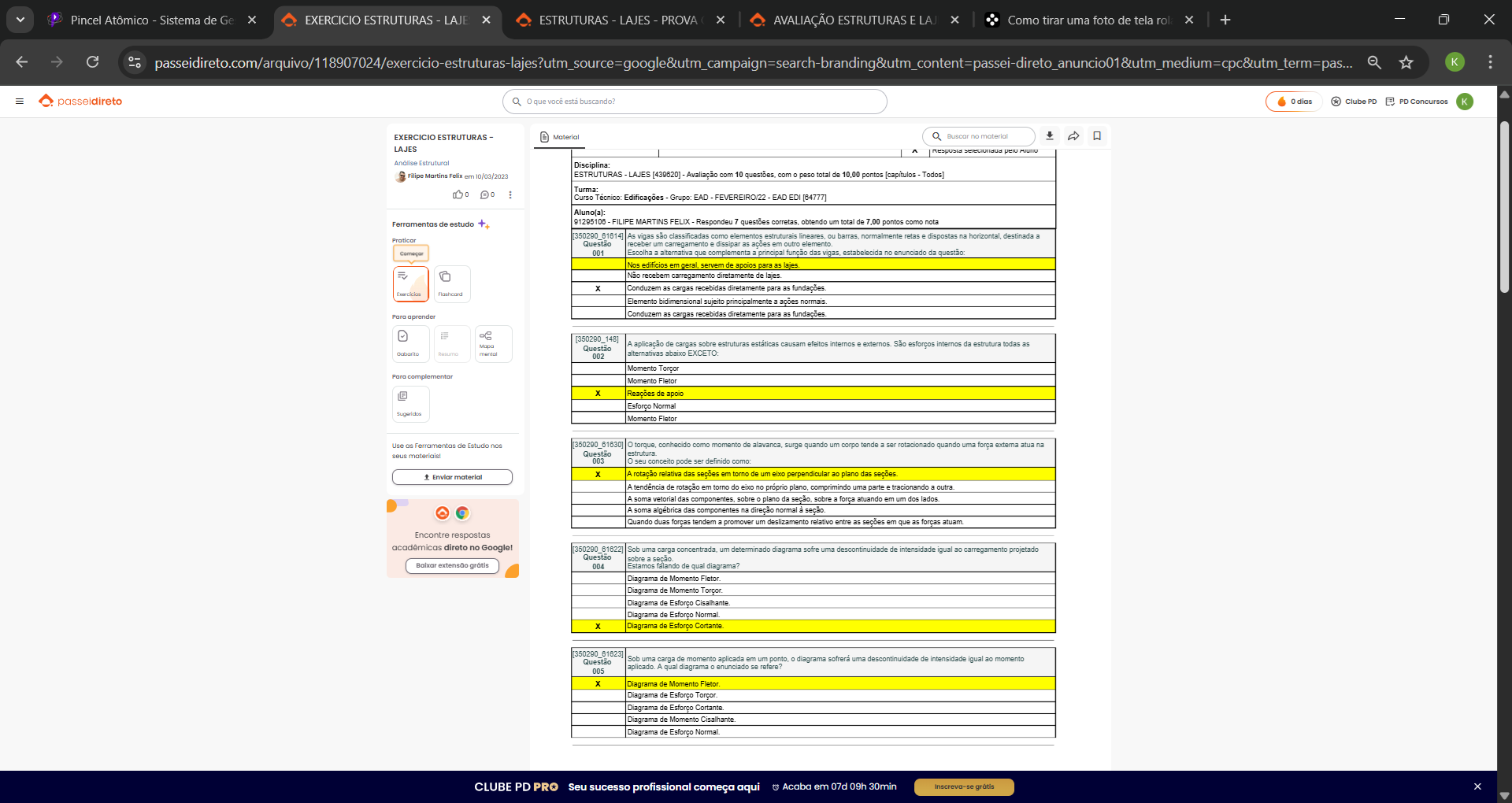 Pincel Atômico Sistema de Ge EXERCICIO ESTRUTURAS LAJE ESTRUTURAS LAJES PROVA AVALIAÇÃO ESTRUTURAS E Como tirar uma foto de tela + X - passeidireto você está buscando? * Clube PD PD Concursos EXERCICIO ESTRUTURAS Material Buscar no material LAJES ^ pero Estrutural Disciplina: Filipe Martins em 10/03/2023 ESTRUTURAS LAJES [439620] Avaliação com 10 com peso total de 10,00 pontos (capitulos Todos] Turma: 0 0 : Curso Edificações Grupo: EAD FEVEREIRO/22 EAD EDI [64777] Aluno(a): Ferramentas de estudo 91295106 FILIPE MARTINS FELIX Respondeu questões obtendo um total de 7.00 pontos como nota As vigas são classificadas como elementos estruturais ou normalmente retas e dispostas na destinada a Questão receber um carregamento e dissipar as ações em outro 001 Escolha alternativa que complementa a principal função das vigas, estabelecida no enunciado da questão: Nos em geral, servem de apoios para as Não recebem carregamento diretamente de Conduzem as cargas recebidas diretamente para as fundações Flashcard Elemento bidimensional sujeito principalmente a ações Para aprender Conduzem as cargas recebidas diretamente para as 148] Mapa Questão A aplicação de cargas sobre estruturas estáticas causam efeitos internos e São esforços internos da estrutura todas as mental 002 alternativas abaixo EXCETO: Momento Torçor Para complementar Momento Fletor Reações de apoio Esforço Normal Sugeridos Momento Fletor Use as de Estudo nos 350290 conhecido como momento de alavanca, surge quando um corpo tende ser rotacionado quando uma força atua na seus Questão 003 seu conceito pode ser definido como: Enviar material X A rotação relativa das seções em torno de um eixo perpendicular ao plano das seções A tendência de rotação em torno do exo no plano, comprimindo uma parte tracionando A soma vetorial das sobre plano da seção, sobre força atuando em um dos lados. A soma algébrica das componentes na direção normal seção. Quando duas forças tendem promover um deslizamento relativo entre as seções em que as forças Encontre respostas acadêmicas direto no Google! 350290 616221 Sob uma carga concentrada, um determinado diagrama sofre uma descontinuidade de intensidade igual ao carregamento projetado Questão sobre Baixar extensão 004 Estamos falando de qual diagrama? Diagrama de Momento Fletor Diagrama de Momento Torçor. Diagrama de Esforço Cisalhante Diagrama de Esforço Normal X Diagrama de Esforço Cortante 350290 616231 Questão Sob uma carga de momento aplicada em um ponto, diagrama sofrerá uma descontinuidade de intensidade igual ao momento A qual diagrama enunciado se refere? 005 X Diagrama de Momento Fletor Diagrama de Esforço Torçor. Diagrama de Esforço Cortante Diagrama de Momento Cisalhante Diagrama de Esforço Normal CLUBE PD PRO Seu sucesso profissional começa aqui Acaba em 07d 09h 30min