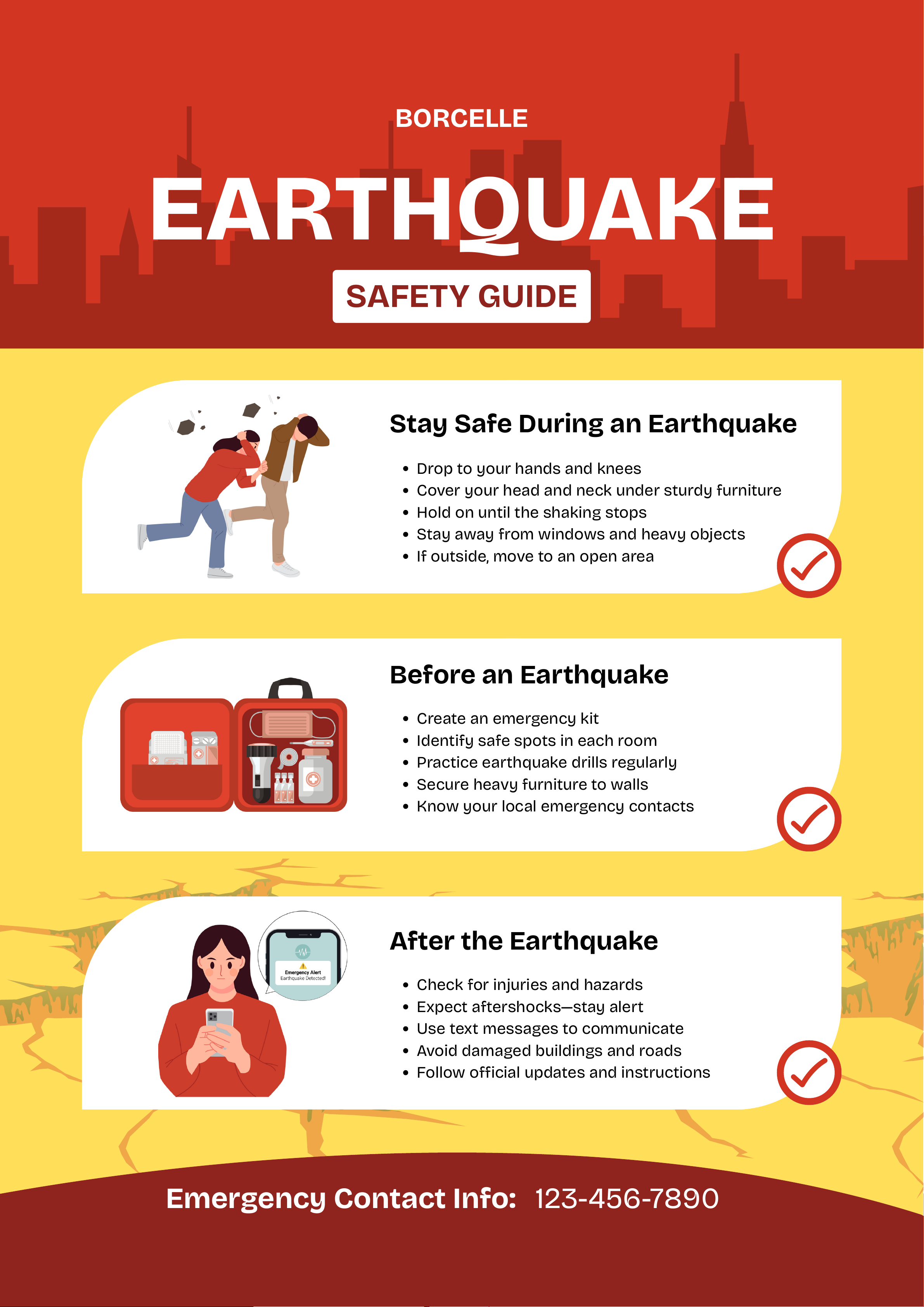 Drop to your hands and knees Cover your head and neck under sturdy furniture Hold on until the shaking stops Stay away from windows and heavy objects If outside, move to an open area Create an emergency kit Identify safe spots in each room Practice earthquake drills regularly Secure heavy furniture to walls Know your local emergency contacts Check for injuries and hazards Expect aftershocks—stay alert Use text messages to communicate Avoid damaged buildings and roads Follow official updates and instructions Stay Safe During an Earthquake EARTHQUAKE Before an Earthquake After the Earthquake SAFETY GUIDE BORCELLE Emergency Contact Info: 123-456-7890