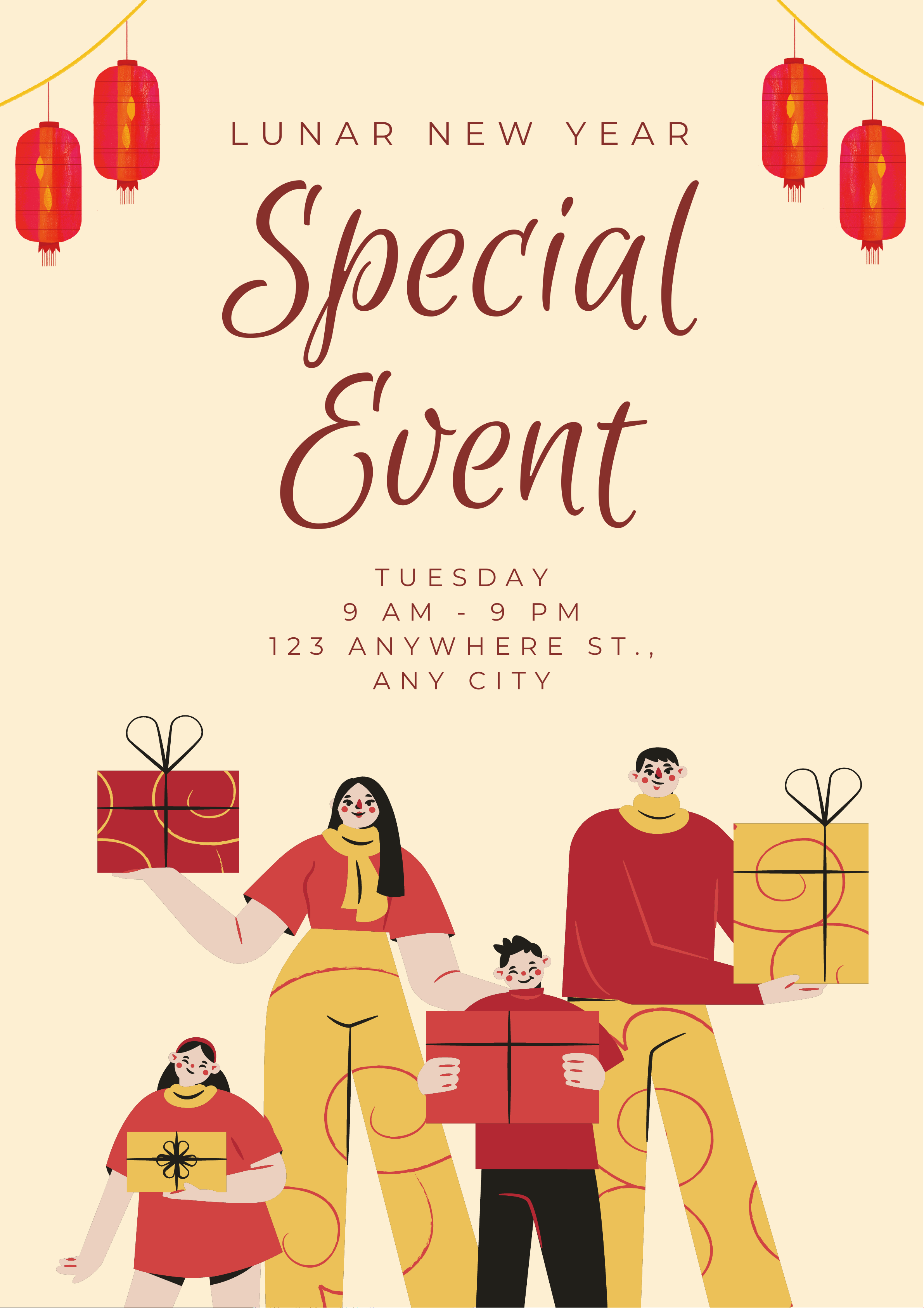 Special Event L U N A R N E W Y E A R T U E S D A Y 9 A M - 9 P M 1 2 3 A N Y W H E R E S T . , A N Y C I T Y