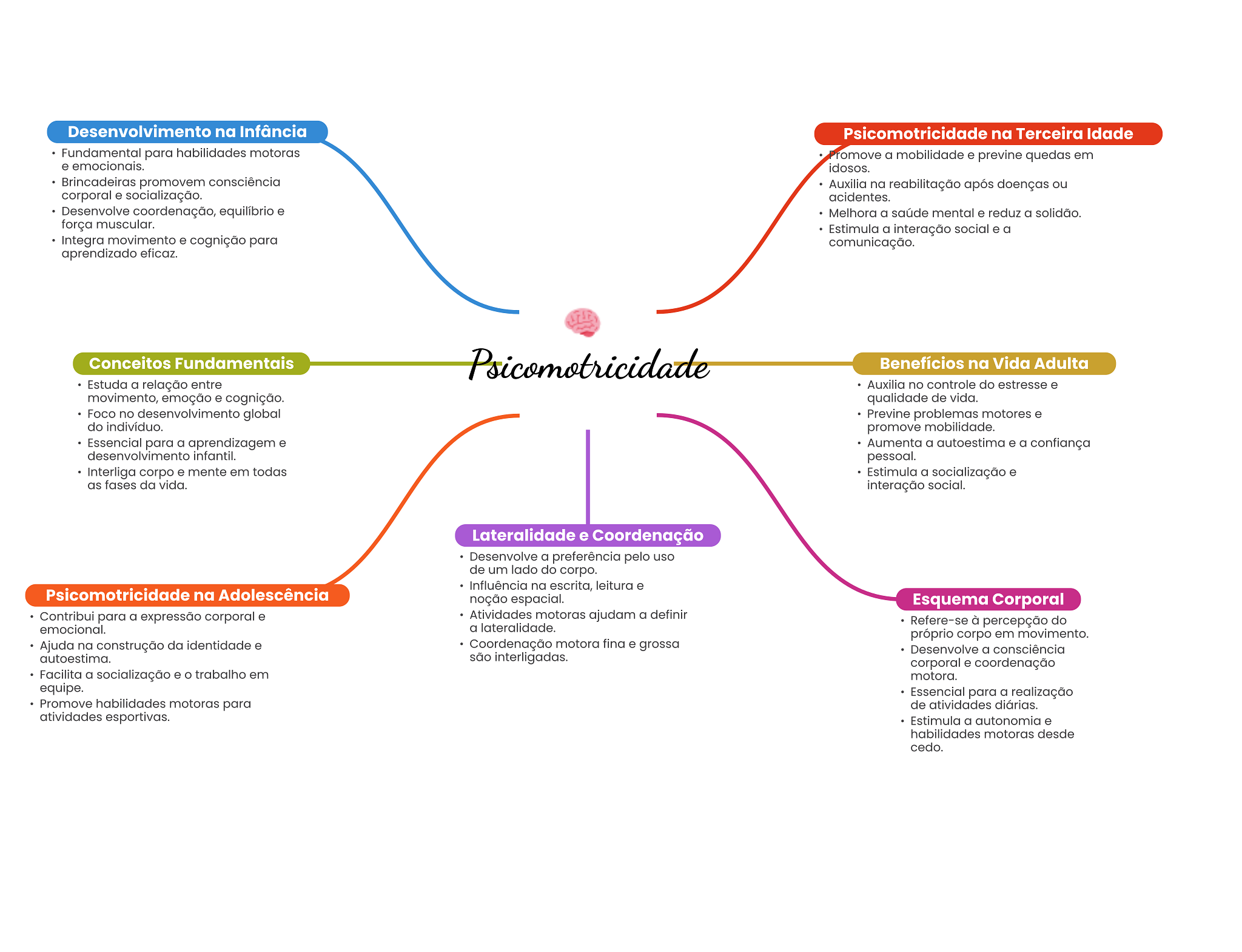 Desenvolvimento na Infância Psicomotricidade na Terceira Idade Fundamental para habilidades motoras romove a mobilidade e previne quedas em e emocionais. idosos. Brincadeiras promovem consciência Auxilia na reabilitação após doenças ou corporal e socialização. acidentes. Desenvolve coordenação, equilíbrio e Melhora a saúde mental e reduz a solidão. força muscular. Estimula a interação social e a Integra movimento e cognição para comunicação. aprendizado eficaz. Conceitos Fundamentais Psicomotricidade Benefícios na Vida Adulta Estuda a relação entre Auxilia no controle do estresse e movimento, emoção e cognição. qualidade de vida. Foco no desenvolvimento global Previne problemas motores e do indivíduo. promove mobilidade. Essencial para a aprendizagem e Aumenta a autoestima e a confiança desenvolvimento infantil. pessoal. Interliga corpo e mente em todas Estimula a socialização e as fases da vida. interação social. Lateralidade e Coordenação Desenvolve a preferência pelo uso de um lado do corpo. Influência na escrita, leitura e Psicomotricidade na Adolescência noção espacial. Esquema Corporal Contribui para a expressão corporal e Atividades motoras ajudam a definir a lateralidade. Refere-se à percepção do emocional. próprio corpo em movimento. Ajuda na construção da identidade e Coordenação motora fina e grossa Desenvolve a consciência autoestima. são interligadas. corporal e coordenação Facilita a socialização e trabalho em motora. equipe. Essencial para a realização Promove habilidades motoras para de atividades diárias. atividades esportivas. Estimula a autonomia e habilidades motoras desde cedo.