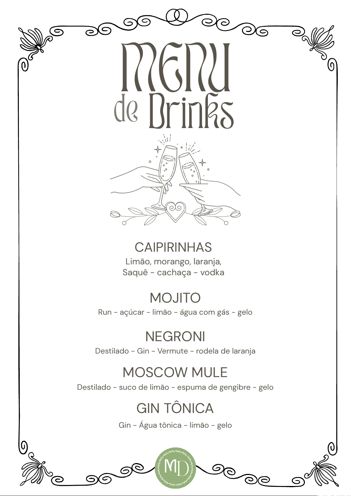 MD MENU de Drinks CAIPIRINHAS Limão, morango, laranja, Saquê - cachaça - vodka MOJITO Run - açúcar - limão - água com gás - gelo NEGRONI Destilado - Gin - Vermute - rodela de laranja MOSCOW MULE Destilado - suco de limão - espuma de gengibre - gelo GIN TÔNICA Gin - Água tônica - limão - gelo