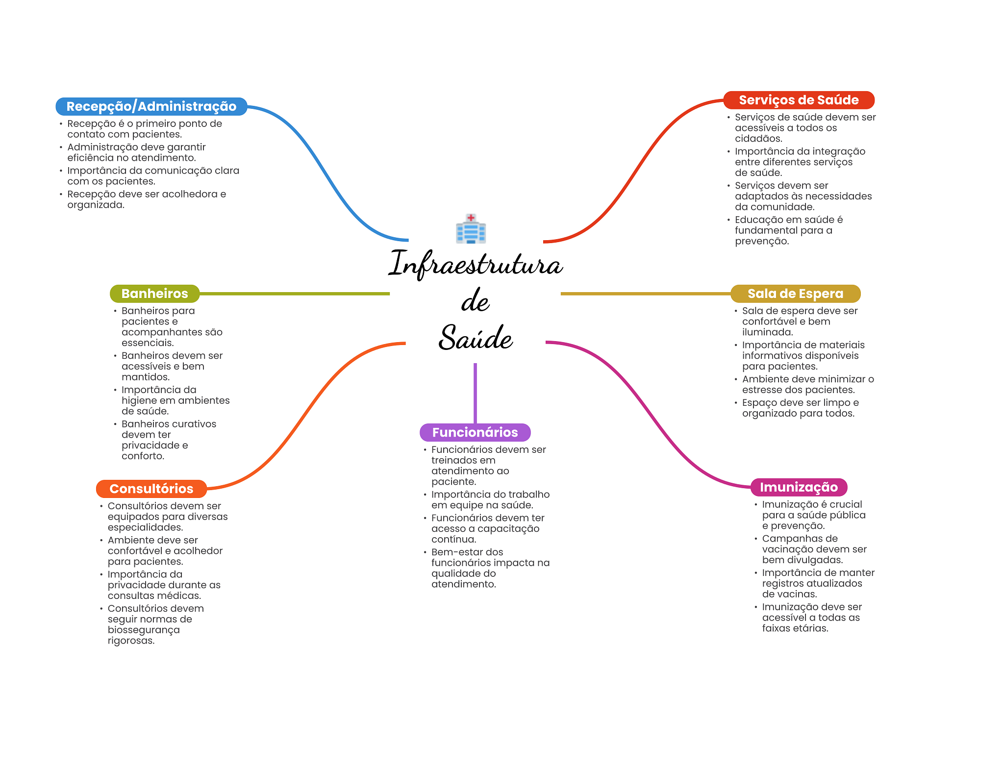 Serviços de Saúde Serviços de saúde devem ser Recepção é primeiro ponto de acessíveis a todos contato com pacientes. cidadãos. Administração deve garantir Importância da integração eficiência no atendimento. entre diferentes serviços Importância da comunicação clara de saúde. com pacientes. Serviços devem ser Recepção deve ser acolhedora e adaptados às necessidades organizada. da comunidade. Educação em saúde é fundamental para a prevenção. Infraestrutura Banheiros de Sala de Espera Banheiros para Sala de espera deve ser pacientes e confortável e bem acompanhantes são essenciais. Saúde iluminada. Importância de materiais Banheiros devem ser informativos disponíveis acessíveis e bem para pacientes. mantidos. Ambiente deve minimizar Importância da estresse dos pacientes. higiene em ambientes Espaço deve ser limpo e de saúde. organizado para todos. Banheiros curativos devem ter Funcionários privacidade e Funcionários devem ser conforto. treinados em atendimento ao paciente. Consultórios Imunização Importância do trabalho Consultórios devem ser em equipe na saúde. Imunização é crucial equipados para diversas Funcionários devem ter para a saúde pública especialidades. acesso a capacitação e prevenção. Ambiente deve ser contínua. Campanhas de confortável e acolhedor Bem-estar dos vacinação devem ser para pacientes. funcionários impacta na bem divulgadas. Importância da qualidade do Importância de manter privacidade durante as atendimento. registros atualizados consultas médicas. de vacinas. Consultórios devem Imunização deve ser seguir normas de acessível a todas as biossegurança faixas etárias. rigorosas.