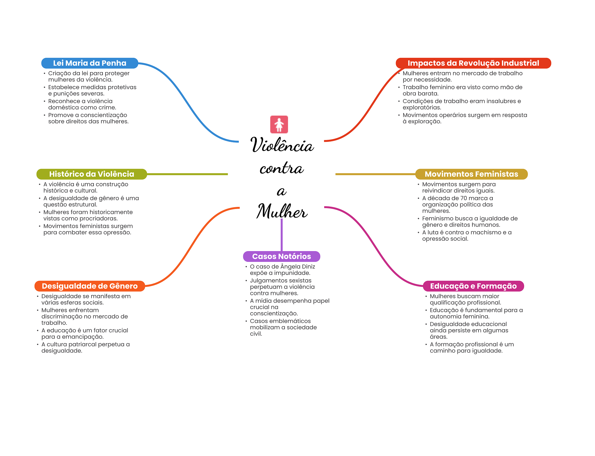 Lei Maria da Penha Impactos da Revolução Industrial Criação da lei para proteger Mulheres entram no mercado de trabalho mulheres da violência. por necessidade. Estabelece medidas protetivas Trabalho feminino era visto como mão de e punições severas. obra barata. Reconhece a violência Condições de trabalho eram insalubres e doméstica como crime. exploratórias. Promove a conscientização Movimentos operários surgem em resposta sobre direitos das mulheres. à exploração. Violência contra Histórico da Violência Movimentos Feministas A violência é uma construção Movimentos surgem para histórica e cultural. a reivindicar direitos iguais. A desigualdade de gênero é uma A década de 70 marca a questão estrutural. Mulher organização política das Mulheres foram historicamente mulheres. vistas como procriadoras. Feminismo busca a igualdade de Movimentos feministas surgem gênero e direitos humanos. para combater essa opressão. A luta é contra machismo e a opressão social. Casos Notórios caso de Ângela Diniz expõe a impunidade. Julgamentos sexistas Desigualdade de Gênero perpetuam a violência Educação e Formação contra mulheres. Desigualdade se manifesta em Mulheres buscam maior várias esferas sociais. A mídia desempenha papel qualificação profissional. crucial na Mulheres enfrentam conscientização. Educação é fundamental para a discriminação no mercado de autonomia feminina. trabalho. Casos emblemáticos mobilizam a sociedade Desigualdade educacional A educação é um fator crucial civil. ainda persiste em algumas para a emancipação. áreas. A cultura patriarcal perpetua a A formação profissional é um desigualdade. caminho para igualdade.