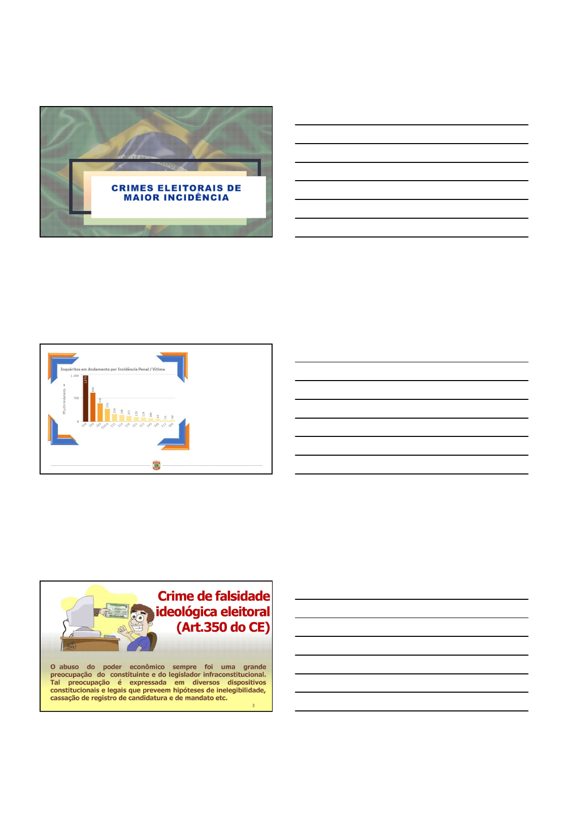 24/08/2022 1 2 O gráfico ao lado representa a quantidade de Inquéritos policiais em andamento no ano de 2022 que apuram crimes eleitorais, separados por tipo penal. Observe que os tipos penais eleitorais com maior nº de inquéritos são: • 1º - Art. 350 do CE • 2º - Art.299 do CE • 3º - Art.289 do CE Crime de falsidade ideológica eleitoral (Art.350 do CE) O abuso do poder econômico sempre foi uma grande preocupação do constituinte e do legislador infraconstitucional. Tal preocupação é expressada em diversos dispositivos constitucionais e legais que preveem hipóteses de inelegibilidade, cassação de registro de candidatura e de mandato etc. 3 24/08/2022 2 Art. 350. Omitir, em documento público ou particular, declaração que dele devia constar, ou nele inserir ou fazer inserir declaração falsa ou diversa da que devia ser escrita, para fins eleitorais: Pena - reclusão até cinco anos e pagamento de 5 a 15 dias-multa, se o documento é público, e reclusão até três anos e pagamento de 3 a 10 dias- multa se o documento é particular. 4 5 OBSERVAÇÃO IMPORTANTE A maioria das investigações desse tipo penal(art.350 CE) se refere à prestação de contas eleitoral fraudulentas "Caixa 2 eleitoral" É a m o v i m e n t a ç ã o p a r a l e l a e c l a n d e s t in a d e r e c u r s o s n ã o c o n t a b i l i z a d o s o f i c i a l m e n t e , o b t i d o s d e m a n e i r a i r r e g u l a r e , m u i t a s v e z e s , c r i m i n o s a m e n t e , p a r a s e d e s t i n a r a d e s p e s a s e o u t r o s i n t e r e s s e s r e l a c i o n a d o s a u m a c a m p a n h a e l e i t o r a l . 6 Sob o ponto de vista penal, à mingua de um tipo penal específico, a conduta conhecida como "caixa 2 eleitoral" é tipificada como crime de falsidade ideológica eleitoral (art. 350, do Código Eleitoral) 24/08/2022 3 7 Para tentar minimizar o problema, a le i ele itora l vedou a real ização de doações de pessoas jurídicas para campanhas ele i torais E ESTIPULOU QUE AS DOAÇÕES DE PESSOAS FÍSICAS estão limitadas a 10 % (dez por cento) dos rendimentos brutos auferidos pelo doador no ano anterior à eleição. Corrupção eleitoral ou “compra de votos” Previsto no artigo 299 do Código Eleitoral: Dar, oferecer, prometer, solicitar ou receber, para si ou para outrem, dinheiro, dádiva ou qualquer outra vantagem, para obter ou dar voto e para conseguir ou prometer abstenção, ainda que a oferta não seja aceita: Pena – reclusão até 4 (quatro) anos e pagamento de 5 (cinco) a 15 (quinze) dias-multa. 8 9 24/08/2022 4 10 DAR OFERECER PROMETER SOLICITAR OU RECEBER dinheiro, dádiva ou qualquer outra vantagem é necessária a presença do dolo específico O u s e j a , p r o v a c a b a l e c o nv i nc e n t e d a i n t e nç ã o d e “ ob t e r ou da r v o t o ou p r ome t e r ab s t e nção ” conforme entendimento do Supremo Tribunal Federal (STF.Plenário. Inq 3693/PA, Rel. Min. Cármen Lúcia, julgado em 10/04/2014). Para a caracterização do delito de corrupção eleitoral ou “compra de votos” como ficou conhecido Além das condutas indicadas no artigo 299 O CRIME PODE SER COMETIDO POR QUALQUER PESSOA Ressalte-se que não há necessidade da efetiva entrega da vantagem para a consumação do delito, uma vez que o tipo penal prevê as condutas criminosas de “oferecer” “prometer” e “solicitar ”. inclusive por terceiro não candidato ENTRETANTO... 11 12 “(...) precisa o benefício ser concreto, individualizado, direcionado a uma ou mais pessoas determinadas, não configurando o delito promessas genéricas de campanha ocorridas em comícios ou mesmo através da televisão, quando não resulta evidenciado nem mesmo o compromisso da entrega da vantagem tendo como contraprestação o voto ou a abstenção. ” (GOMES, p. 244). Trata-se de delito formal, sua consumação se dá com o simples oferecimento da vantagem para obter ou dar voto e para conseguir ou prometer abstenção, ainda que haja recusa pelo eleitor, haja vista que o pagamento da vantagem é mero exaurimento do crime em questão. 24/08/2022 5 13 Essencialmente nesse tipo de investigação busca-se provar que o candidato, por si próprio ou pela interposta pessoa (cabo eleitoral ou correligionário) CESTA BÁSICA DINHEIRO PAGAMENTO DE CONTAS DE ENERGIA ELÉTRICA MATERIAIS DE CONSTRUÇÃO ETC... busca a obtenção de votos mediante a entrega, oferecimento ou promessa de qualquer vantagem Importante consignar que o art. 39 § 6º da Lei nº 9.504/97 PRESCREVE QUE É vedada na campanha eleitoral a confecção, utilização, distribuição por comitê, candidato ou com a sua autorização, de camisetas, chaveiros, bonés, canetas, brindes, cestas básicas ou quaisquer outros bens ou materiais que possam proporcionar vantagem ao eleitor. 14 15 Diante deste dispositivo legal, é preciso fazer uma diferenciação a doação de cesta básica ou qualquer outro adorno, mesmo que de pequeno valor, como: chinelo, bonés ou dentaduras, em troca de voto (caráter negocial), ainda que não haja aceitação do eleitor, caracterizará o crime. 24/08/2022 6 Uma das principais características da sociedade brasileira é a desigualdade social, por isso, em determinadas regiões de nosso país, onde a pobreza é mais acentuada, é comum a compra de votos por valores módicos (por exemplo, R$ 10,00) ou através de presentes de pequeno valor. a distribuição de brindes de campanha, tais como chaveiros, bandeiras, adesivos com finalidade meramente de propaganda eleitoral, não caracteriza o crime em questão, justamente por estar a faltar, nessa hipótese, o caráter negocial, que identifica o delito. Segundo (GOMES, p. 248) 16 17 DENÚNCIA MUITO COMUM DURANTE O PERÍODO ELEITORAL Geralmente a Polícia é informada que: Diversas pessoas estariam em um determinado posto de combustível abastecendo seus veículos, Se valendo de papéis conhecidos como "vales-combustível", assinados por candidatos ou repr