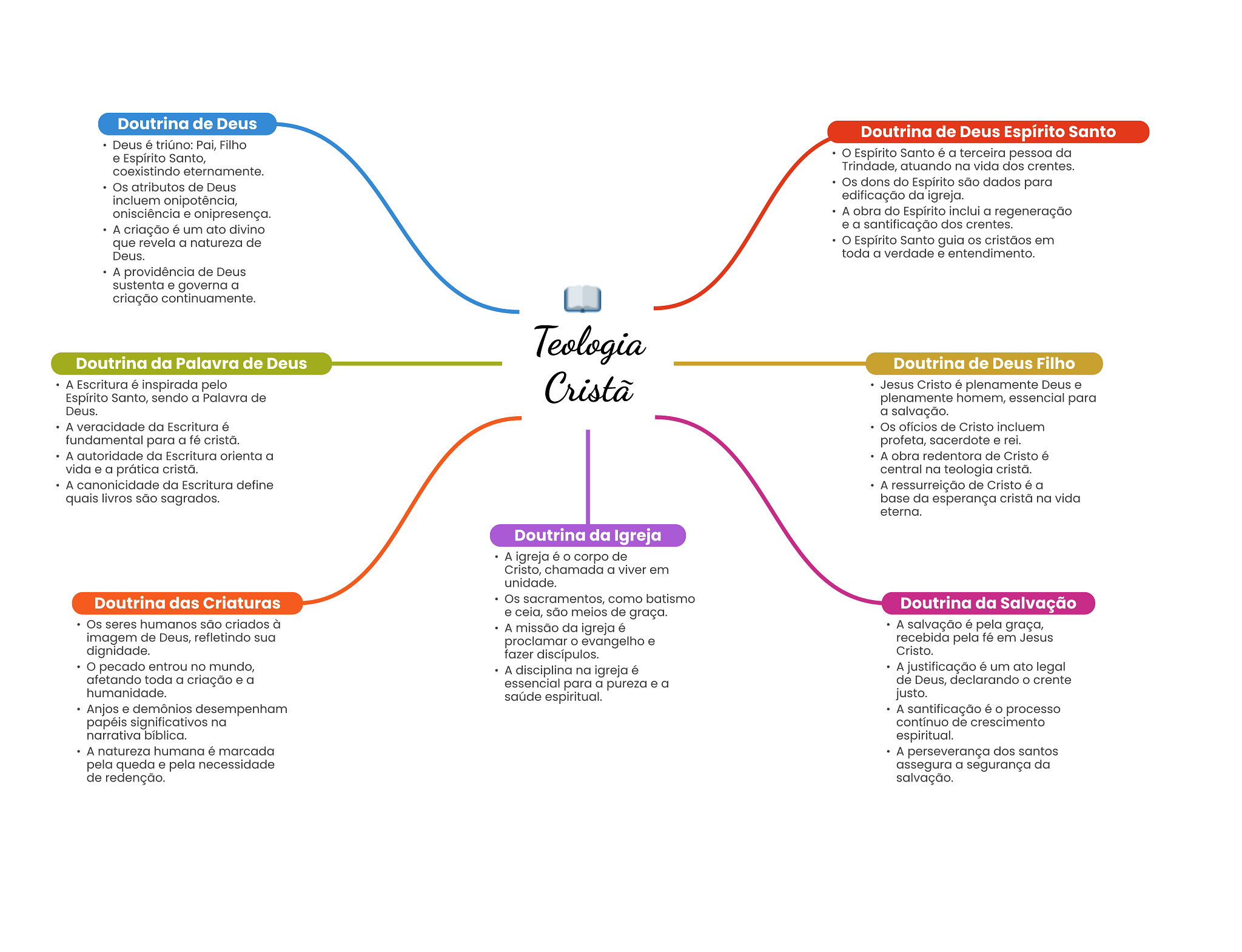 Doutrina de Deus Doutrina de Deus Espírito Santo Deus é triúno: Pai, Filho e Espírito Santo, Espírito Santo é a terceira pessoa da coexistindo eternamente. Trindade, atuando na vida dos crentes. Os atributos de Deus Os dons do Espírito são dados para incluem onipotência, edificação da igreja. onisciência e onipresença. A obra do Espírito inclui a regeneração A criação é um ato divino e a santificação dos crentes. que revela a natureza de O Espírito Santo guia cristãos em Deus. toda a verdade e entendimento. A providência de Deus sustenta e governa a criação continuamente. Teologia Doutrina da Palavra de Deus Doutrina de Deus Filho A Escritura é inspirada pelo Cristã Jesus Cristo é plenamente Deus e Espírito Santo, sendo a Palavra de plenamente homem, essencial para Deus. a salvação. A veracidade da Escritura é Os ofícios de Cristo incluem fundamental para a fé cristã. profeta, sacerdote e rei. A autoridade da Escritura orienta a A obra redentora de Cristo é vida e a prática cristã. central na teologia cristã. A canonicidade da Escritura define A ressurreição de Cristo é a quais livros são sagrados. base da esperança cristã na vida eterna. Doutrina da Igreja A igreja é corpo de Cristo, chamada a viver em unidade. Doutrina das Criaturas Os sacramentos, como batismo Doutrina da Salvação e ceia, são meios de graça. Os seres humanos são criados à A missão da igreja é A salvação é pela graça, imagem de Deus, refletindo sua proclamar evangelho e recebida pela fé em Jesus dignidade. fazer discípulos. Cristo. pecado entrou no mundo, A disciplina na igreja é A justificação é um ato legal afetando toda a criação e a essencial para a pureza e a de Deus, declarando crente humanidade. saúde espiritual. justo. Anjos e demônios desempenham A santificação é processo papéis significativos na contínuo de crescimento narrativa bíblica. espiritual. A natureza humana é marcada A perseverança dos santos pela queda e pela necessidade assegura a segurança da de redenção. salvação.