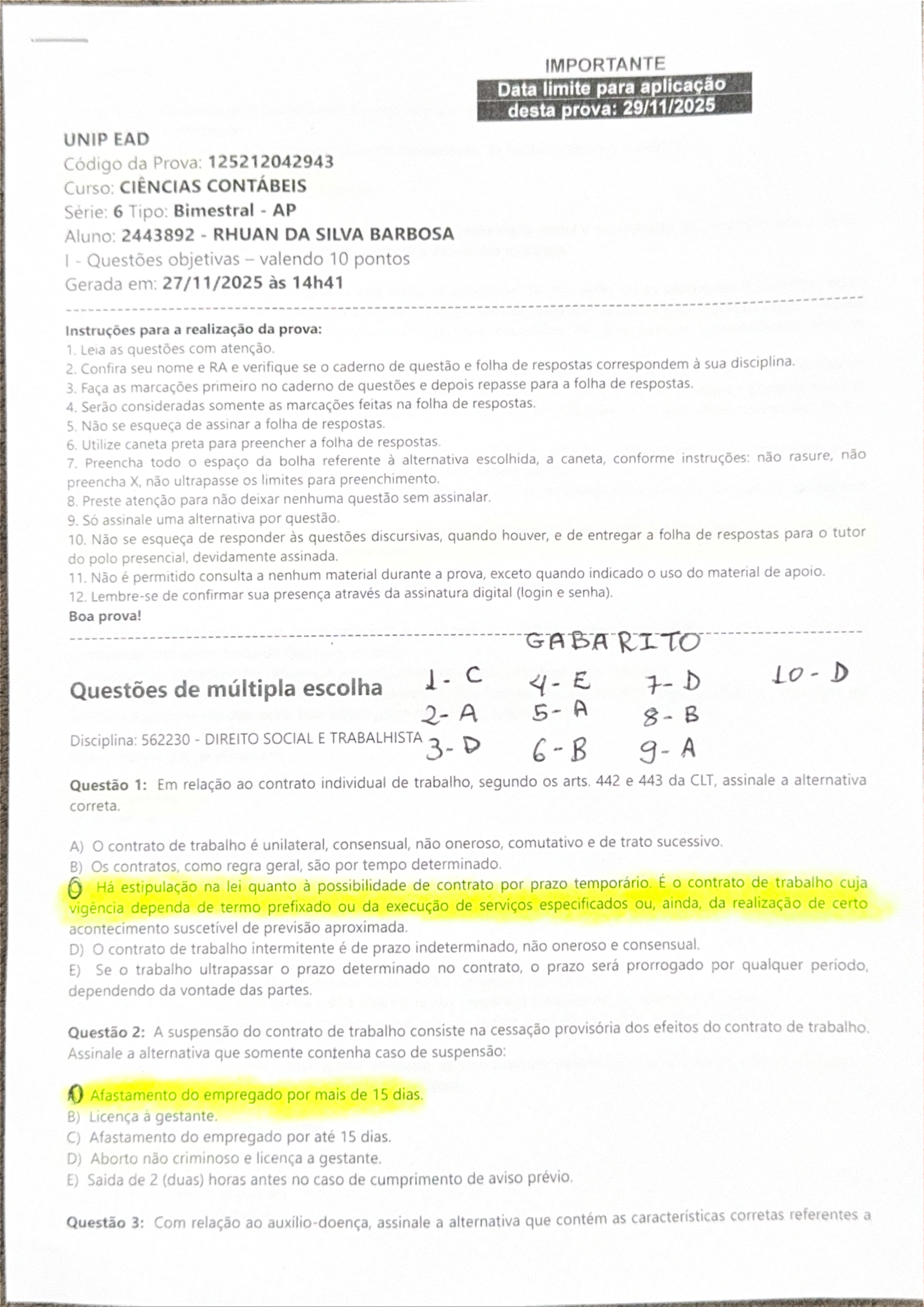 IMPORTANTE Data limite para aplicação desta prova: 29/11/2025 UNIP EAD Código da Prova: 125212042943 Curso: CIÊNCIAS CONTÁBEIS Série: 6 Tipo: Bimestral AP Aluno: 2443892 RHUAN DA SILVA BARBOSA Questões objetivas valendo 10 pontos Gerada em: 27/11/2025 às 14h41 Instruções para a realização da prova: 1. Leia as questões com atenção. 2. Confira seu nome e RA e verifique se caderno de questão e folha de respostas correspondem à sua disciplina. 3. Faça as marcações primeiro no caderno de questões e depois repasse para a folha de respostas. 4. Serão consideradas somente as marcações feitas na folha de respostas. 5. Não se esqueça de assinar a folha de respostas. 6. Utilize caneta preta para preencher a folha de respostas. 7. Preencha todo espaço da bolha referente à alternativa escolhida, a caneta, conforme instruções: não rasure, não preencha X, não ultrapasse os limites para preenchimento. 8. Preste atenção para não deixar nenhuma questão sem assinalar. 9. Só assinale uma alternativa por questão. 10. Não se esqueça de responder às questões discursivas, quando houver, e de entregar a folha de respostas para tutor do polo presencial, devidamente assinada. 11. Não é permitido consulta a nenhum material durante a prova, exceto quando indicado uso do material de apoio. 12. Lembre-se de confirmar sua presença através da assinatura digital (login e senha). Boa prova! GABARITO Questões de múltipla escolha 4-E 10 D 2- A 5-A 8-B Disciplina: 562230 DIREITO SOCIAL E TRABALHISTA 3-D 6-B Questão 1: Em relação ao contrato individual de trabalho, segundo os arts. 442 e 443 da CLT, assinale a alternativa correta. A) contrato de trabalho é unilateral, consensual, não oneroso, comutativo e de trato sucessivo. B) Os contratos, como regra geral, são por tempo determinado. Há estipulação na lei quanto à possibilidade de contrato por prazo temporário É contrato de trabalho cuja vigência dependa de termo prefixado ou da execução de serviços especificados ou, ainda, da realização de certo acontecimento suscetível de previsão aproximada. D) contrato de trabalho intermitente é de prazo indeterminado, não oneroso e consensual. E) Se trabalho ultrapassar prazo determinado no contrato, prazo será prorrogado por qualquer período, dependendo da vontade das partes. Questão 2: A suspensão do contrato de trabalho consiste na cessação provisória dos efeitos do contrato de trabalho. Assinale a alternativa que somente contenha caso de suspensão: Afastamento do empregado por mais de 15 dias. B) Licença à gestante. C) Afastamento do empregado por até 15 dias. D) Aborto não criminoso e licença a gestante. E) de 2 (duas) horas antes no caso de cumprimento de aviso prévio. Questão 3: Com relação ao assinale a alternativa que contém as características corretas referentes aA) B) Devido Benefício ao concedido dependente. pelo afastamento do segurado por até 15 C) Extinção Possui prazo do benefício de carência, independentemente em da recuperação da capacidade para E) Incapacitação permanente para regra. Questão 194 da Constituição 4: A maior parte dos Nesse princípios sentido, específicos assinale a alternativa da seguridade incorreta. social é encontrada no parágrafo único do art. A) elas pública nacionais princípio ou da estrangeiras. universalidade Esse significa princípio que todos os residentes no país farão jus às prestações do sistema, qualquer B) e contribuição. a assistência social estão disponíveis assegura a todos que que todos necessitem devem estar de cobertos seus serviços, pela proteção independentemente social. A saúde sejam de a quem princípio realmente da seletividade necessitar dela, na prestação desde dos benefícios e serviços implica que tal prestação seja fornecida do auxílio-doença, que se enquadre situações apenas C) por exemplo, os segurados que se encontrarem nas em situação que a lei de definir. incapacidade Somente temporária poderão usufruir para de preservar-lhes A É Constituição Federal valor real, reafirmou conforme princípio critérios legalmente da irredutibilidade ao garantir reajustamento dos benefícios a fim D) participante vedada de a regime filiação próprio ao regime de previdência. geral da previdência social, estabelecidos. na qualidade de segurado facultativo, de pessoa correspondente Segundo princípio benefício da ou precedência serviço da seguridade. da fonte de custeio, nenhuma contribuição social poderá ser criada sem Questão 5: Considere as assertivas a seguir a respeito do Direito do Trabalho: contrato I. contrato de trabalho de trabalho é fonte é um do direito acordo do bilateral trabalho. de vontade que define as regras da relação de emprego. Assim, II. A legislação trabalhista faz referência aos costumes como fonte do Direito do previsão III. As normas internacionais não são consideradas fontes formais do Direito do Trabalho, uma vez que não há legal para sua utilização, pois fazem parte de normas fora do Brasil. Está correto que se afirma em: A II, apenas. B) III, apenas. C) I, e III. D) e III, apenas. E) II, apenas. alternativa Questão 6: correta: À luz da Seguridade Social, definida na Constituição Federal, julgue as afirmações a seguir e assinale a Previdência social, saúde e assistência social são partes da Seguridade Social. II. A saúde exige contribuição prévia e só é destinada aos brasileiros e residentes no território nacional. III. A previdência social exige contribuição prévia e, por isso, basta que seja efetuado um depósito junto ao INSS para ter direito ao benefício. IV. A assistência social possui abrangência universal, sendo qualquer pessoa por ela amparada, não importando a capacidade financeira que possuir indivíduo necessitado. A) Todas as afirmativas estão corretas. Apenas está correta. C) Apenas e IV estão corretas. D) Apenas I e estão incorretas. E) Apenas III e IV 