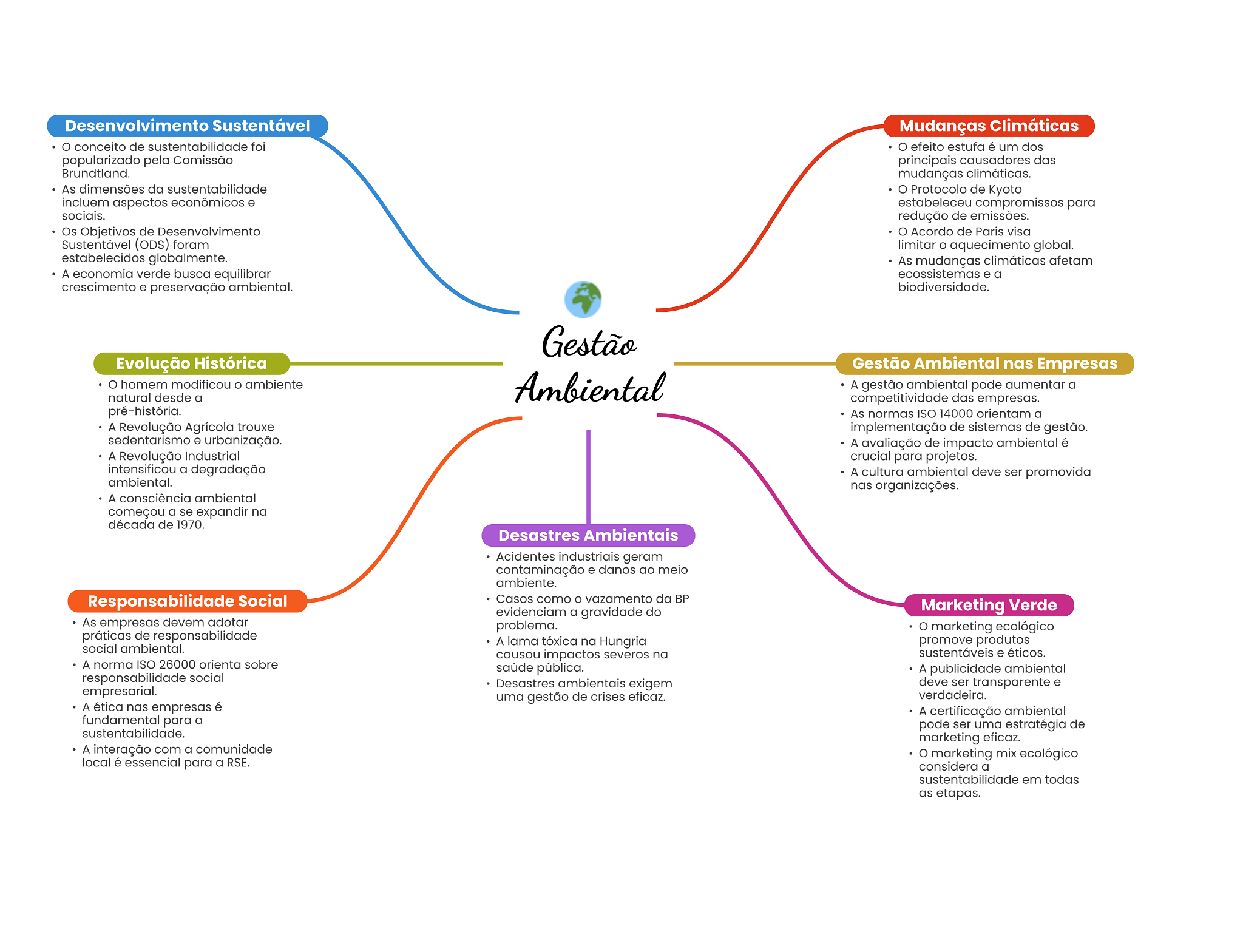 Desenvolvimento Sustentável Mudanças Climáticas conceito de sustentabilidade foi efeito estufa é um dos popularizado pela Comissão principais causadores das Brundtland. mudanças climáticas. As dimensões da sustentabilidade Protocolo de Kyoto incluem aspectos econômicos e estabeleceu compromissos para sociais. redução de emissões. Os Objetivos de Desenvolvimento Acordo de Paris visa Sustentável (ODS) foram limitar aquecimento global. estabelecidos globalmente. As mudanças climáticas afetam A economia verde busca equilibrar ecossistemas e a crescimento e preservação ambiental. biodiversidade. Gestão Evolução Histórica Gestão Ambiental nas Empresas homem modificou ambiente Ambiental A gestão ambiental pode aumentar a natural desde a competitividade das empresas. pré-história. As normas ISO 14000 orientam a A Revolução Agrícola trouxe implementação de sistemas de gestão. sedentarismo e urbanização. A avaliação de impacto ambiental é A Revolução Industrial crucial para projetos. intensificou a degradação A cultura ambiental deve ser promovida ambiental. nas organizações. A consciência ambiental começou a se expandir na década de 1970. Desastres Ambientais Acidentes industriais geram contaminação e danos ao meio ambiente. Responsabilidade Social Casos como vazamento da BP evidenciam a gravidade do Marketing Verde As empresas devem adotar problema. marketing ecológico práticas de responsabilidade social ambiental. A lama tóxica na Hungria promove produtos causou impactos severos na sustentáveis e éticos. A norma ISO 26000 orienta sobre saúde pública. A publicidade ambiental responsabilidade social Desastres ambientais exigem deve ser transparente e empresarial. uma gestão de crises eficaz. verdadeira. A ética nas empresas é A certificação ambiental fundamental para a pode ser uma estratégia de sustentabilidade. marketing eficaz. A interação com a comunidade marketing mix ecológico local é essencial para a RSE. considera a sustentabilidade em todas as etapas.