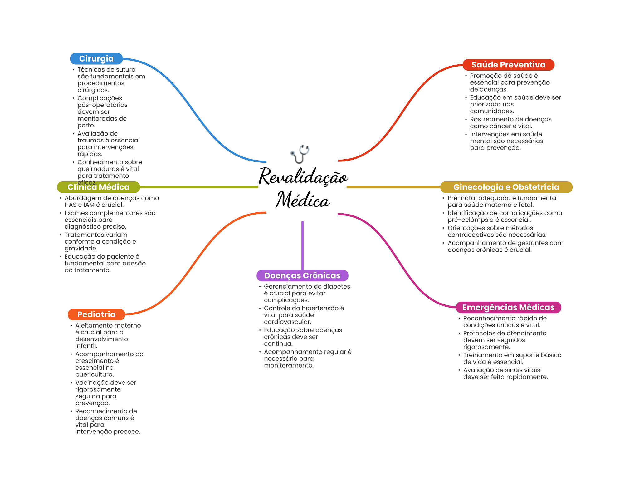 Cirurgia Saúde Preventiva Técnicas de sutura são fundamentais em Promoção da saúde é procedimentos essencial para prevenção cirúrgicos. de doenças. Complicações Educação em saúde deve ser pós-operatórias priorizada nas devem ser comunidades. monitoradas de Rastreamento de doenças perto. como câncer é vital. Avaliação de Intervenções em saúde traumas é essencial mental são necessárias para intervenções para prevenção. rápidas. Conhecimento sobre queimaduras é vital para tratamento Clínica eficaz. Médica Revalidação Ginecologia e Obstetrícia Abordagem de doenças como Médica Pré-natal adequado é fundamental HAS e IAM é crucial. para saúde materna e fetal. Exames complementares são Identificação de complicações como essenciais para pré-eclâmpsia é essencial. diagnóstico preciso. Orientações sobre métodos Tratamentos variam contraceptivos são necessárias. conforme a condição e Acompanhamento de gestantes com gravidade. doenças crônicas é crucial. Educação do paciente é fundamental para adesão ao tratamento. Doenças Crônicas Gerenciamento de diabetes é crucial para evitar complicações. Controle da hipertensão é Emergências Médicas Pediatria vital para saúde cardiovascular. Reconhecimento rápido de Aleitamento materno condições é vital. é crucial para Educação sobre doenças Protocolos de atendimento desenvolvimento crônicas deve ser contínua. devem ser seguidos infantil. rigorosamente. Acompanhamento do Acompanhamento regular é crescimento é necessário para Treinamento em suporte básico de vida é essencial. essencial na monitoramento. Avaliação de sinais vitais puericultura. deve ser feita rapidamente. Vacinação deve ser rigorosamente seguida para prevenção. Reconhecimento de doenças comuns é vital para intervenção precoce.