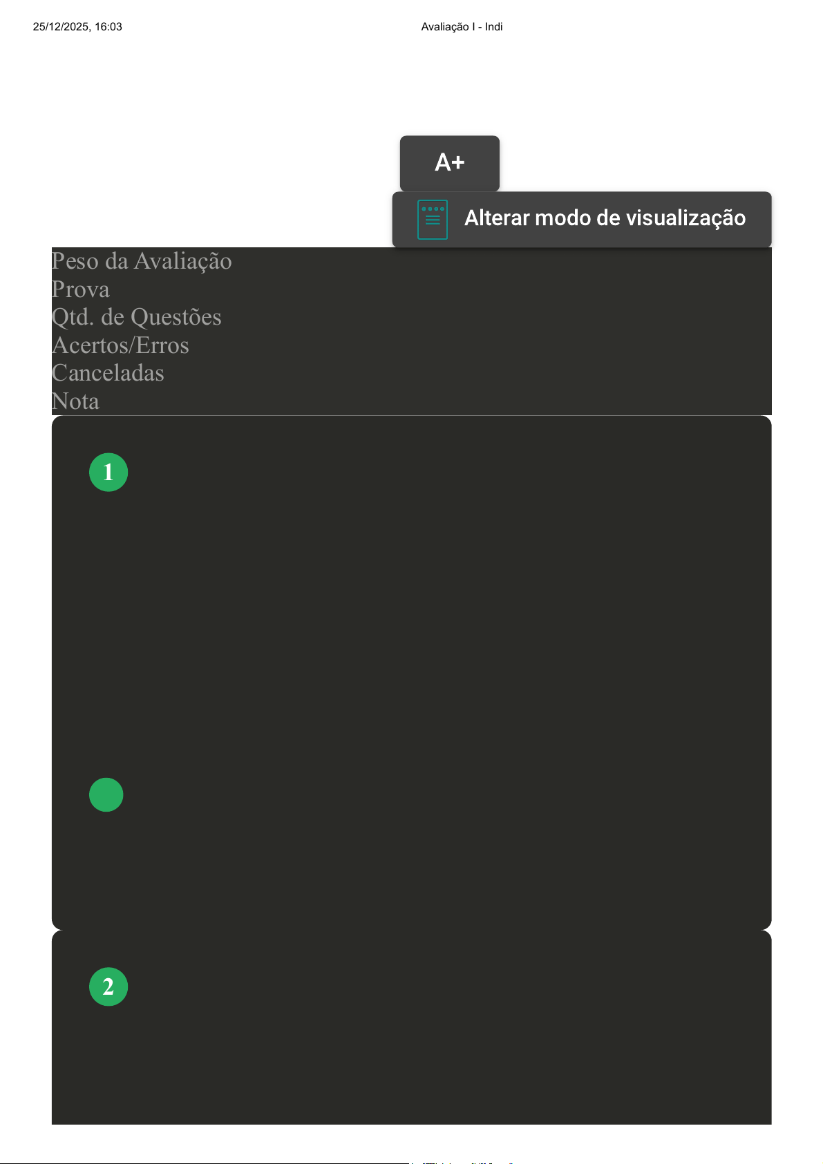 Prova Impressa GABARITO | Avaliação I - Individual (Cod.:738468) Peso da Avaliação 1,50 Prova 46798121 Qtd. de Questões 10 Acertos/Erros 7/2 Canceladas 1 Nota 8,00 A análise da previsão do tempo para um dia específico trata-se de um fenômeno aleatório, pois não se consegue prever o tempo com 100% de certeza. Neste caso, com base em comportamentos já conhecidos, estima-se, por exemplo, a ocorrência de chuva. Essa estimativa tem como base que teoria matemática? A Incerteza. B Relatividade. C Probabilidade. D Equações. Método é uma palavra que tem derivação na língua grega que quer dizer por meio de, ou através de. Sempre que você tiver uma meta precisará de um caminho, ou seja, de um método. Com relação ao método, analise as sentenças a seguir: VOLTAR A+ Alterar modo de visualização 1 2 25/12/2025, 16:03 Avaliação I - Individual about:blank 1/8 I- O método sinaliza hipóteses para um problema. II- Existem dois tipos de métodos que fazem parte do método científico. III- O método é a garantia que os resultados serão pelo menos 50% corretos. Assinale a alternativa CORRETA: A As sentenças II e III estão corretas. B Somente a sentença I está correta. C As sentenças I e II estão corretas. D As sentenças I e III estão corretas. Para muitas coisas na vida existem métodos. Quando estudamos métodos quantitativos não é diferente. Métodos é uma palavra que tem derivação na língua grega - methodos. "Met" quer dizer "através de" ou "por meio de", e "hodós" significa "caminho". Portanto, sobre o significado da palavra métodos, assinale a alternativa CORRETA: A Caminho para a meta. B Caminho para o meio. C Caminho para a solução. D Caminho para a vida. 3 25/12/2025, 16:03 Avaliação I - Individual about:blank 2/8 Em uma pesquisa estatística existe uma etapa que vem após a delimitação do problema de pesquisa. Uma vez que o problema está delimitado, o pesquisador precisa pensar e se organizar quanto à maneira como as perguntas propostas serão respondidas. A essa etapa da pesquisa se dá qual nome? A Definição do problema de pesquisa. B Planejamento da pesquisa. C Delimitação da pesquisa. D Conclusão do problema de pesquisa. O número de matrículas nos cursos de graduação presencial no Brasil aumentou aproximadamente 80% na última década, segundo dados do MEC/Inep. Este aumento significativo demonstra que a população está buscando se aperfeiçoar e aumentar seu conhecimento. De acordo com a série apresentada, analise as seguintes sentenças: I- Trata de uma série de dupla entrada ou série mista. II- A série a seguir trata do número de matrículas nos cursos de ensino a distância no Brasil no período de 2001 a 2010. III- Trata de uma série estatística simples. IV- A série retrata/demonstra a evolução do número de matrículas nos cursos presenciais no Brasil, por região e época de ocorrência dos fatos. 4 5 25/12/2025, 16:03 Avaliação I - Individual about:blank 3/8 Assinale a alternativa CORRETA: A As sentenças II e III estão corretas. B As sentenças I e II estão corretas. C As sentenças III e IV estão corretas. D As sentenças I e IV estão corretas. A estatística é uma área de estudos que se propõe a estudar eventos e experimentos, em qualquer área do conhecimento, como, por exemplo, a administração. Magalhães e Lima (2010, p. 1) definem a estatística como um "conjunto de técnicas que permite, de forma sistemática, organizar, descrever, analisar e interpretar dados oriundos de estudos ou experimentos, realizados em qualquer área do conhecimento". Assinale a alternativa CORRETA que apresenta uma pesquisa estatística: FONTE: MAGALHÃES, Marcos Nascimento; LIMA, Antonio Carlos Pedroso de. Noções de probabilidade e estatística. São Paulo: EDUSP, 2010. A Uma empresa faz uma pesquisa de mercado para saber a preferência dos consumidores de uma comunidade com relação a determinado produto. 6 25/12/2025, 16:03 Avaliação I - Individual about:blank 4/8 B Um aluno do curso de Ciências Sociais resolveu pesquisar a vida e as obras de Guimarães Rosa. C Um analista de recursos humanos verificou o histórico profissional de um determinado colaborador. D Um telejornal apresenta alguns textos com informações históricas referentes ao surgimento de uma pesquisa de “boca de urna” dos candidatos para eleição a vereador. Desde a remota antiguidade, os governos têm se interessado por informações sobre suas populações e riquezas, tendo em vista, principalmente, fins militares e tributários. O registro de informações perde-se no tempo. Sobre os exemplos da origem da estatística descritiva, analise as sentenças a seguir: I- Balancetes do Império Romano. II- Inventário das posses de Carlos Magno. III- Registros de propriedades privadas na França. Assinale a alternativa CORRETA: A As sentenças II e III estão corretas. B Somente a sentença I está correta. C As sentenças I e II estão corretas. D As sentenças I e III estão corretas. A estatística tem aplicação nas mais diversas áreas do conhecimento, pois diante do crescimento de setores como inteligência de mercado e Big Data nas empresas, a relevância 7 8 25/12/2025, 16:03 Avaliação I - Individual about:blank 5/8 da estatística aumenta ainda mais. Sobre os exemplos de aplicação da estatística na área de recursos humanos, analise as sentenças a seguir: I- A estatística está presente na área de recursos humanos em pesquisas para compatibilização entre conhecimentos e habilidades de empregados. II- A estatística está presente na área de recursos humanos na construção de parques industriais. III- A estatística está presente na área de recursos humanos nos estudos salariais e necessidades de treinamento. Assinale a alternativa CORRETA: A As sentenças I e III estão corretas. B Somente a sentença I está correta. C Somente a sentença III está correta. D As sentenças II e III estão corretas. A estatística