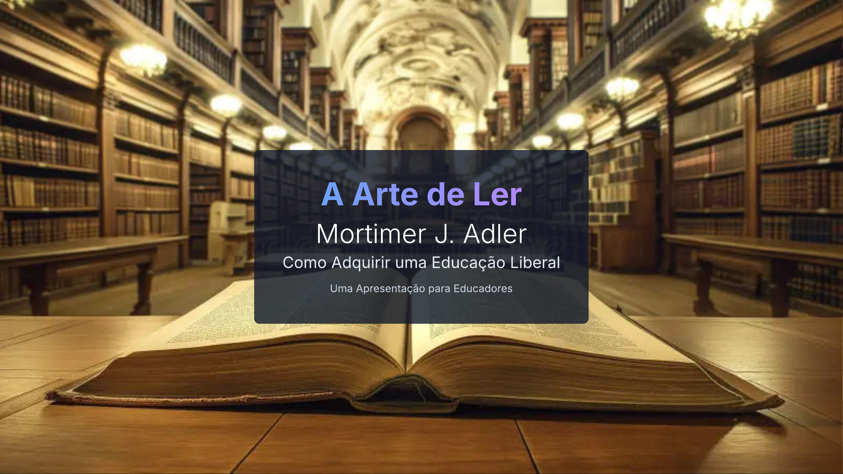 Mortimer J. Adler Como Adquirir uma Educação Liberal Uma Apresentação para Educadores Sobre o Autor e a Obra Mortimer J. Adler (1902-2001) Filósofo, Educador e Escritor Americano Professor da Universidade de Chicago Fundador do Great Books Program Editor da Encyclopædia Britannica Defensor da educação liberal clássica A Arte de Ler (How to Read a Book) Publicação original: 1940 | Edição revista: 1972 Obra revolucionária que transformou o conceito de leitura ativa e crítica, tornando-se um clássico da educação liberal Especialmente relevante para educadores que buscam desenvolver pensamento crítico e autonomia intelectual em seus alunos Mortimer J. Adler | A Arte de Ler A Leitura como Educação Liberal Educação Liberal Educação que enriquece o ser humano e cultiva a razão. Não é treinamento para ganhar a vida, mas aprendizado para viver. O Que É Enriquecimento humano integral Cultivo da razão e pensamento crítico Formação de cidadãos livres O Que Não É Apenas treinamento vocacional Acumulação de informações sem reflexão Memorização mecânica "A justificativa da educação liberal é que ela nos enriquece. Faz-nos homens. Torna-nos capazes de levar a vida caracteristicamente humana da razão." — Adler, Prefácio, p. 7 Mortimer J. Adler | A Arte de Ler O Conceito Fundamental Duas Abordagens, Dois Destinos Educação Liberal Viver Humanamente Enriquecimento do ser humano através da razão cultivada. Desenvolvimento do pensamento crítico Capacidade de conversar inteligentemente Liberdade intelectual genuína Treinamento Vocacional Ganhar a Vida Preparação para uma profissão específica. Foco em habilidades técnicas Objetivo: sustento material Limitado a conhecimento aplicado A Leitura e a Democracia "A educação liberal é um meio indispensável para estabelecer as responsabilidades dos homens livres numa democracia." Sem mentalidade livre, não há homens livres. Pensar criticamente é essencial à democracia. A arte de ler bem leva à arte de pensar bem. Leitura é base para viver em sociedade livre. Mortimer J. Adler | A Arte de Ler Da Diversão à Transformação Adler identifica três formas de leitura, cada uma com um propósito e nível de atividade intelectual. 1 Leitura para Entretenimento (Passatempo) Atividade: Baixa Diversão e relaxamento Leitura passiva para lazer, sem foco em aprendizado. O objetivo principal é o prazer. Ex: Romances leves, revistas. 2 Leitura para Informação (Instrução) Atividade: Média Adquirir conhecimentos Acumular fatos e informações explícitas. Memorização e ampliação do conhecimento. Ex: Livros técnicos, jornais. "O processo pelo qual uma inteligência se aperfeiçoa, mediante o poder de sua própria aplicação ao texto." Definição da Leitura para Compreensão — Adler Mortimer J. Adler | A Arte de Ler 3 Leitura para Compreensão (Desenvolvimento) Atividade: Alta Elevar a compreensão Busca por transformação intelectual genuína. Exige esforço mental máximo e ativo. Ex: Grandes obras filosóficas e científicas. MAIS IMPORTANTE Leitura Ativa vs Passiva A Qualidade da Atividade Mental Toda leitura é ativa. A "passiva" é simplesmente menos ativa. A qualidade da leitura depende do grau de atividade empregado. Leitura Mais Ativa Questionamento constante Interpretação crítica Busca por compreensão Resultado: Transformação intelectual Leitura Menos Ativa Recepção superficial Atenção dispersa Compreensão limitada Resultado: Aprendizado limitado Exemplo: Carta de Amor Ao ler uma carta de amor, analisamos cada palavra, lemos nas entrelinhas e buscamos o significado mais profundo. Aplique essa intensidade a livros importantes. Critérios de Habilidade 1 Dificuldade Ler materiais progressivamente mais difíceis. 2 Atividade Ler o mesmo livro com mais método e atenção. Mortimer J. Adler | A Arte de Ler Professores Vivos e Mortos A Honestidade Pedagógica e os Grandes Livros A Revelação de Adler "Nunca pensei que não soubesse ler, até ter deixado o colégio. Foi ensinando aos outros que o descobri." Adler percebeu que apenas lia sobre os livros, não os livros em si. Professor Autêntico Fazia perguntas que brotavam das páginas. Viajava DENTRO do livro, com intimidade genuína. Representado por Mark Van Doren. Professor Despreparado Usava perguntas genéricas e fontes secundárias. Enganava a si mesmo e aos alunos. A auto-crítica inicial de Adler. Os Professores-Mortos Os grandes autores e seus livros são professores permanentes, sempre disponíveis, que ensinam através de suas obras e exigem um leitor ativo. Os clássicos são guias que nunca se esgotam. Honestidade Pedagógica "Os melhores professôres são os que têm menos pretensão. (...) Se o professor se mostrar titubeante, também, pode ajudá-los muito mais." Admitir a dificuldade engaja os alunos no aprender. Mortimer J. Adler | A Arte de Ler A Crítica ao Sistema Educacional Falências e Responsabilidades Compartilhadas A Falência da Alfabetização "A alfabetização [...] não é educação; nem é mesmo 'saber ler' [...] e menos ainda fazer um juízo crítico." Confunde-se alfabetização básica com leitura crítica. O Jogo de "Passar" vs Aprender O sistema recompensa a aparência de conhecimento, não o saber real. Alunos aprendem a "passar" sem aprender o conteúdo. "O aluno passa de ano... Mas deixa passar, também, a educação." Três Falhas Estruturais 1 Gradações Obscurecidas Falta de progressão real na habilidade de leitura ao longo dos anos. 2 Empanturramento Acúmulo de informação sem compreensão real. 3 Compêndios vs Originais Uso de resumos que impedem o contato com grandes obras. Impostura Profissional Professores perpetuam o ciclo de má educação ao esconderem suas próprias deficiências. Contraste Francês O sistema francês foca na maestria da "explication de texte" em todos os níveis. Mortimer J. Adler | A Arte de Ler O Caminho para a Transformação A Responsabilidade Comparti