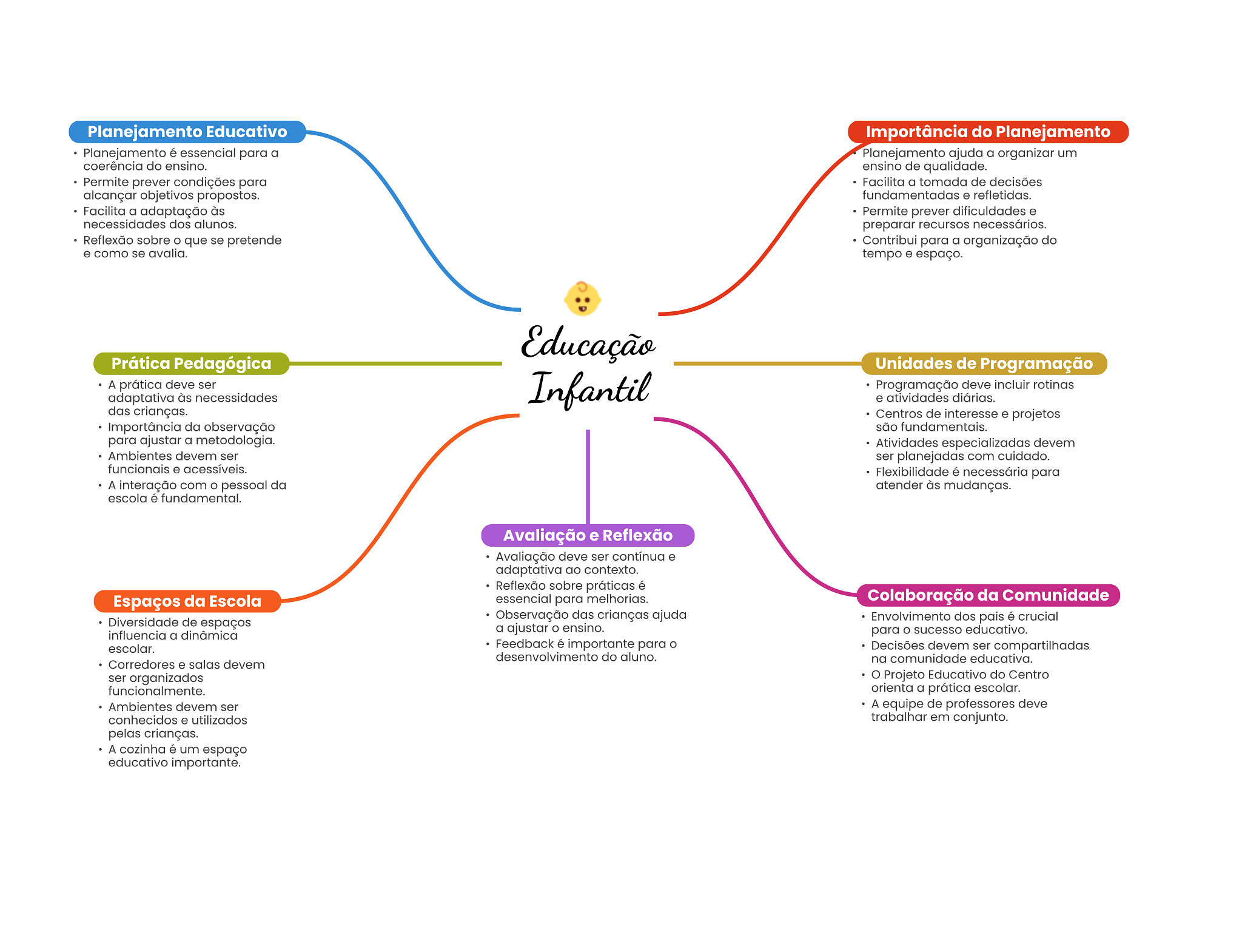 Planejamento Educativo Importância do Planejamento Planejamento é essencial para a Planejamento ajuda a organizar um coerência do ensino. ensino de qualidade. Permite prever condições para Facilita a tomada de decisões alcançar objetivos propostos. fundamentadas e refletidas. Facilita a adaptação às Permite prever dificuldades e necessidades dos alunos. preparar recursos necessários. Reflexão sobre que se pretende Contribui para a organização do e como se avalia. tempo e espaço. Educação Prática Pedagógica Unidades de Programação A prática deve ser adaptativa às necessidades Infantil Programação deve incluir rotinas e atividades diárias. das crianças. Centros de interesse e projetos Importância da observação são fundamentais. para ajustar a metodologia. Atividades especializadas devem Ambientes devem ser ser planejadas com cuidado. funcionais e acessíveis. Flexibilidade é necessária para A interação com pessoal da atender às mudanças. escola é fundamental. Avaliação e Reflexão Avaliação deve ser contínua e adaptativa ao contexto. Reflexão sobre práticas é Espaços da Escola essencial para melhorias. Colaboração da Comunidade Observação das crianças ajuda Diversidade de espaços Envolvimento dos pais é crucial influencia a dinâmica a ajustar O ensino. para sucesso educativo. escolar. Feedback é importante para Decisões devem ser compartilhadas desenvolvimento do aluno. na comunidade educativa. Corredores e salas devem ser organizados O Projeto Educativo do Centro funcionalmente. orienta a prática escolar. Ambientes devem ser A equipe de professores deve conhecidos e utilizados trabalhar em conjunto. pelas crianças. A cozinha é um espaço educativo importante.