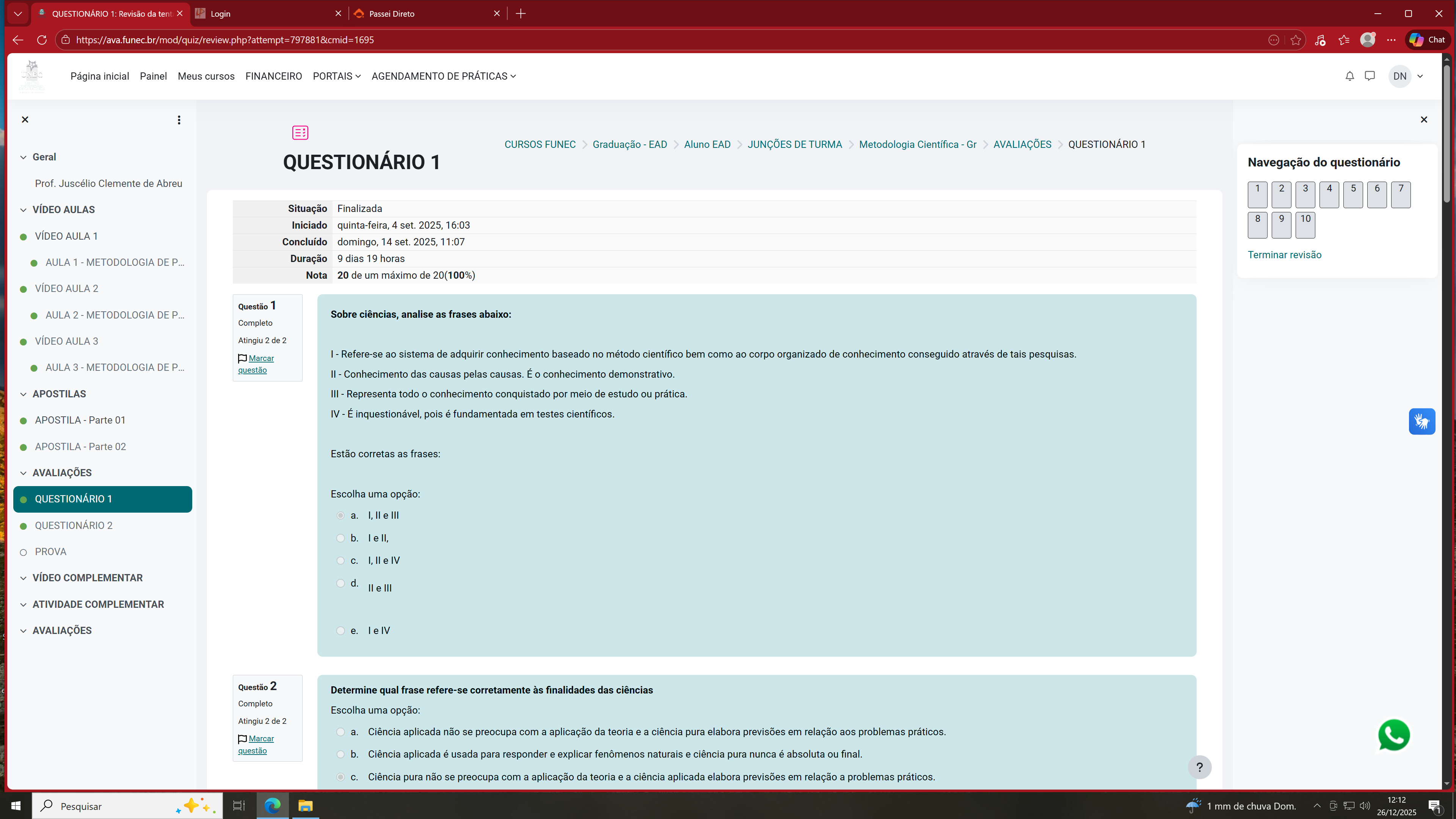 QUESTIONÁRIO 1: Revisão da tent Login Passei Direto + 1695 Chat Página inicial Painel Meus cursos FINANCEIRO PORTAIS AGENDAMENTO DE PRÁTICAS DN CURSOS FUNEC Graduação EAD Aluno EAD JUNÇÕES DE TURMA Metodologia Científica Gr > AVALIAÇÕES QUESTIONÁRIO 1 Geral QUESTIONÁRIO 1 Navegação do questionário Prof. Juscélio Clemente de Abreu 1 2 3 4 5 6 7 VÍDEO AULAS Situação Finalizada 8 9 10 Iniciado quinta-feira, 4 set. 2025, 16:03 VÍDEO AULA 1 Concluído domingo, 14 set. 2025, 11:07 AULA 1 METODOLOGIA DE Duração 9 dias 19 horas Terminar revisão Nota 20 de um máximo de 20(100%) VÍDEO AULA 2 Questão 1 AULA 2 METODOLOGIA DE Sobre ciências, analise as frases abaixo: Completo VÍDEO AULA 3 Atingiu de 2 Marcar Refere-se ao sistema de adquirir conhecimento baseado no método científico bem como ao corpo organizado de conhecimento conseguido através de tais pesquisas. AULA 3 METODOLOGIA DE questão II Conhecimento das causas pelas causas. É conhecimento demonstrativo. APOSTILAS III - Representa todo conhecimento conquistado por meio de estudo ou prática. IV É inquestionável, pois é fundamentada em testes científicos. APOSTILA Parte 01 APOSTILA Parte 02 Estão corretas as frases: AVALIAÇÕES QUESTIONÁRIO 1 Escolha uma opção: a. III QUESTIONÁRIO 2 b. II, PROVA IV VÍDEO COMPLEMENTAR d. III ATIVIDADE COMPLEMENTAR AVALIAÇÕES e. IV Questão 2 Determine qual frase refere-se corretamente às finalidades das ciências Completo Escolha uma opção: Atingiu de 2 a. Ciência aplicada não se preocupa com a aplicação da teoria e a ciência pura elabora previsões em relação aos problemas práticos. Marcar b. Ciência aplicada é usada para responder e explicar fenômenos naturais e ciência pura nunca é absoluta ou final. ? Ciência pura não se preocupa com a aplicação da teoria e a ciência aplicada elabora previsões em relação a problemas práticos. 12:12 Pesquisar 1 mm de chuva Dom. 26/12/2025
