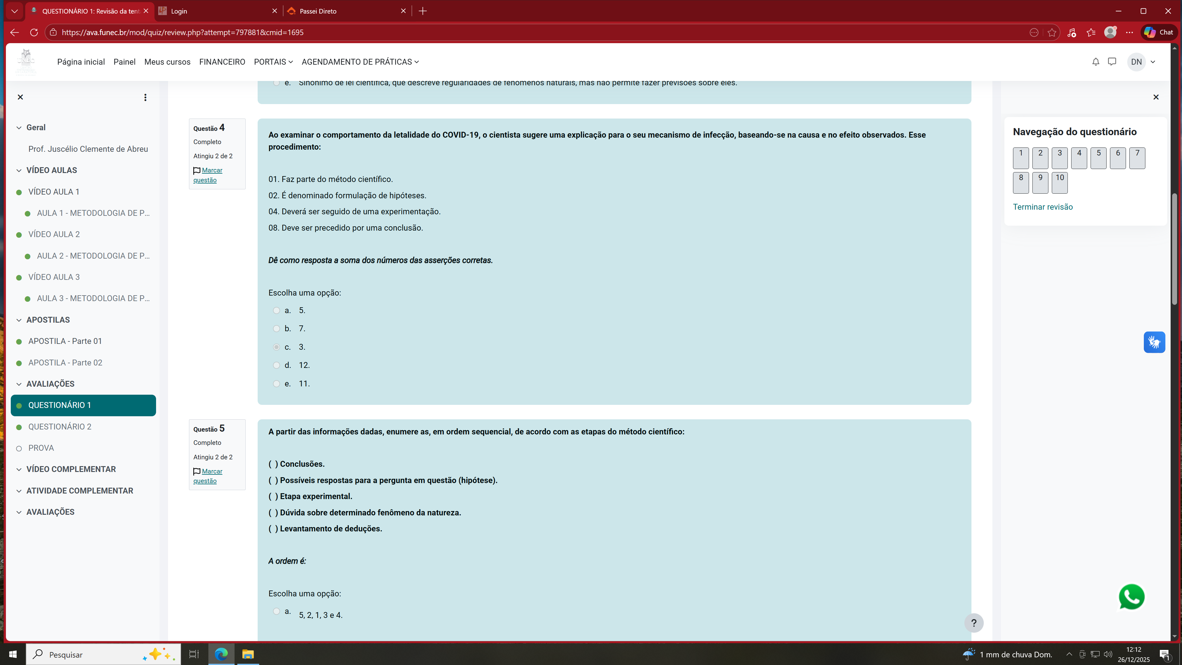 QUESTIONÁRIO 1: Revisão da tent Login Passei Direto + Chat Página inicial Painel Meus cursos FINANCEIRO PORTAIS AGENDAMENTO DE PRÁTICAS DN Sinonimo cientifica, que aescreve regularidades naturais, mas nao permite Tazer previsoes Geral Questão 4 Ao examinar comportamento da letalidade do COVID-19, cientista sugere uma explicação para seu mecanismo de infecção, baseando-se na causa e no efeito observados. Esse Navegação do questionário Completo Prof. Juscélio Clemente de Abreu procedimento: 1 2 3 4 5 6 Atingiu de 2 7 VÍDEO AULAS Marcar questão 01. Faz parte do método científico. 8 9 10 VÍDEO AULA 1 02. É denominado formulação de hipóteses. Terminar revisão AULA 1 METODOLOGIA DE 04. Deverá ser seguido de uma experimentação. 08. Deve ser precedido por uma conclusão. VÍDEO AULA 2 AULA 2 METODOLOGIA DE Dê como resposta a soma dos números das asserções corretas. VÍDEO AULA 3 Escolha uma opção: AULA 3 METODOLOGIA DE a. 5. APOSTILAS b. 7. APOSTILA Parte 01 3. APOSTILA Parte 02 d. 12. AVALIAÇÕES e. 11. QUESTIONÁRIO 1 QUESTIONÁRIO 2 Questão 5 A partir das informações dadas, enumere as, em ordem sequencial, de acordo com as etapas do método científico: Completo PROVA Atingiu de 2 VÍDEO COMPLEMENTAR Conclusões. Marcar questão Possíveis respostas para a pergunta em questão (hipótese). ATIVIDADE COMPLEMENTAR Etapa experimental. AVALIAÇÕES Dúvida sobre determinado fenômeno da natureza. ( ) Levantamento de deduções. A ordem é: Escolha uma opção: a. ? 12:12 Pesquisar 1 mm de chuva Dom. 26/12/2025
