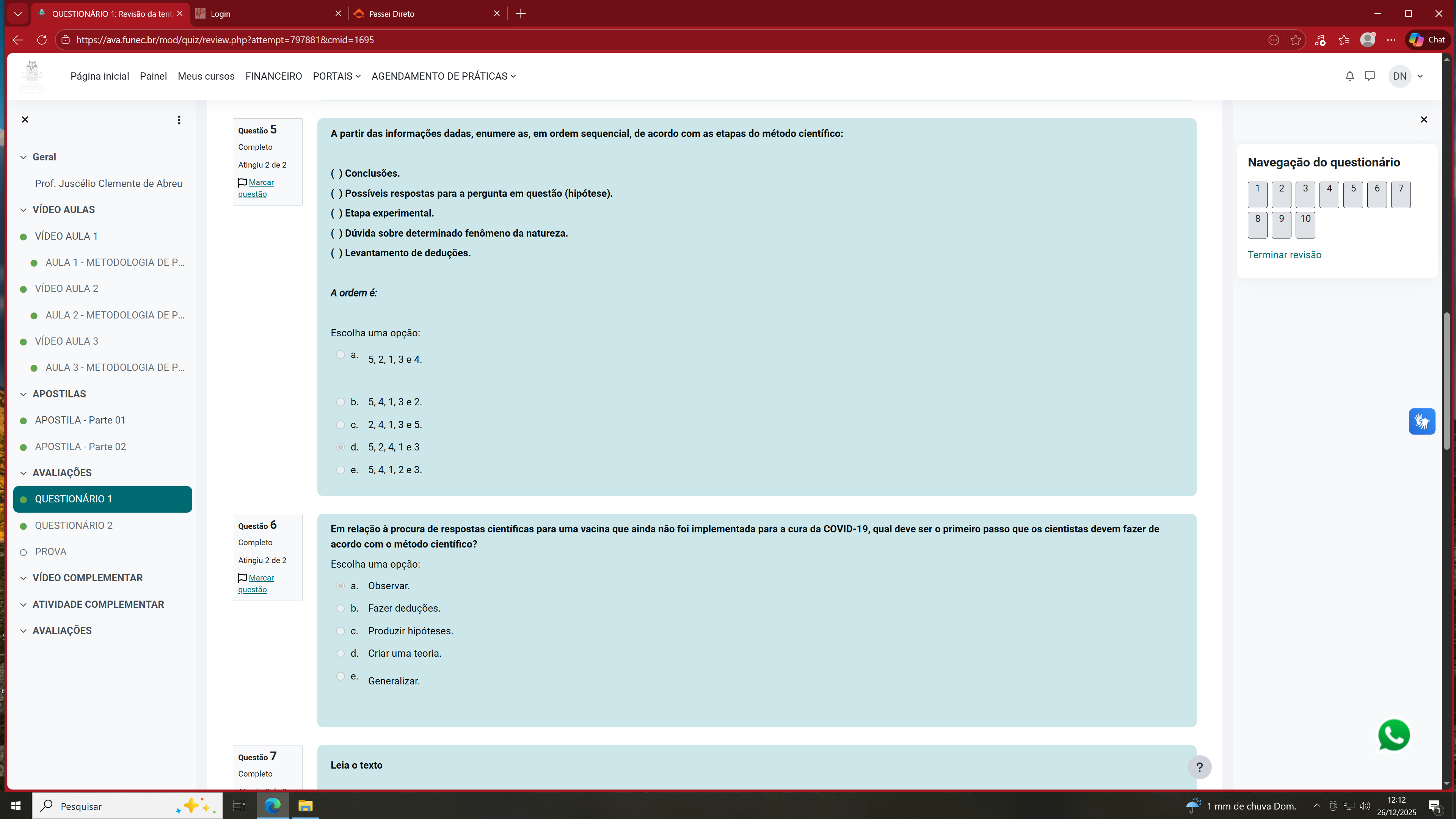 QUESTIONÁRIO 1: Revisão da tent Login Passei Direto + Chat Página inicial Painel Meus cursos FINANCEIRO PORTAIS AGENDAMENTO DE PRÁTICAS DN Questão 5 A partir das informações dadas, enumere as, em ordem sequencial, de acordo com as etapas do método científico: Completo Geral Atingiu de 2 Navegação do questionário Conclusões. Prof. Juscélio Clemente de Abreu Marcar 1 2 3 4 5 6 7 questão Possíveis respostas para a pergunta em questão (hipótese). VÍDEO AULAS Etapa experimental. 8 9 10 VÍDEO AULA 1 Dúvida sobre determinado fenômeno da natureza. Levantamento de deduções. Terminar revisão AULA 1 METODOLOGIA DE VÍDEO AULA 2 A ordem é: AULA 2 METODOLOGIA DE Escolha uma opção: VÍDEO AULA 3 a. AULA 3 METODOLOGIA DE APOSTILAS b. APOSTILA Parte 01 APOSTILA Parte 02 d. AVALIAÇÕES e. QUESTIONÁRIO 1 QUESTIONÁRIO 2 Questão 6 Em relação à procura de respostas científicas para uma vacina que ainda não foi implementada para a cura da COVID-19, qual deve ser primeiro passo que os cientistas devem fazer de Completo acordo com método científico? PROVA Atingiu de 2 Escolha uma opção: VÍDEO COMPLEMENTAR Marcar questão a. Observar. ATIVIDADE COMPLEMENTAR b. Fazer deduções. AVALIAÇÕES Produzir hipóteses. d. Criar uma teoria. e. Generalizar. Questão 7 Leia texto ? Completo 12:12 Pesquisar 1 mm de chuva Dom. 26/12/2025