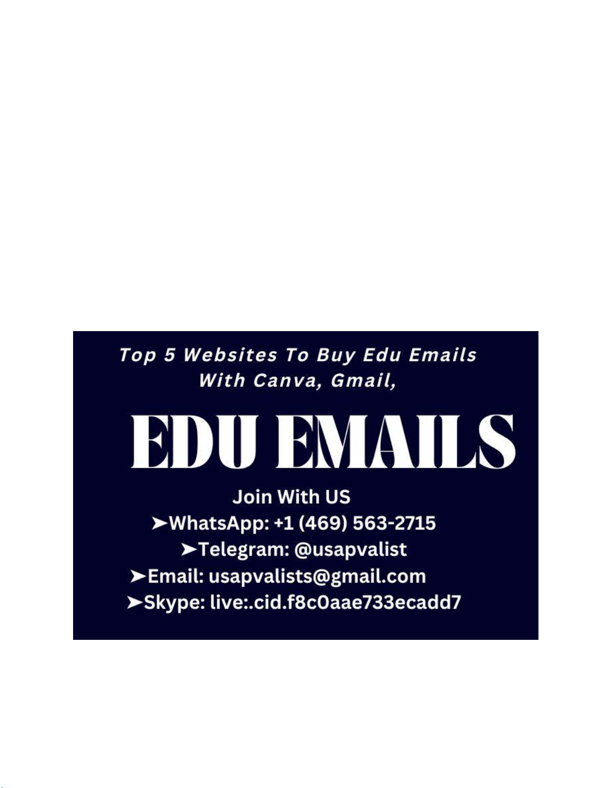 Top 10 Trusted Sites to Buy Edu Emails for Discounts Buy Edu emails for discounts from the top 10 trusted sites! Grab the best deals and enjoy amazing savings on your favorite brands now! ➤WhatsApp: +1 (469) 563-2715 ➤Telegram: @usapvalist Are you looking for a reliable way to buy edu emails at discounted rates? With the rise of online education, the demand for edu emails has increased, and so has the number of websites offering them. However, not all sites are trustworthy, making it crucial to identify verified edu emails that can provide the discounts you need. When searching for edu email discounts, it's essential to consider the credibility of the websites offering these services. This article will guide you through the top 10 trusted sites where you can purchase edu emails securely and at discounted prices. Key Takeaways ● Top 10 trusted sites to buy edu emails ● How to identify verified edu emails ● Tips for getting discounts on edu emails ● Importance of using trusted sites for edu email purchases ● What to expect from this article The Value and Benefits of .Edu Email Addresses .Edu email addresses are more than just a university credential; they unlock a plethora of discounts and perks. For students and educators, having access to exclusive offers can make a significant difference in their academic and professional pursuits. What Makes .Edu Emails Special .Edu emails are highly valued because they signify affiliation with an educational institution. This status grants access to a variety of benefits, including software discounts, academic resources, and professional tools. Popular Discounts and Perks Available With an .edu email, individuals can enjoy discounts on popular services such as: ● Software and tech products ● Online courses and educational resources ● Travel and accommodation services ● Legal and Ethical Considerations While .edu emails offer numerous benefits, it's crucial to use them responsibly and within legal boundaries. Purchasing .edu emails should be done from reputable sources to avoid any legal or ethical issues. Always verify the authenticity of the seller and ensure that the transaction complies with legal standards. How to Safely Buy Edu Emails Online Buying edu emails online requires a careful approach to avoid scams and ensure authenticity. With the rise in demand for educational emails, the market has seen an influx of sellers, making it crucial to differentiate between legitimate and fraudulent providers. Red Flags to Watch Out For When purchasing edu emails online, there are several red flags to be aware of. These include: ● Unusually low prices that seem too good to be true ● Lack of clear information about the email accounts being sold ● No customer support or follow-up services ● Poor reviews or ratings from previous customers Being cautious of these signs can help you avoid potential scams and ensure a smooth transaction. Verification Methods to Ensure Authenticity To verify the authenticity of edu emails, you can check for the following: ● Verification documents or proof of the email account's origin ● Checking if the email account is active and functional ● Looking for reviews or testimonials from other customers who have purchased from the seller Ensuring the authenticity of the edu emails is crucial for their intended use, whether it's for discounts, educational purposes, or other benefits. Price Ranges to Expect The price for buying edu emails online can vary widely based on the seller, the type of email account, and the services included. Here is a general overview of what you might expect: Understanding the price ranges can help you make an informed decision when buying edu emails online, ensuring you get the best value for your needs. EduMailShop - Premium .Edu Email Provider EduMailShop has emerged as a leading provider of premium .edu email addresses, catering to the needs of students and professionals alike. With a focus on delivering high-quality services, EduMailShop is becoming a go-to option for those seeking .edu emails. Service Overview EduMailShop offers a range of .edu email services, including individual and bulk purchases. Their emails are verified and come with a guarantee of authenticity. "We pride ourselves on providing emails that are not only genuine but also come with a satisfaction guarantee," says EduMailShop's customer support team. Pricing and Packages The pricing for EduMailShop's services varies based on the package chosen. They offer competitive rates, with discounts available for bulk purchases. Their packages are designed to be flexible, accommodating different needs and budgets. Customer Support and Reliability EduMailShop is known for its reliable customer support. They offer assistance through multiple channels, ensuring that any issues are resolved promptly. Their commitment to customer satisfaction is evident in their 100% satisfaction guarantee. Pros ● Reliable and verified emails ● Competitive pricing ● Excellent customer support Cons ● Limited information on their website about the email verification process ● Some users have reported delays in delivery In conclusion, EduMailShop is a premium .edu email provider that offers a range of services to meet different needs. While there are some areas for improvement, their commitment to quality and customer satisfaction makes them a reliable choice. AccuEdu - Verified Educational Email Accounts For individuals and businesses looking for authentic educational email addresses, AccuEdu stands out as a trusted service. With a focus on delivering high-quality, verified educational email accounts, AccuEdu has become a preferred choice for many. Service Overview AccuEdu offers a comprehensive range of verified educational email accounts. Their service is designed to cater to diverse needs, ensuring that clients receive email accounts that are both authentic and reliable. Pricing and Packages AccuEdu's pricing strategy is 