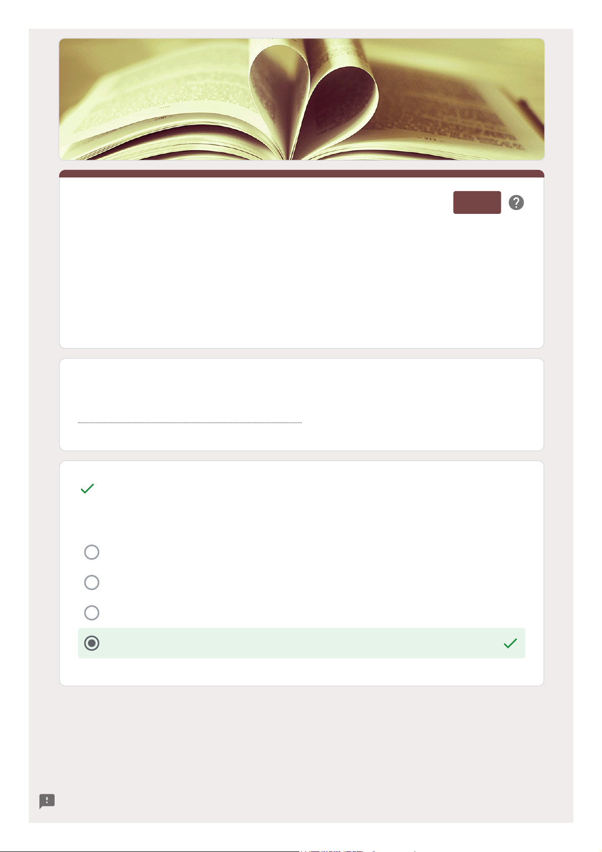 Jaciara Vasconcelos Costa 10/10 Seu companheiro de prisão Um dos seus colaboradores Médico amado Seu filho Avaliação do Evangelho de Marcos Total de pontos 100/100 Enviar até dia: 16/05/2025 Material de estudo: Evangelho de Marcos, resumo do Frei Ildo, slides dos professores Que o estudo deste Evangelho te mostre quem é Jesus e te ensine como segui-lo. O Espírito Santo te ilumine! Nome completo * 1. Leia a Primeira Carta de Pedro 5,13. O apóstolo Pedro se refere a Marcos como: * 16/05/2025, 18:04 Avaliação do Evangelho de Marcos https://docs.google.com/forms/d/e/1FAIpQLSd3h9aT7n0PKzfEL7t732uUxfT57WYnaEPB9pQTi6mW3JX_5g/viewscore?pli=1&pli=1&viewscore=A… 1/5 10/10 É conhecido como João Marcos Era um dos Doze apóstolos de Jesus Morava em Jerusalém e a comunidade se reunia em oração na casa da sua mãe Acompanhou Paulo e seus companheiros em suas missões Era primo de Barnabé 10/10 Foi o primeiro dos quatro Evangelhos canônicos a ser escrito É um resumo do Evangelho de Mateus Não é Sinótico com Mateus e Lucas Foi o último Evangelho a ser escrito 10/10 A genealogia e a infância de Jesus A anunciação e todas as três tentações de Jesus As três tentações de Jesus no deserto Os quarenta dias em que Jesus foi tentado no deserto, vivia entre as feras e os anjos o serviam O Pai Nosso e as Bem-aventuranças 2. Sobre o evangelista Marcos qual afirmação está ERRADA? * 3. O Evangelho de Marcos: * 4. No Evangelho de Marcos encontramos a narração sobre: * 16/05/2025, 18:04 Avaliação do Evangelho de Marcos https://docs.google.com/forms/d/e/1FAIpQLSd3h9aT7n0PKzfEL7t732uUxfT57WYnaEPB9pQTi6mW3JX_5g/viewscore?pli=1&pli=1&viewscore=A… 2/5 10/10 Os judeus e por isso usa tantas expressões do judaísmo Os pagãos e por isso explica muitos termos e práticas dos judeus As comunidades joaninas Os samaritanos 10/10 “Por que me procuráveis? Não sabíeis que devo estar na casa de meu Pai?” “Deixai estar por enquanto, pois assim nos convém cumprir toda a justiça.” “Cumpriu-se o tempo e o reino de Deus está próximo!” “Que procurais?” 10/10 Emanuel Menino Salvador Filho de Deus 5. Os destinatários para quem Marcos escreve o seu Evangelho são: * 6. As primeiras palavras de Jesus no Evangelho de Marcos são: * 7. Jesus recebe muitos títulos nos Evangelhos. No início (Mc 1,1) e no final (Mc 15,39) do Evangelho de Marcos Jesus é o: * 16/05/2025, 18:04 Avaliação do Evangelho de Marcos https://docs.google.com/forms/d/e/1FAIpQLSd3h9aT7n0PKzfEL7t732uUxfT57WYnaEPB9pQTi6mW3JX_5g/viewscore?pli=1&pli=1&viewscore=A… 3/5 10/10 No batismo e na transfiguração de Jesus No deserto e na cruz Na Galileia e em Jerusalém Na longa caminhada para Jerusalém 10/10 André, Pedro, Filipe e Natanael Simão, Tiago e João Simão, André, Tiago e João Pedro, Filipe, Natanael e João 10/10 No final do Evangelho, estão presentes na cruz e no sepulcro No início do Evangelho, quando Jesus começou a anunciar o Reino de Deus Nas bodas de Caná Na casa de Marta e Maria Este formulário foi criado em posbiblia.com.br. Este formulário parece suspeito? Relatório 8. No Evangelho de Marcos, assim como em Mateus e Lucas, o Pai fala somente duas vezes e apresenta Jesus como seu Filho amado: * 9. Leia Marcos 1,16-20. Quem foram os primeiros discípulos chamados por Jesus para segui-lo no Evangelho de Marcos? * 10. Em Marcos o grupo de discípulas de Jesus aparecem onde? * Formulários 16/05/2025, 18:04 Avaliação do Evangelho de Marcos https://docs.google.com/forms/d/e/1FAIpQLSd3h9aT7n0PKzfEL7t732uUxfT57WYnaEPB9pQTi6mW3JX_5g/viewscore?pli=1&pli=1&viewscore=A… 4/5 https://drive.google.com/u/0/abuse?id=AKkXjoys73GG9mD9zPx9spIaL2MYOYB3u1yh-7qrMVcPGp-YhoRTLc5XQ2x_jdhpsouqbAv7Q8F2YW1UZygGGNI:0&docurl=https://docs.google.com/forms/u/0/d/e/1FAIpQLSd3h9aT7n0PKzfEL7t732uUxfT57WYnaEPB9pQTi6mW3JX_5g/viewscore?pli%3D1%26pli%3D1%26viewscore%3DAE0zAgAm__yB1FBfKUAw0n9gC0Duz4BeNgWV1tzcjxsoIVanwVPeSzVNMAI7o5WdKA https://www.google.com/forms/about/?utm_source=product&utm_medium=forms_logo&utm_campaign=forms https://www.google.com/forms/about/?utm_source=product&utm_medium=forms_logo&utm_campaign=forms https://www.google.com/forms/about/?utm_source=product&utm_medium=forms_logo&utm_campaign=forms 16/05/2025, 18:04 Avaliação do Evangelho de Marcos https://docs.google.com/forms/d/e/1FAIpQLSd3h9aT7n0PKzfEL7t732uUxfT57WYnaEPB9pQTi6mW3JX_5g/viewscore?pli=1&pli=1&viewscore=A… 5/5