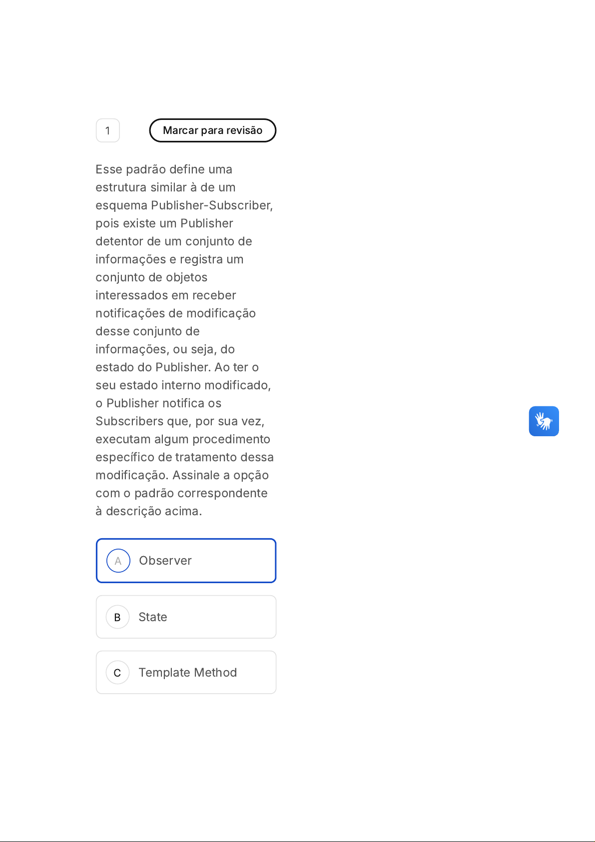 A B C 1 Marcar para revisão Esse padrão define uma estrutura similar à de um esquema Publisher-Subscriber, pois existe um Publisher detentor de um conjunto de informações e registra um conjunto de objetos interessados em receber notificações de modificação desse conjunto de informações, ou seja, do estado do Publisher. Ao ter o seu estado interno modificado, o Publisher notifica os Subscribers que, por sua vez, executam algum procedimento específico de tratamento dessa modificação. Assinale a opção com o padrão correspondente à descrição acima. Observer State Template Method D E A B C D E Strategy Visitor 2 Marcar para revisão "Esse padrão encapsula uma requisição em um objeto, desacoplando o requisitante e o objeto executor. Esse encapsulamento permite registrar o histórico de requisições, reproduzir essas requisições em outro ambiente, bem como implementar operações de desfazer ou refazer o processamento associado à requisição". Assinale a alternativa com o nome do padrão que possui esse propósito. Chain of Responsibility Command Mediator Iterator Template Method A B C D E 3 Marcar para revisão Você está desenvolvendo um sistema para acompanhar as cotações da bolsa de valores. As cotações podem ser acompanhadas na interface com usuário na forma textual (ticker da ação e o seu valor) e na forma de um gráfico de candlesticks, apresentando o histórico das cotações em um período do tempo. As duas formas de visualização devem estar em sincronia com as variações que ocorrem com o valor da cotação das ações. Assinale a alternativa com o nome do padrão que pode ser aplicado para resolver esse problema de sincronização de visualizações de um conjunto de informações com a sua fonte. Strategy State Iterator Observer Mediator A B C 4 Marcar para revisão "Na implementação de um processo complexo, um módulo A chama operações de um módulo B e de um módulo C. B, por sua vez, chama operações de C e de D. O módulo C chama operações de A e de E. O módulo D chama operações dos módulos B e C". Esse cenário ilustra uma interação entre objetos no estilo muitos para muitos. Para simplificar esse processo, define-se um objeto que centraliza todas as interações entre esses objetos, de modo que eles passam a se comunicar apenas com esse elemento central. Dessa forma, o elemento central X passa a receber uma notificação de A, para então chamar operações de B e C. Da mesma maneira, a partir de uma notificação enviada por B, X chama operações de C e de D. Essa descrição corresponde à estrutura de solução de qual padrão? Chain of Responsibility Strategy Visitor -- hora : -- min : -- seg Exibir Questão 5 de 10 Respondidas (10) Em branco (0) Finalizar prova 1 2 3 4 5 6 7 8 9 10 SM2 Padrões De Projetos De Software Com… D E A B C Template Method Mediator 5 Marcar para revisão Assinale a alternativa com uma afirmativa correta sobre o padrão GRASP Variações Protegidas. O padrão Variações Protegidas sugere proteger o sistema de variações concentrando a lógica dessas variações em um módulo controlador. O padrão Variações Protegidas sugere identificar pontos do sistema propensos a variações e isolá-los em um módulo com coesão lógica. O padrão Variações Protegidas sugere proteger o sistema de variações por meio de parâmetros definidos em uma classe com acesso global. D E A B O padrão Variações Protegidas sugere proteger as variações de algoritmos sensíveis por meio do uso de recursos de criptografia. O padrão Variações Protegidas sugere identificar pontos do sistema propensos a variações e isolá-los com a criação de interfaces no seu entorno. 6 Marcar para revisão Um módulo X escreve dados em uma tabela de um banco de dados relacional que é lida por um módulo Y. Se o desenvolvedor responsável pelo módulo X resolver mudar algo no esquema dessa tabela, será preciso avaliar o impacto dessa mudança em Y. Esse fato evidencia a existência de um acoplamento de que natureza entre os módulos X e Y? Acoplamento Global Acoplamento de Estrutura gabarito correto alexander.alves Realce C D E A B C Acoplamento de Dados Acoplamento Externo Acoplamento de Controle 7 Marcar para revisão Assinale a alternativa que apresenta os níveis de acoplamento entre módulos ordenados do mais baixo para o mais alto: Dados - Estrutura - Externo - Controle - Conteúdo - Global Dados - Controle - Estrutura - Externo - Conteúdo - Global Estrutura - Dados - Controle - Conteúdo - Global - Externo D E A B C Dados - Estrutura - Controle - Externo - Global - Conteúdo Estrutura - Dados - Controle - Global - Externo - Conteúdo 8 Marcar para revisão Uma mudança essencial no modelo de programação Java, com a evolução do JEE, foi o uso de anotações nas diversas tarefas de configuração dos EJBs do aplicativo. Para que serve a anotação Local no ambiente de criação de EJBs? Definir um Stateless Session Bean. Definir um contexto de persistência local para o Session Bean. Definir a interface de acesso às entidades do JPA. D E A B C D E Definir um Stateful Session Bean. Definir a interface de acesso local ao pool de EJBs. 9 Marcar para revisão A arquitetura MVC (Model, View e Controller) é utilizada de forma ampla na criação de sistemas cadastrais e caracteriza-se pela divisão do sistema em três camadas, com objetivos específicos. Considerando a divisão utilizada pelo MVC, a interface de usuário e o componente DAO estariam, respectivamente, nas camadas: View e Model. Controller e Model. View e Controller. Model e View. Model e Controller. A B C 10 Marcar para revisão Em uma aplicação corporativa Java EE seguindo a arquitetura MVC, as camadas são implementadas com tecnologias específicas: A camada Controller recebe requisições HTTP do usuário, coordena chamadas à camada de negócio e seleciona a View a ser exibida. A camada Model encapsula a lógica de negócio e pode interagir com