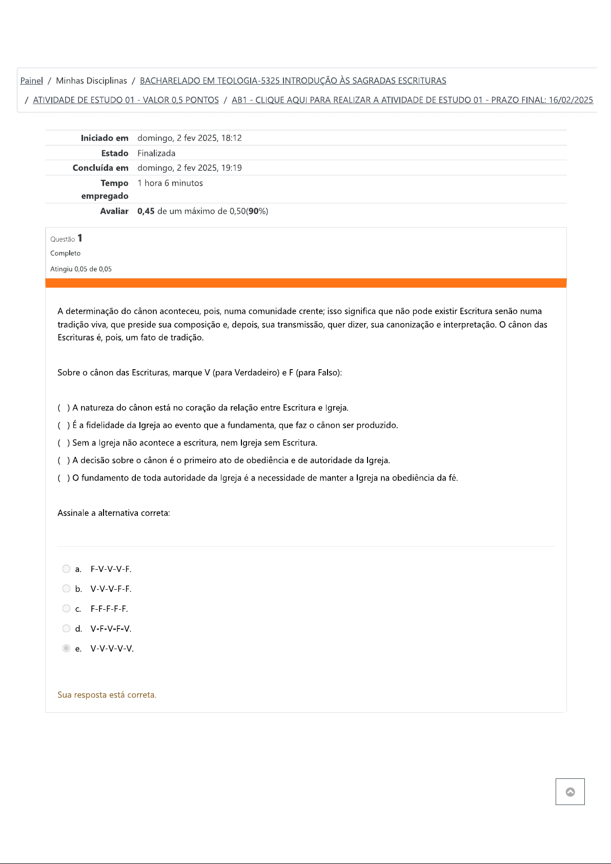 Painel / Minhas Disciplinas / BACHARELADO EM TEOLOGIA-5325 INTRODUÇÃO ÀS SAGRADAS ESCRITURAS / ATIVIDADE DE ESTUDO 01 VALOR 0,5 PONTOS / AB1 CLIQUE AQUI PARA REALIZAR A ATIVIDADE DE ESTUDO 01 PRAZO FINAL: 16/02/2025 Iniciado em domingo, 2 fev 2025, 18:12 Estado Finalizada Concluída em domingo, 2 fev 2025, 19:19 Tempo 1 hora 6 minutos empregado Avaliar 0,45 de um máximo de 0,50(90%) Questão 1 Completo Atingiu 0,05 de 0,05 A determinação do cânon aconteceu, pois, numa comunidade crente; isso significa que não pode existir Escritura senão numa tradição viva, que preside sua composição e, depois, sua transmissão, quer dizer, sua canonização e interpretação. O cânon das Escrituras é, pois, um fato de tradição. Sobre o cânon das Escrituras, marque V (para Verdadeiro) e F (para Falso): A natureza do cânon está no coração da relação entre Escritura e Igreja. É a fidelidade da Igreja ao evento que a fundamenta, que faz o cânon ser produzido. ( ) Sem a Igreja não acontece a escritura, nem Igreja sem Escritura. A decisão sobre o cânon é primeiro ato de obediência e de autoridade da Igreja. fundamento de toda autoridade da Igreja é a necessidade de manter a Igreja na obediência da fé. Assinale a alternativa correta: a. F-V-V-V-F. b. V-V-V-F-F. C. F-F-F-F-F. d. V-F-V-F-V. e. V-V-V-V-V. Sua resposta está correta.Questão 2 Completo Atingiu 0,05 de 0,05 A Igreja cristã possuía, desde o princípio de sua existência, um cânon das Escrituras inspiradas: o Antigo Testamento. Contudo, para a Igreja primitiva, este Antigo Testamento era, em seu sentido mais profundo, profecia de Cristo um reconhecimento de que, mesmo aqui, a autoridade última era o próprio Cristo. Nesse sentido, sobre a formação do cânon do Novo Testamento, assinale a alternativa correta: a. No tempo de Jesus, a autoridade da Escritura Hebraica era discutível e haviam muitas dúvidas quanto à sua inspiração divina. b. processo de formação do cânon do Novo Testamento foi breve e bem mais simples que do Antigo Testamento. C. Para os cristãos, a autoridade última e decisiva era o Antigo Testamento, que dava sustento a toda a Igreja nascente. d. Para os cristãos, não se encontra uma conexão entre a autoridade da Escritura hebraica e a autoridade da palavra de Jesus. e. A Igreja primitiva tinha três autoridades: o Antigo Testamento, o Senhor e os Apóstolos. Sua resposta está correta. Questão 3 Completo Atingiu 0,05 de 0,05 Com a destruição do Templo em 70 d.C. e o consequente desaparecimento da liturgia sacrifical, o judaísmo palestinense configura-se sempre mais como uma religião do Livro. Daí os esforços para definir com exatidão os componentes do Livro Sagrado. Sobre a definição do cânon do Antigo Testamento, assinale a alternativa correta: a. Da parte cristã, acolhimento e reconhecimento dos livros daquele que já é chamado de Antigo Testamento passa através de mediação da Vulgata, tradução feita da Bíblia hebraica para grego. b. A corrente farisaica foi muito importante na colocação do livro no centro do judaísmo, tornando sua expressão mais significativa. C. No período em questão, as discussões sobre o cânon concentram-se especialmente em relação ao Pentateuco. d. A Igreja cristã se desenvolveu na diáspora, que faz, na prática, a Bíblia da Igreja ser a Bíblia hebraica. e. judaísmo definiu seu cânon com um pronunciamento oficial feito no início do século III d.C. Sua resposta está correta.Questão 4 Completo Atingiu 0,05 de 0,05 A aceitação dos livros deuterocanônicos não foi pacífica e imediata, como mostra um debate que se prolonga até quase o século VIII. Se, no Oriente, Orígenes, Atanásio e Cirilo de Jerusalém optam pelo cânon breve dos hebreus, no Ocidente, Agostinho defende valorosamente o cânon longo, contra um Jerônimo defensor da veritas hebraica. Sobre a formação do cânon do Antigo Testamento, analise as afirmativas a seguir: I. A circulação dos livros apócrifos judaicos que reivindicavam canonicidade, exigia um exame cuidadoso de todos os livros que buscavam ser reconhecidos como inspirados. II. Na controvérsia com os judeus, a fim de ter uma base comum de argumentação, os Padres Orientais se restringiam ao cânon judaico aceito. III. A Igreja primitiva, ao aceitar as Escrituras hebraicas, não só aceita os livros deuterocanônicos, mas opta por uma estrutura nova do elenco dos livros, separando os livros históricos dos proféticos. IV. Os cristãos acentuam o caráter de profecia cristológica e de introdução ao evento Jesus aos Livros Proféticos. Assinale a alternativa correta: a. Estão corretas somente as afirmativas e IV. b. Estão corretas somente as afirmativas e II. C. Estão corretas somente as afirmativas e III. d. Estão corretas somente as afirmativas III e IV. e. Estão todas corretas. Sua resposta está correta.Questão 5 Completo Atingiu 0,05 de 0,05 A determinação dos livros canônicos não aconteceu de maneira fácil e automática, mas exigiu uma longa caminhada e, por vezes, difícil; a terminologia é variada. Quando comparamos as versões católicas e protestantes do Antigo Testamento, verificamos que as últimas enumeram 39 livros como a Bíblia hebraica enquanto as católicas aceitam 45 livros. Sobre a determinação dos livros canônicos, analise as seguintes afirmativas: I. Protocanônicos são os livros que foram reconhecidos como canônicos desde o início e sem nenhuma discussão. II. Deuterocanônicos são os livros cuja canonicidade foi objeto de contestação e reconhecida mais tarde. III. Apócrifos são os livros que fazem parte do cânon, mas ainda conservam algumas dúvidas em relação à sua inspiração divina. IV. Os livros deuterocanônicos são considerados livros de uma menor autoridade bíblica, pois trazem em seu conteúdo dúvidas quanto à sua inspiração. Assinale a alternativa correta: a. Estão corretas somente as afirmativas e IV. b. Estão corretas 