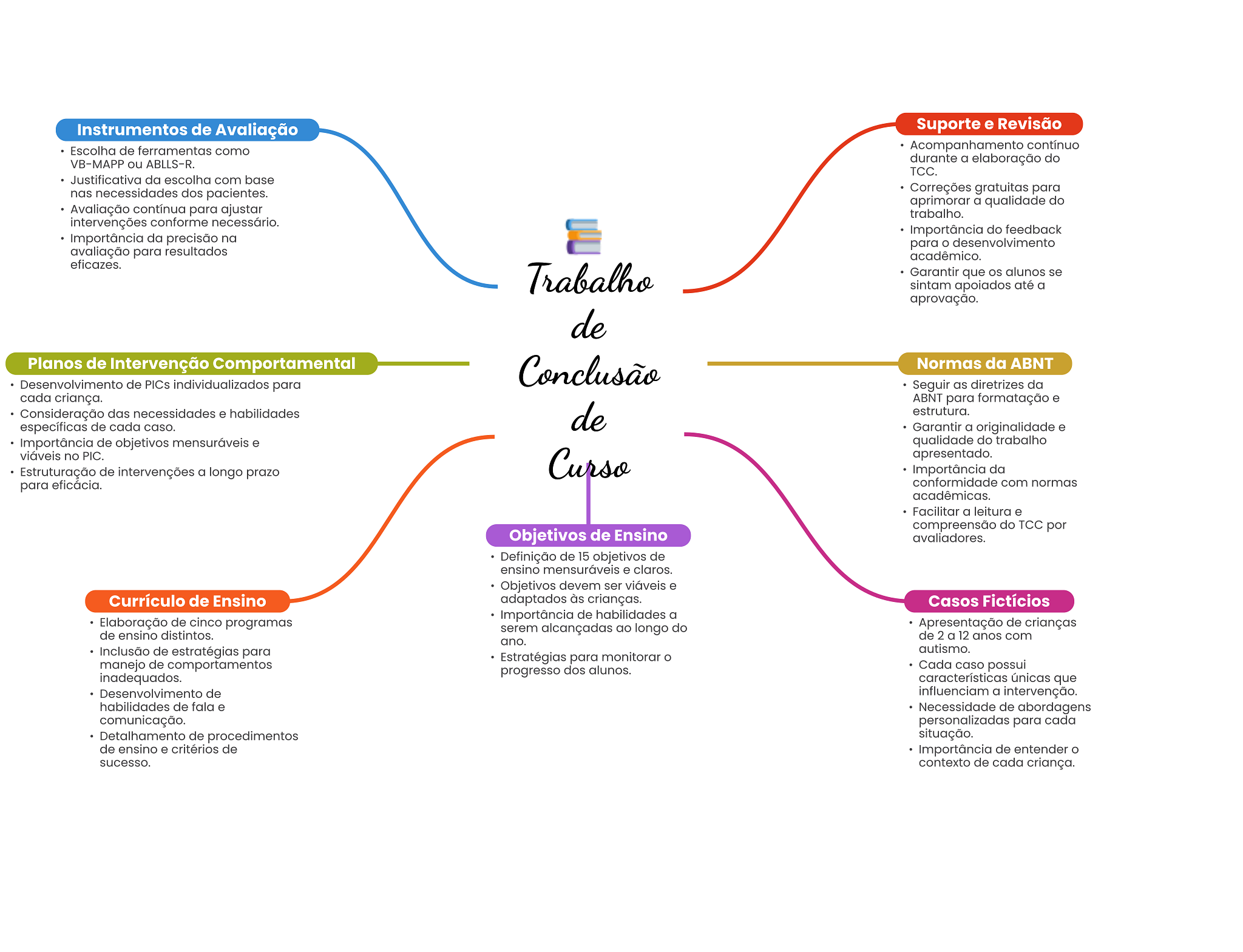 Instrumentos de Avaliação Suporte e Revisão Escolha de ferramentas como Acompanhamento contínuo VB-MAPP ou ABLLS-R. durante a elaboração do TCC. Justificativa da escolha com base nas necessidades dos pacientes. Correções gratuitas para aprimorar a qualidade do Avaliação contínua para ajustar trabalho. intervenções conforme necessário. Importância do feedback Importância da precisão na para desenvolvimento avaliação para resultados acadêmico. eficazes. Trabalho Garantir que alunos se sintam apoiados até a aprovação. de Planos de Intervenção Comportamental Conclusão Normas da ABNT Desenvolvimento de PICs individualizados para Seguir as diretrizes da cada criança. ABNT para formatação e Consideração das necessidades e habilidades de estrutura. específicas de cada caso. Garantir a originalidade e Importância de objetivos mensuráveis e qualidade do trabalho viáveis no PIC. Curso apresentado. Estruturação de intervenções a longo prazo Importância da para eficácia. conformidade com normas acadêmicas. Facilitar a leitura e compreensão do TCC por Objetivos de Ensino avaliadores. Definição de 15 objetivos de ensino mensuráveis e claros. Objetivos devem ser viáveis e Currículo de Ensino adaptados às crianças. Casos Fictícios Importância de habilidades a Elaboração de cinco programas de ensino distintos. serem alcançadas ao longo do Apresentação de crianças de 2 a 12 anos com ano. Inclusão de estratégias para autismo. Estratégias para monitorar manejo de comportamentos progresso dos alunos. Cada caso possui inadequados. características únicas que Desenvolvimento de influenciam a intervenção. habilidades de fala e Necessidade de abordagens comunicação. personalizadas para cada Detalhamento de procedimentos situação. de ensino e critérios de Importância de entender sucesso. contexto de cada criança.